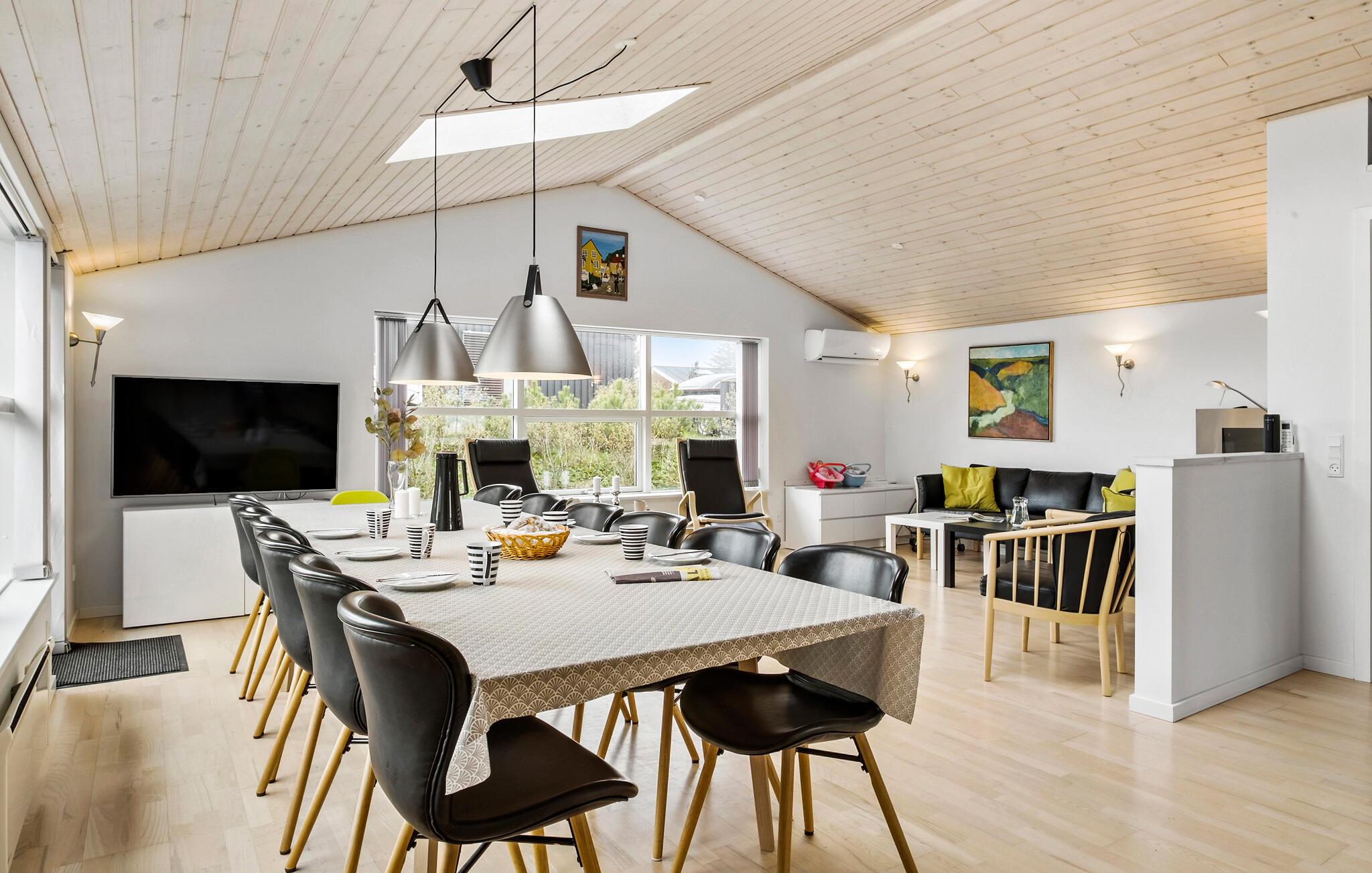 Dette rummelige feriehus er oplagt til en ferie for flere generationer eller børnefamilier. Det ligger i Lønstrup på den nordjyske vestkyst og har masser af plads både inde og ude til samvær og alenestunder. Find jer til rette i den lyse opholdsstue med store vinduer og åben loftskonstruktion. Brug sofahjørnet til afslappende timer ved brændeovnen eller Slå jer ned til rette omkring det lange spisebord. Hyg jer med at lave ferieretterne sammen i køkkenet, hvor der er god plads og albuerum.