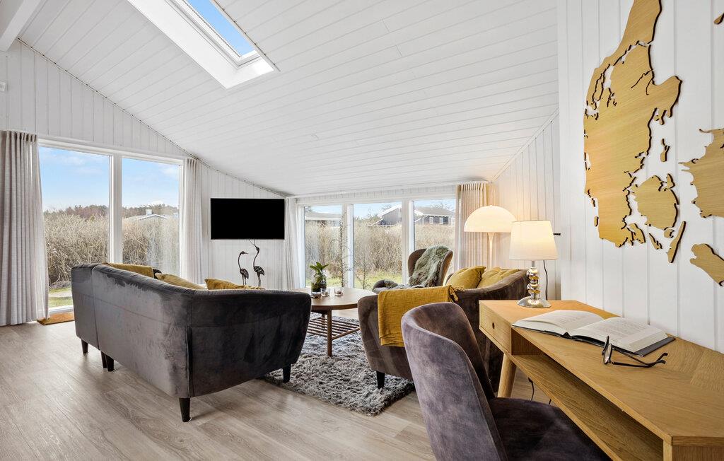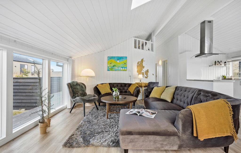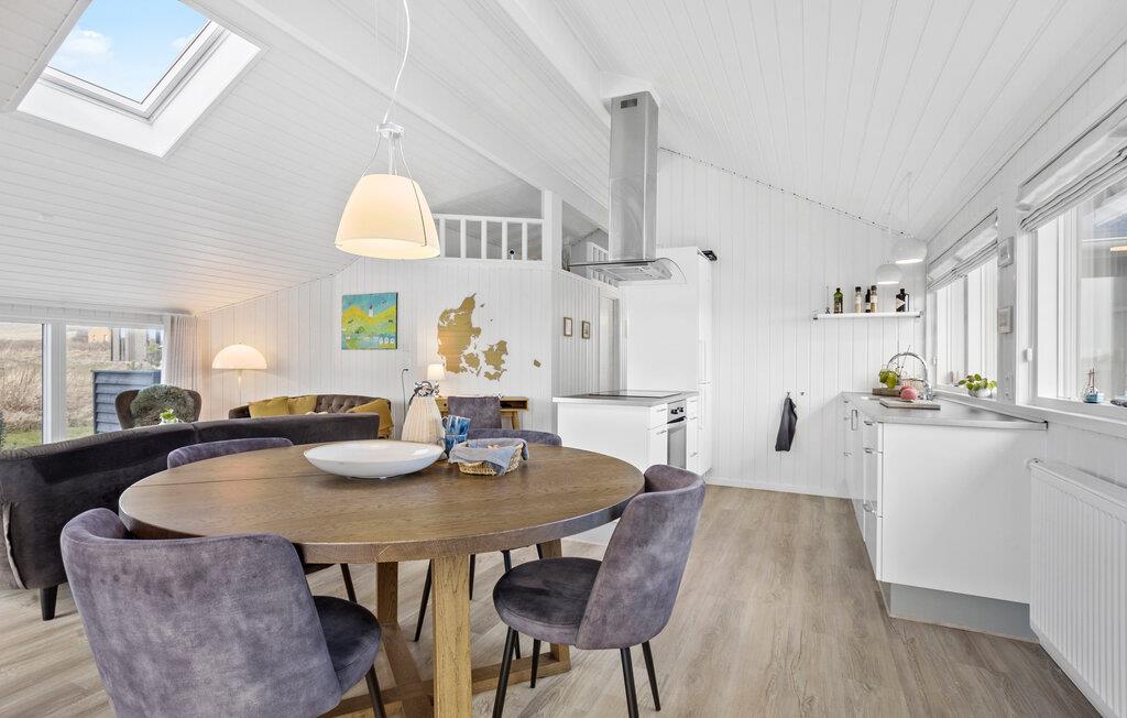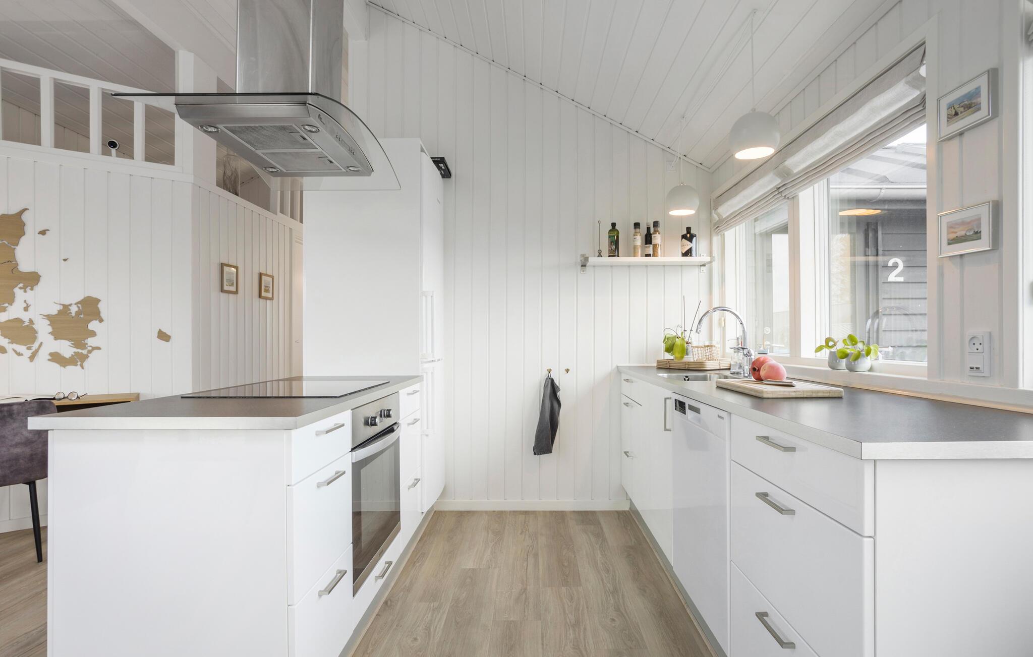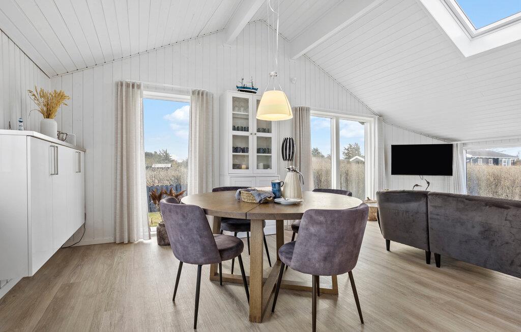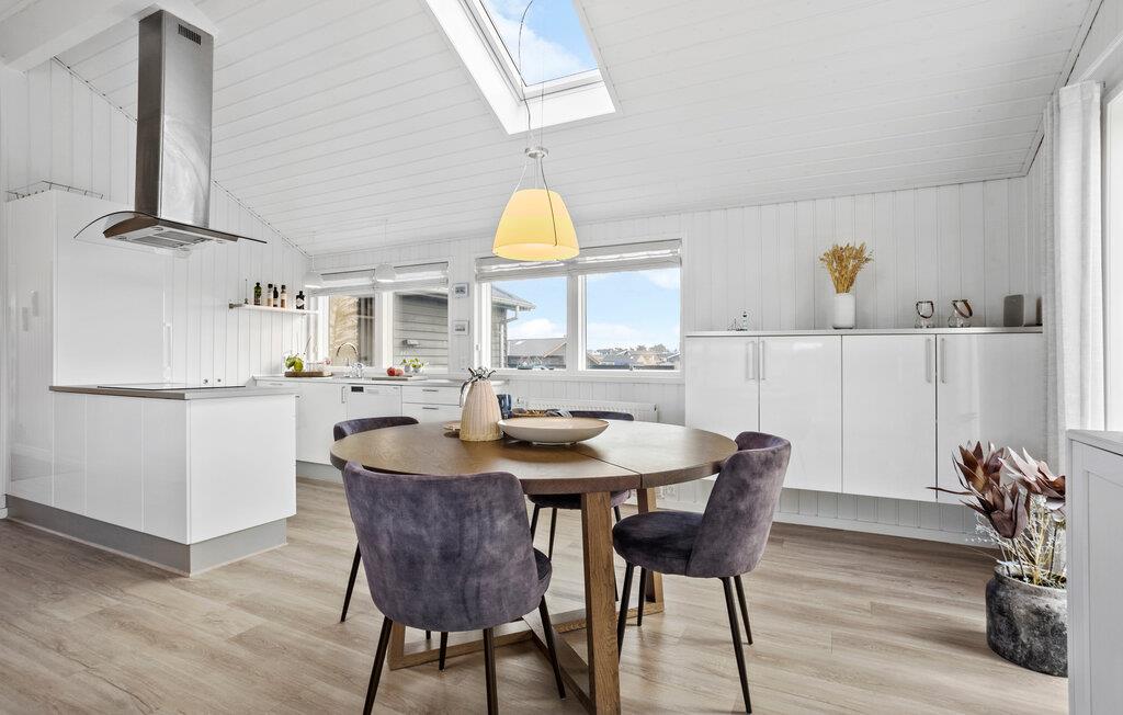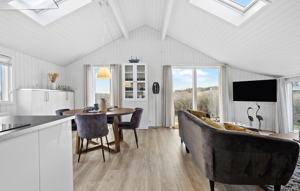 Dette sommerhus giver jer det ideelle udgangspunkt for en afslappet og varieret ferie. Her finder I alt hvad I skal bruge til en vellykket pause, uanset om I foretrækker rolige timer i huset eller at gå på opdagelse i området. Lad dagen starte afslappet og nyd en friskbrygget kop kaffe i det åbne køkken. I kan diskutere jeres planer for dagen rundt om det elegante spisebord. Den rummelige stue med komfortabelt sofaområde lægger op til at hygge med bøger og brætspil efter dagens oplevelser. De store vinduespartier lukker masser af dagslys ind i boligen, hvilket skaber en lys og venlig atmosfære.