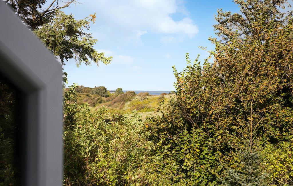 Moderne sommerhus ved Vesterhavet med havudsigt, spabad, brændeovn og stor have nær strand og natur.