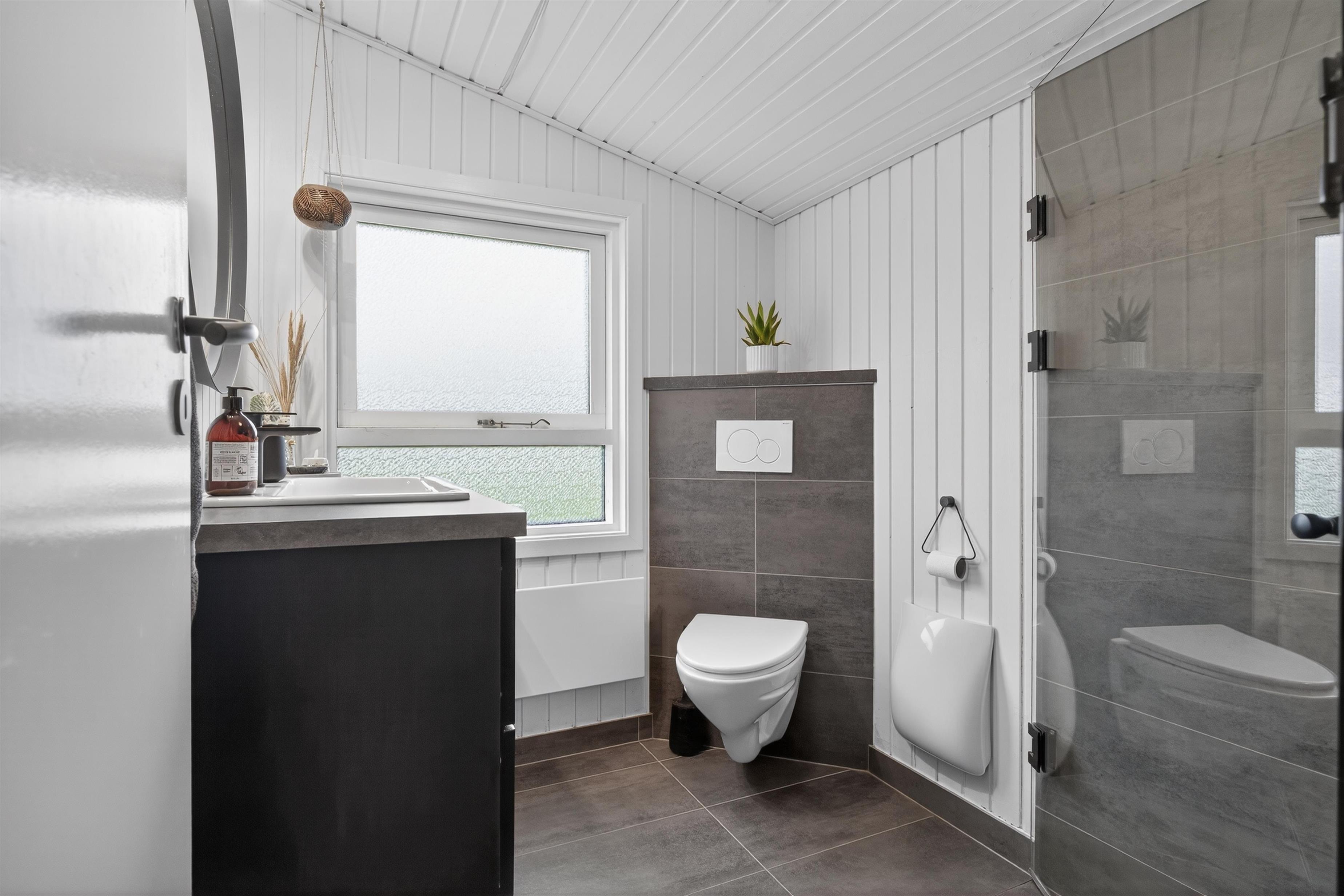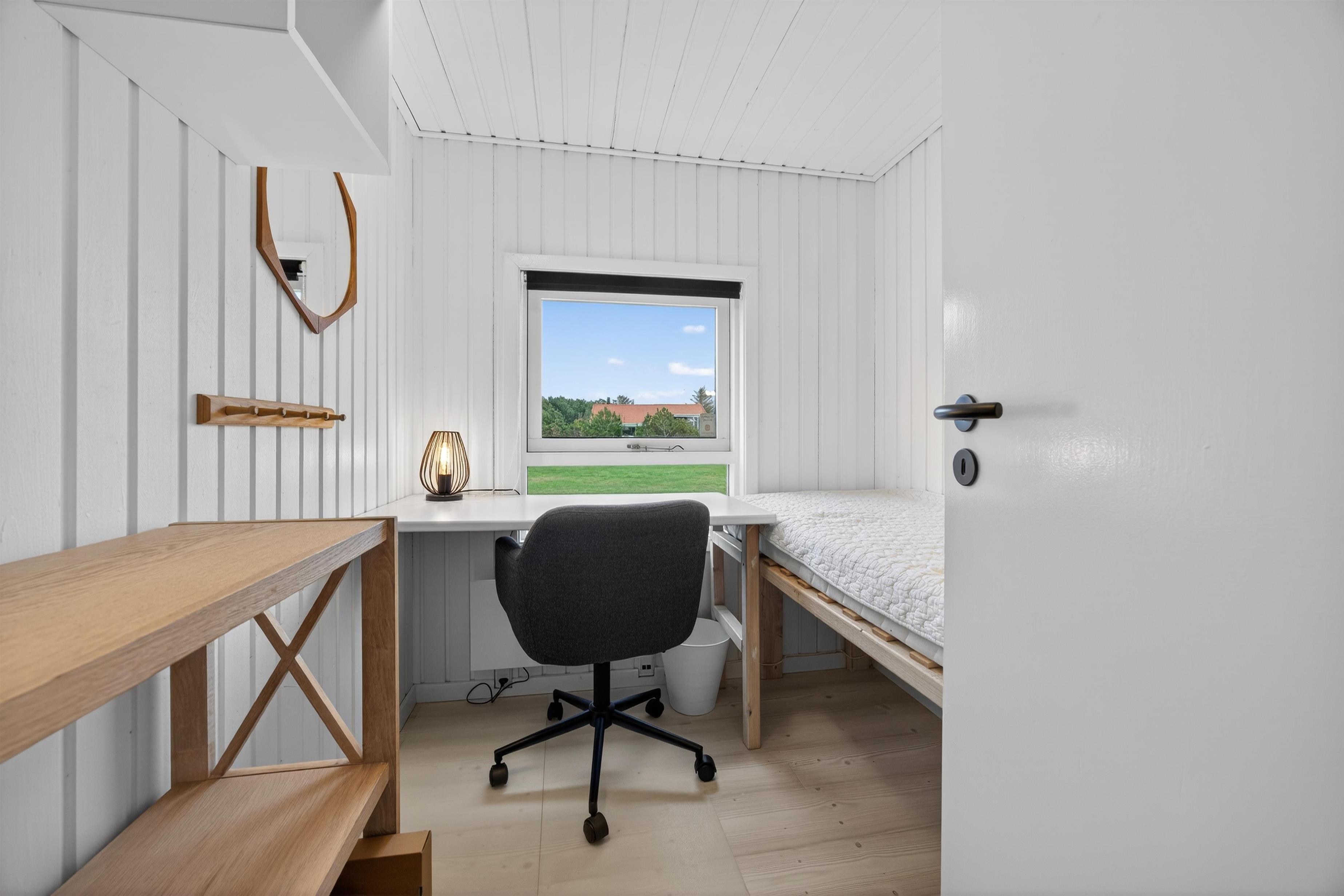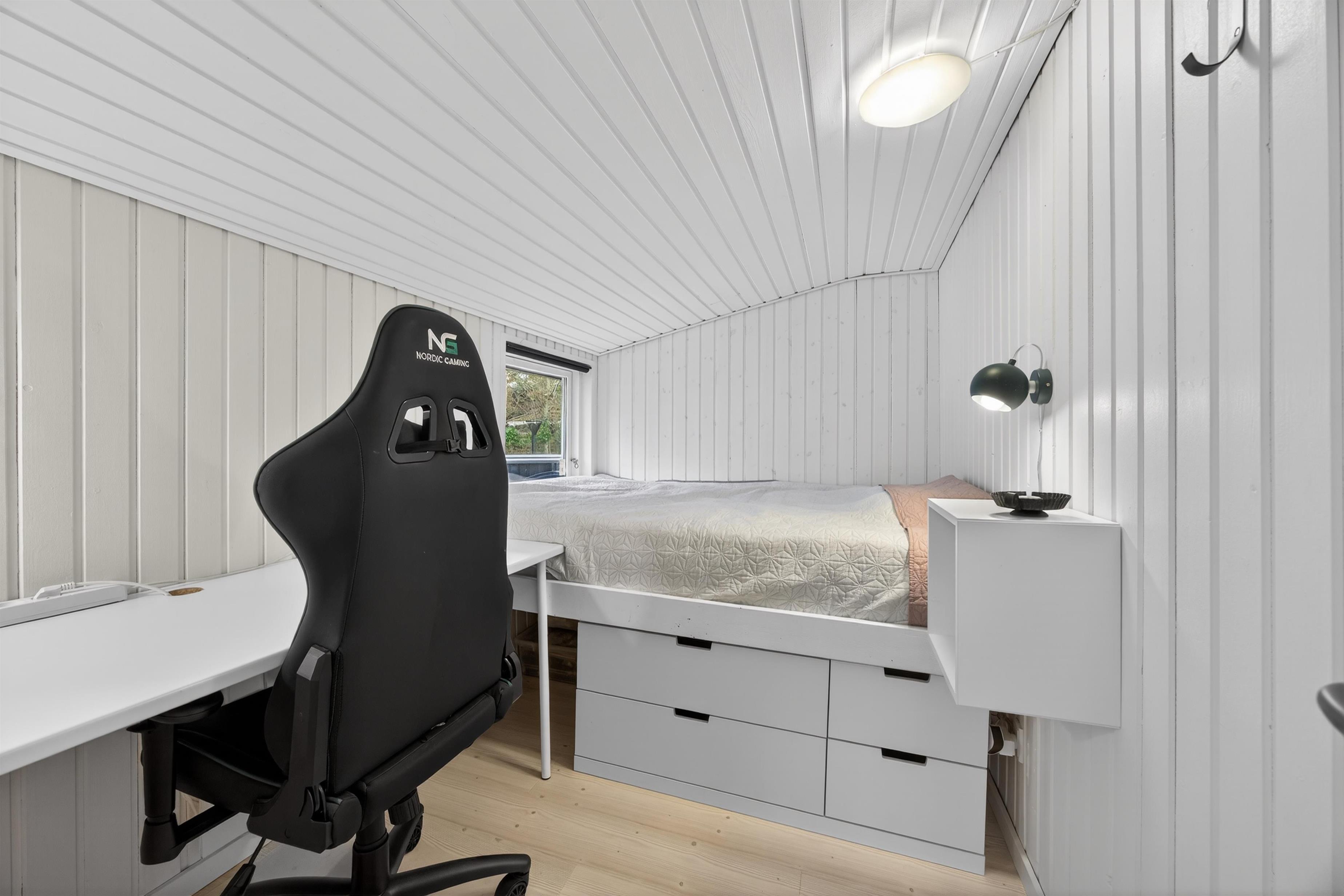 Indvendigt rummer sommerhuset to dejlige og rummelige soveværelser samt et lille legeværelse/hyggeværelse, perfekt til børn eller afslapning. Badeværelset er flot og moderne med bruseniche og behagelig gulvvarme.