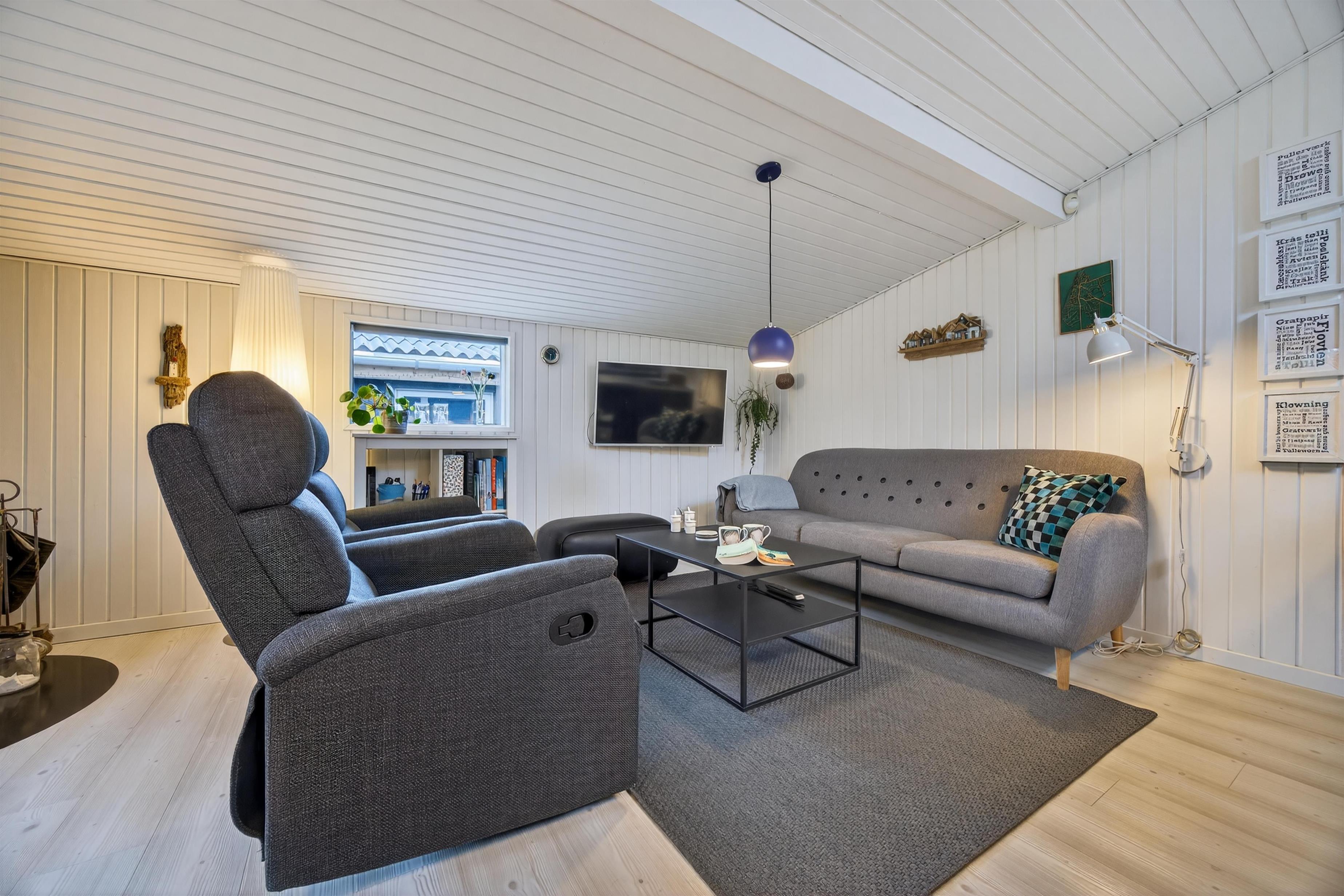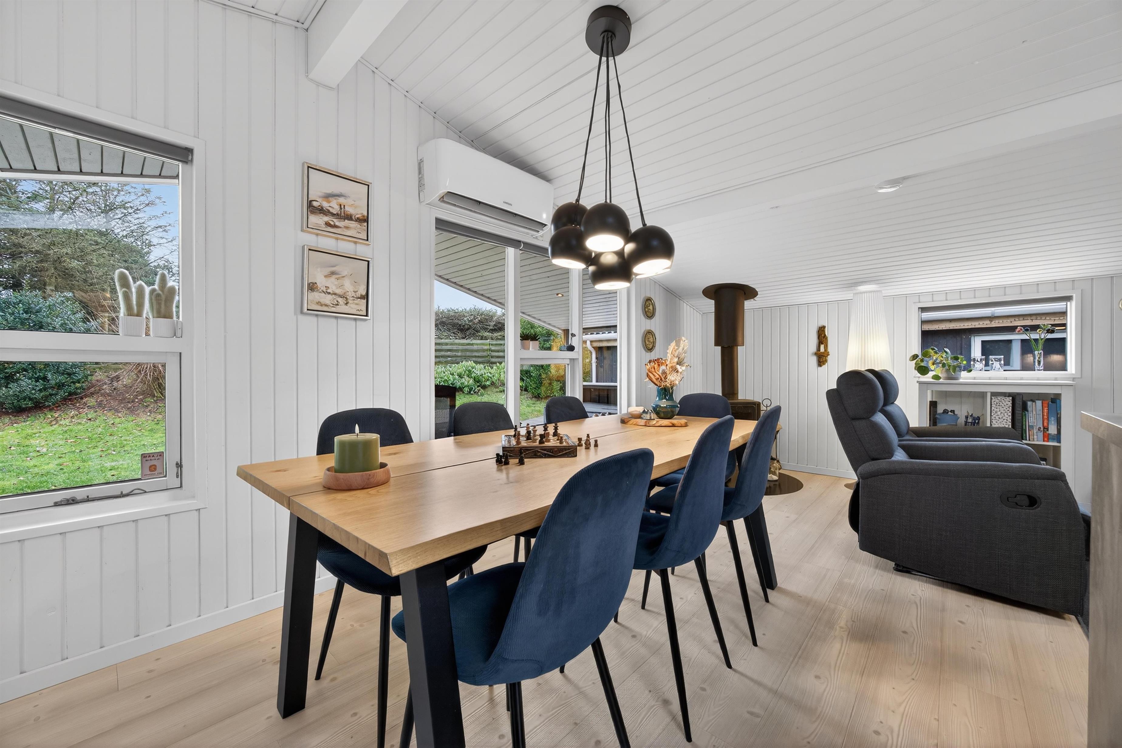 Det hyggelige sofahjørne indbyder til afslapning, mens brændeovnen spreder varme og stemning på kølige aftener. Huset opvarmes desuden energivenligt med varmepumpe.