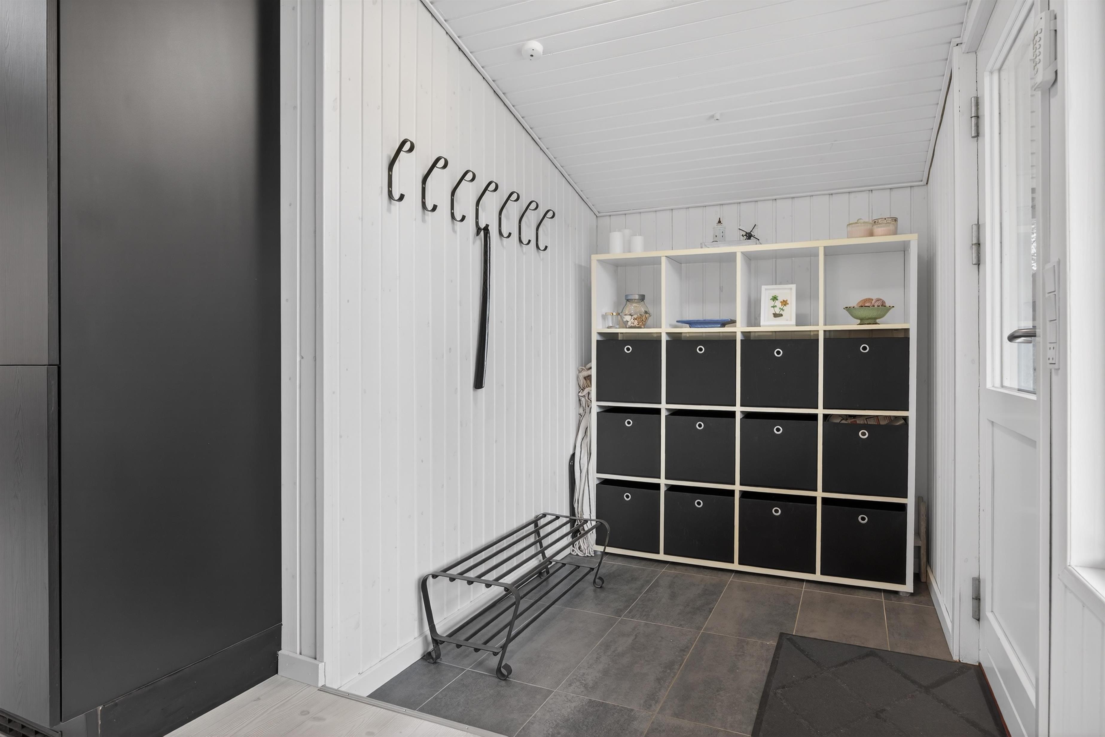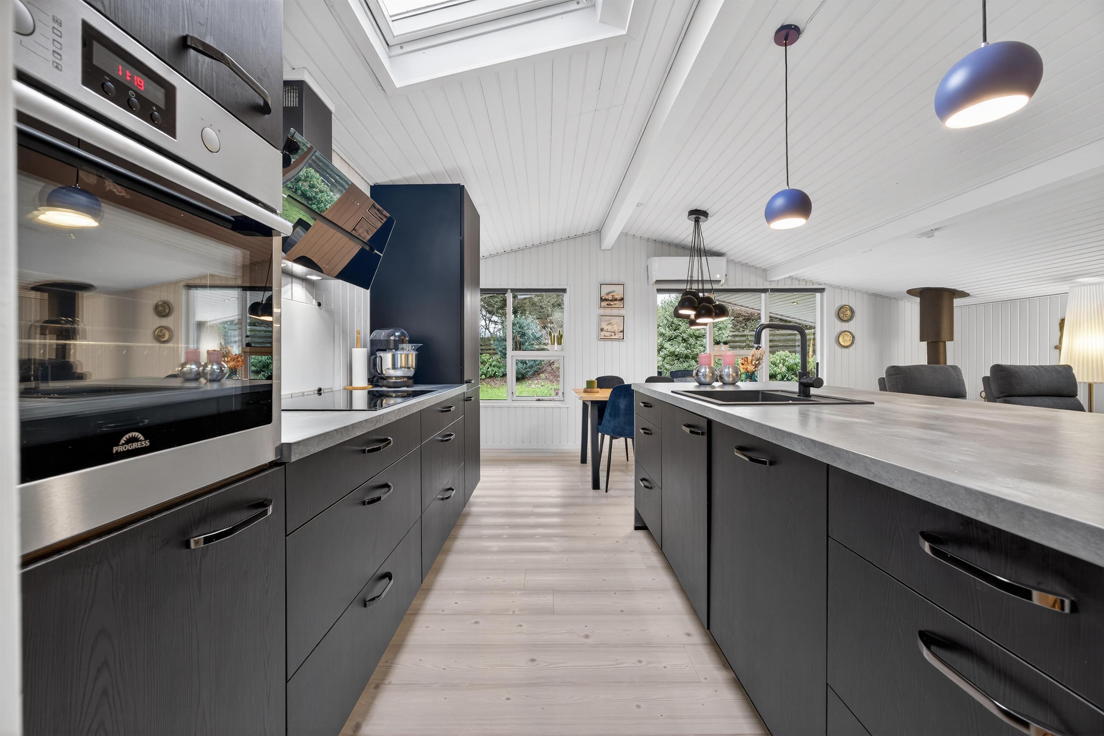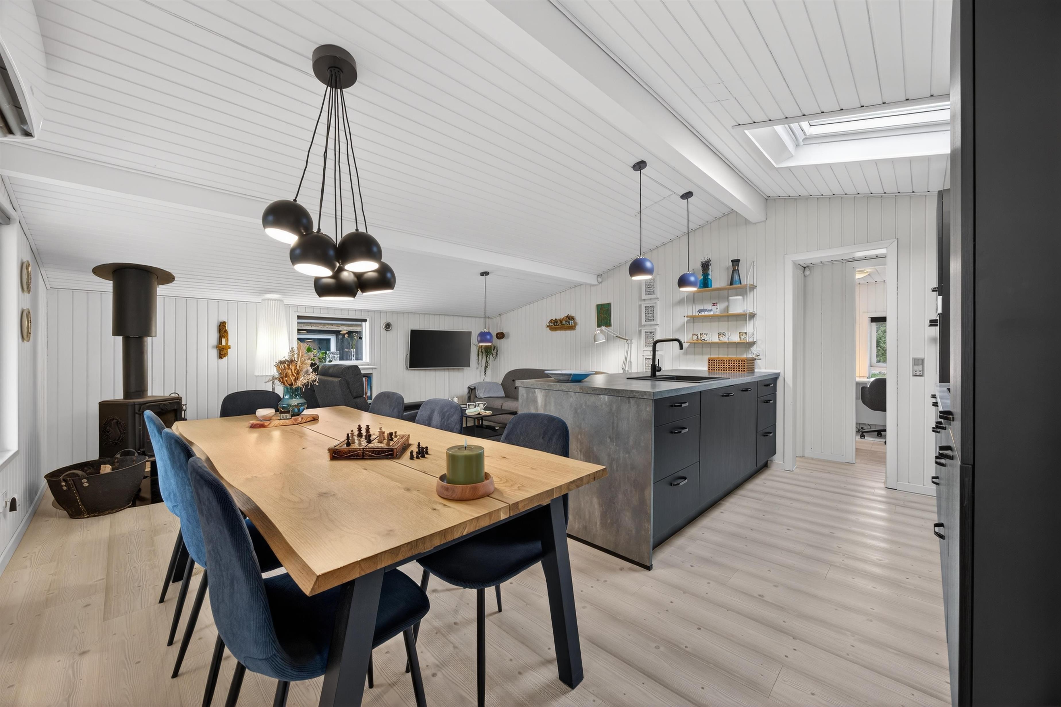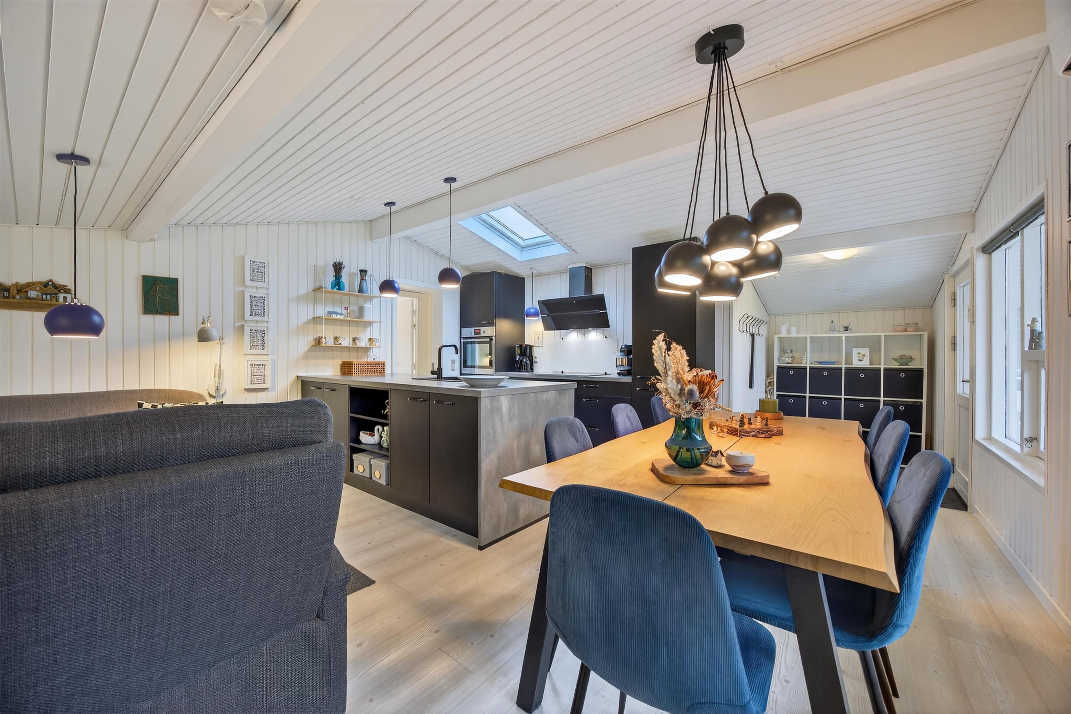 Feriehuset byder velkommen med en fin entré med plads til sko og jakker. Herfra træder du ind i det indbydende køkken-alrum, hvor ferielivet naturligt udspiller sig. Køkkenet er veludstyret og har alt, hvad der behøves til en vellykket ferie – uanset om menuen står på hurtige frokoster eller hyggelige middage.