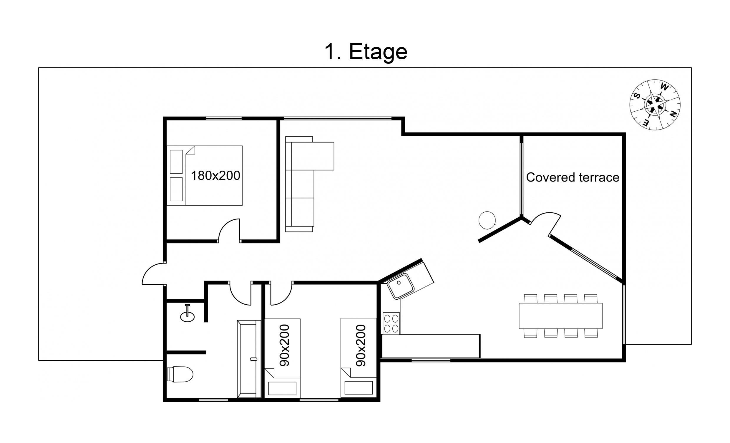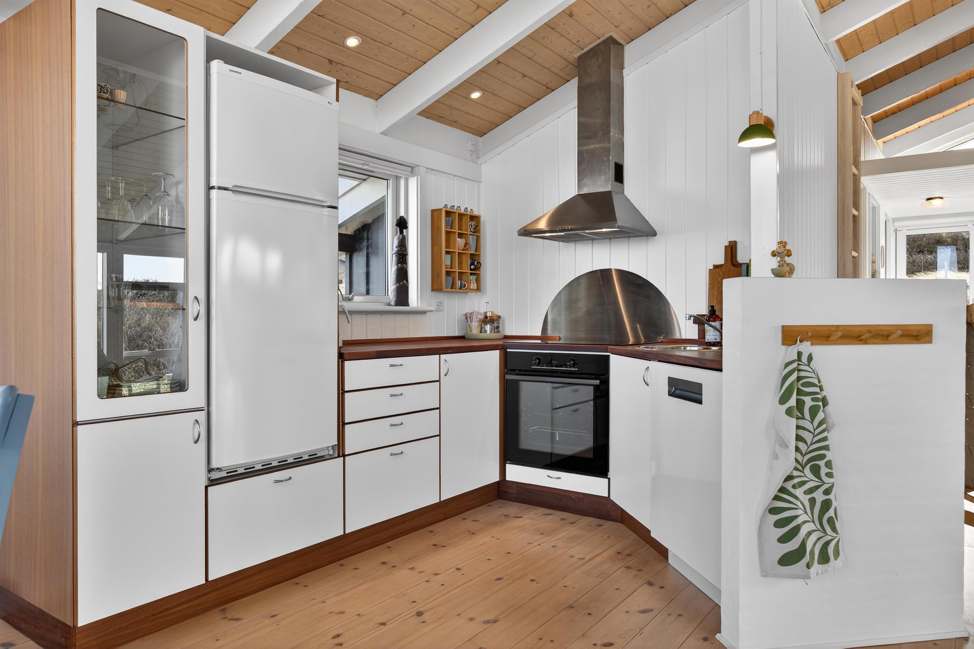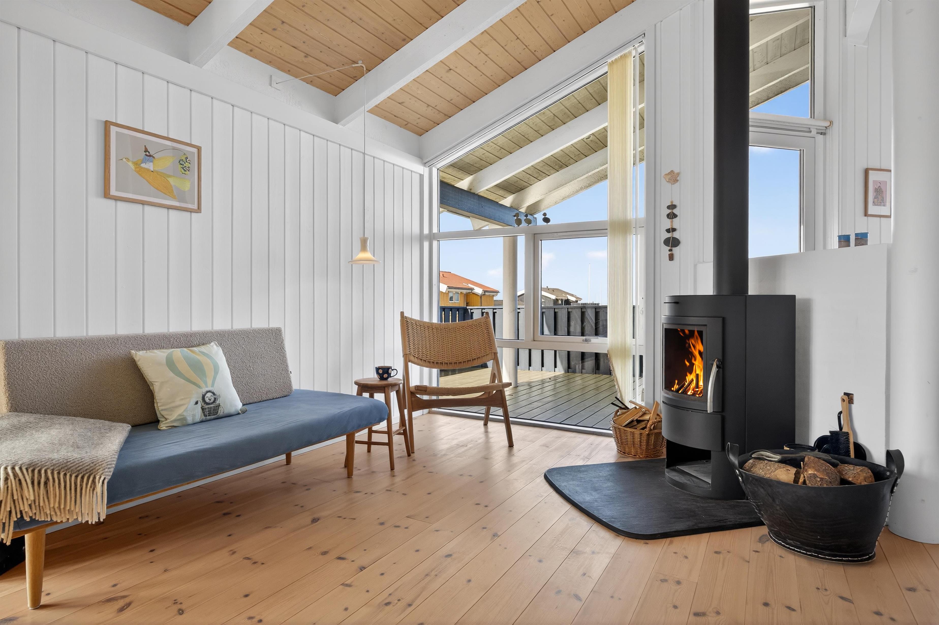Køkkenet ligger i åben forbindelse med spisepladsen og indeholder alt, hvad I behøver for at tilberede gode feriemåltider. Når vinden rusker udenfor på køligere dage, kan I tænde op i brændeovnen og nyde den hyggelige varme og den knitrende ild efter en lang dag ved stranden.