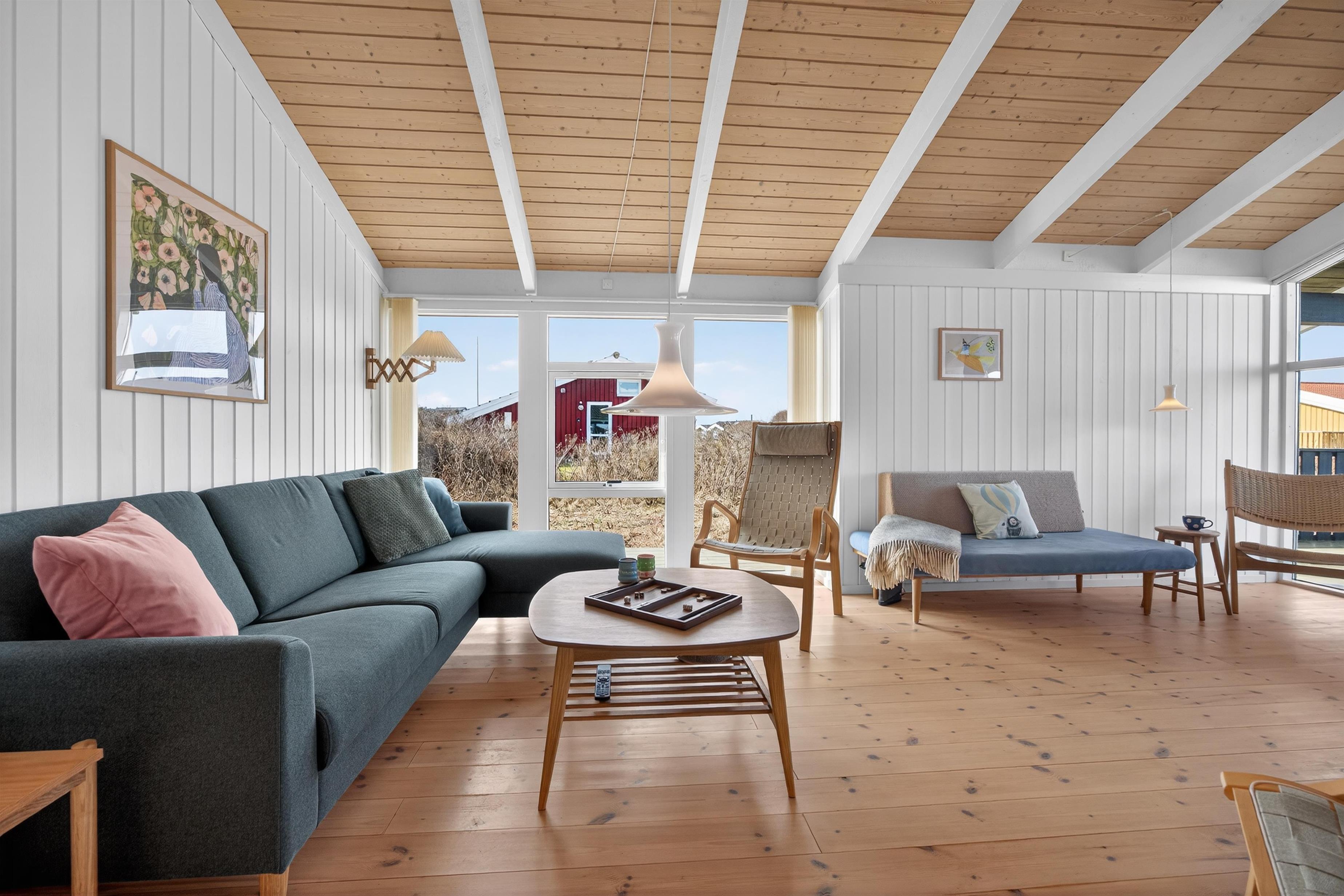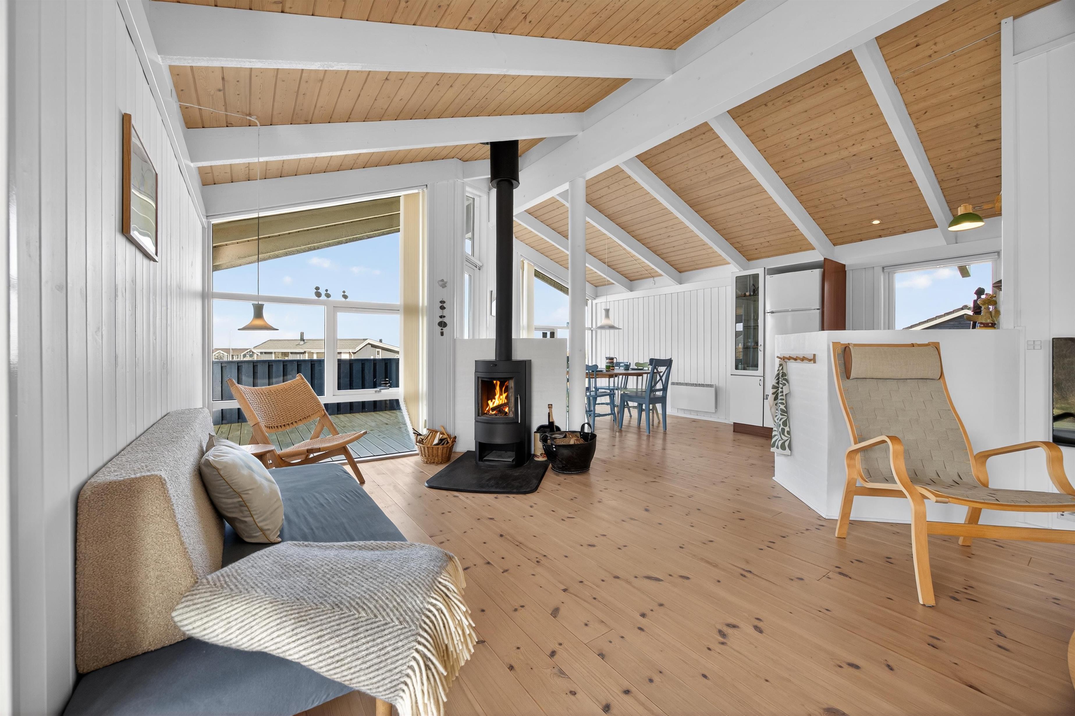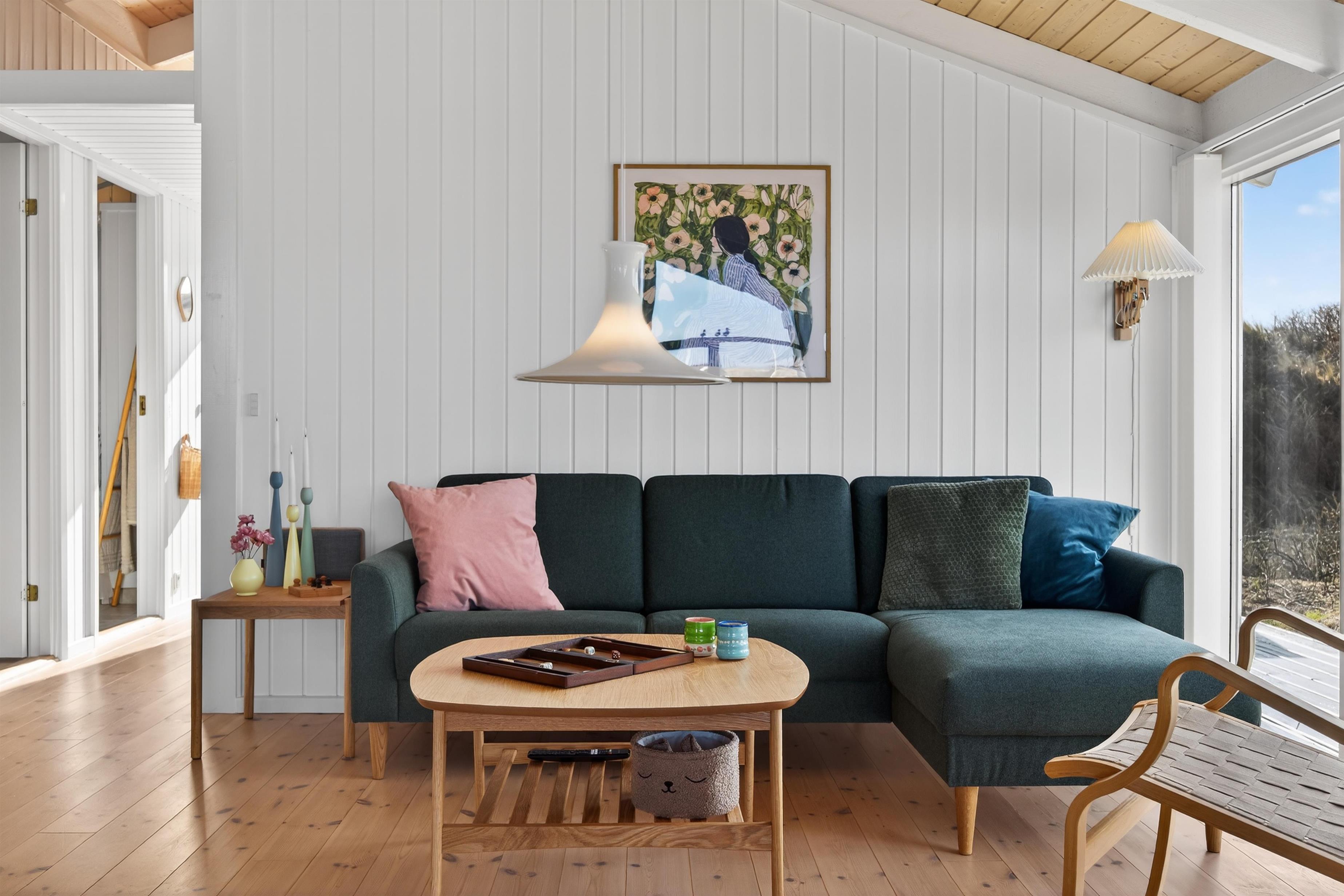 Husets hjerte er det store opholdsrum med loft til kip og store vinduespartier, der lukker masser af lys og natur ind. Herfra kan I nyde den fantastiske udsigt over klitterne og de små sommerhuse, med det maleriske Vesterhav i baggrunden. På klare aftener kan I opleve nogle af Vestkystens smukkeste solnedgange direkte fra stuen.
