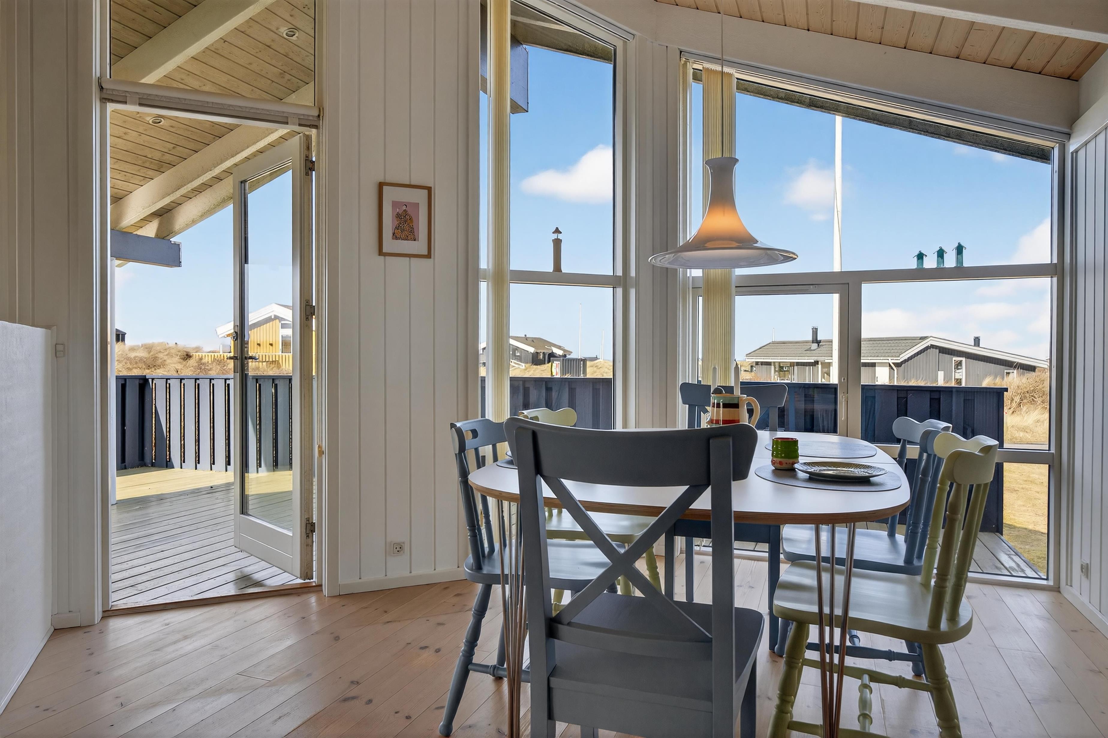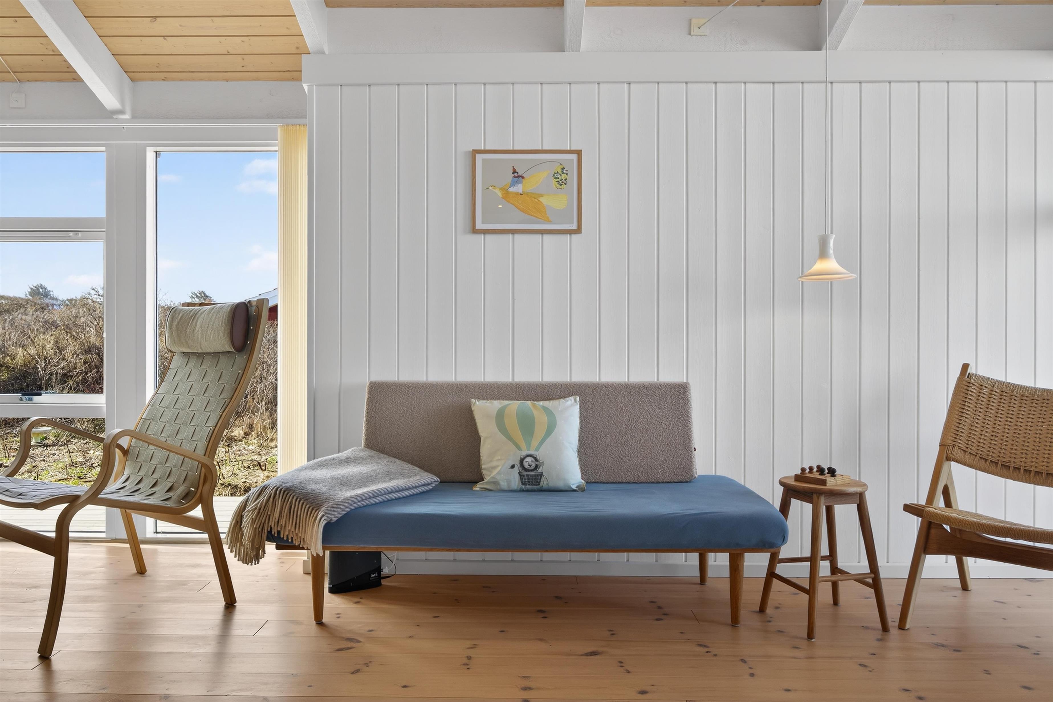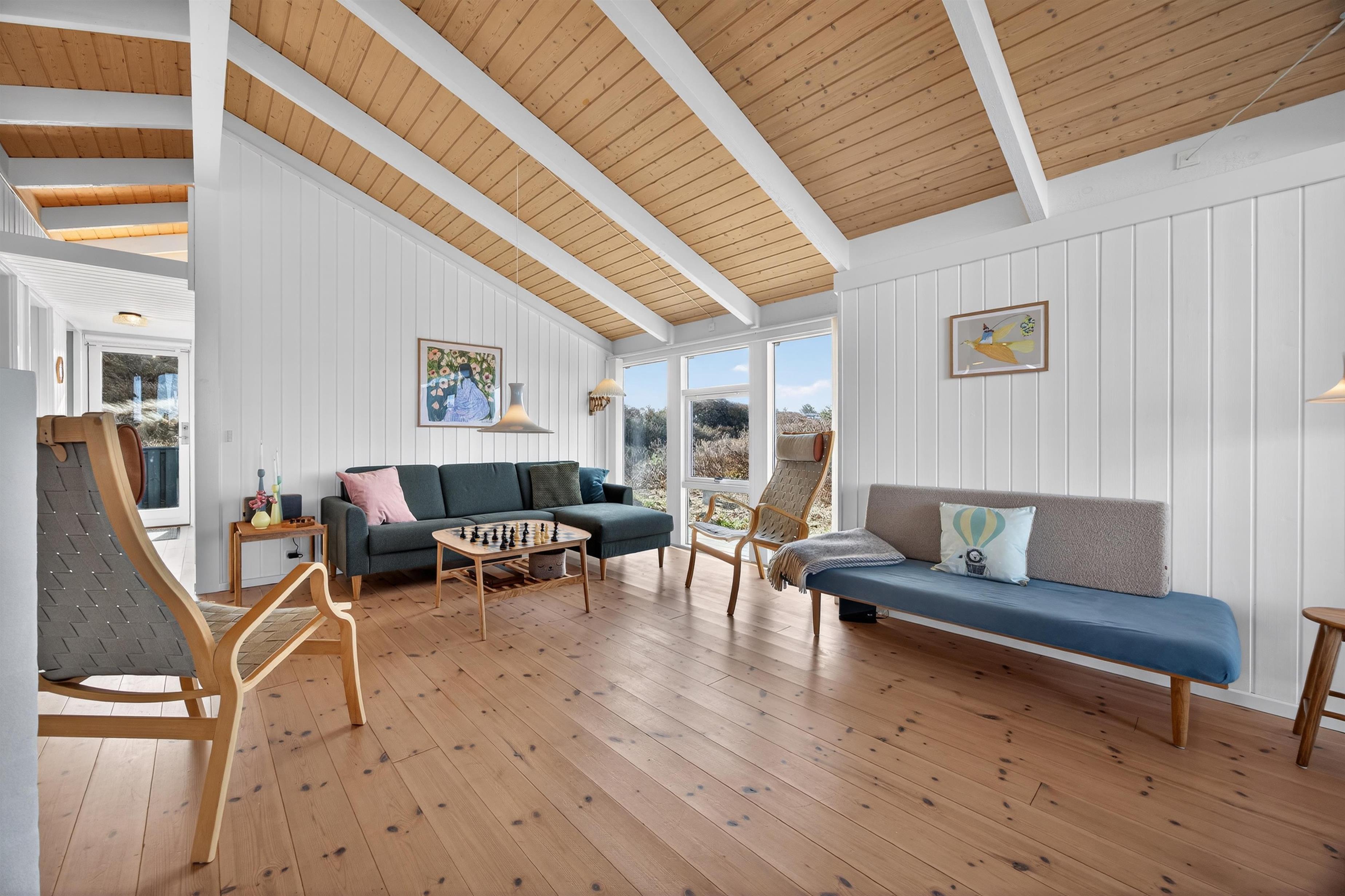 Husets hjerte er det store opholdsrum med loft til kip og store vinduespartier, der lukker masser af lys og natur ind. Herfra kan I nyde den fantastiske udsigt over klitterne og de små sommerhuse, med det maleriske Vesterhav i baggrunden. På klare aftener kan I opleve nogle af Vestkystens smukkeste solnedgange direkte fra stuen.