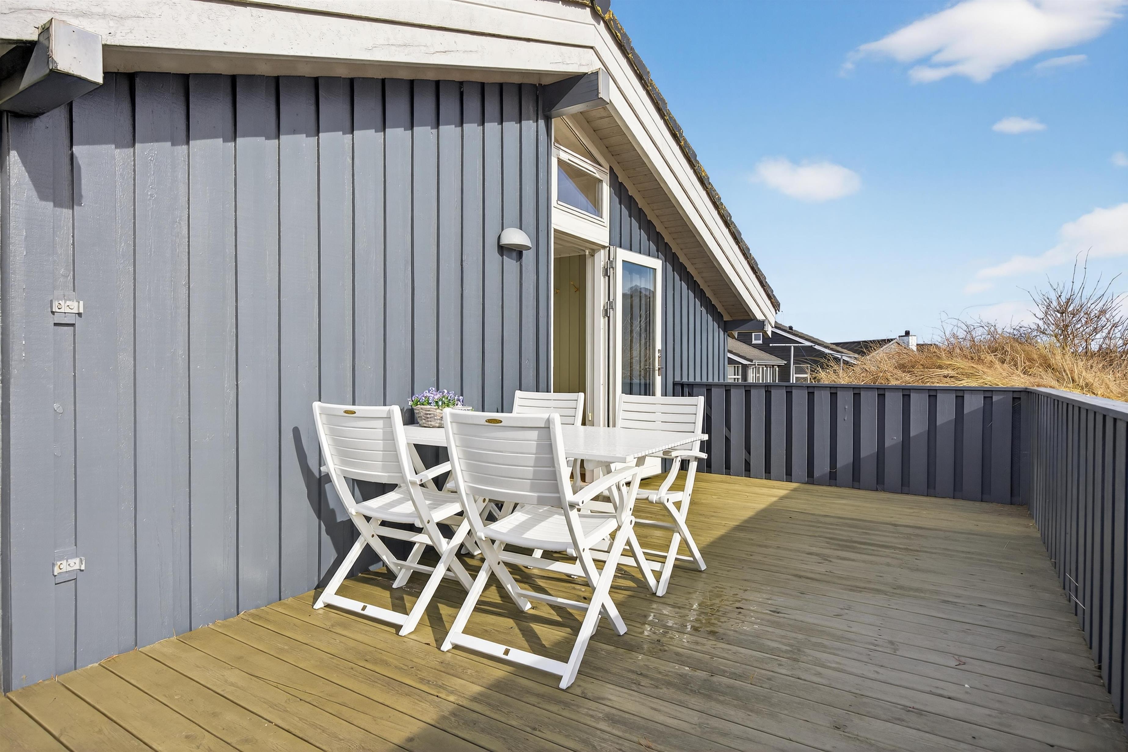 Foran huset finder I en stor overdækket terrasse – det perfekte sted til en hyggelig middag, mens solen stille går i horisonten. Kombinationen af udsigt, natur og den friske havluft skaber en helt særlig stemning af afslapning ved Vestkysten.