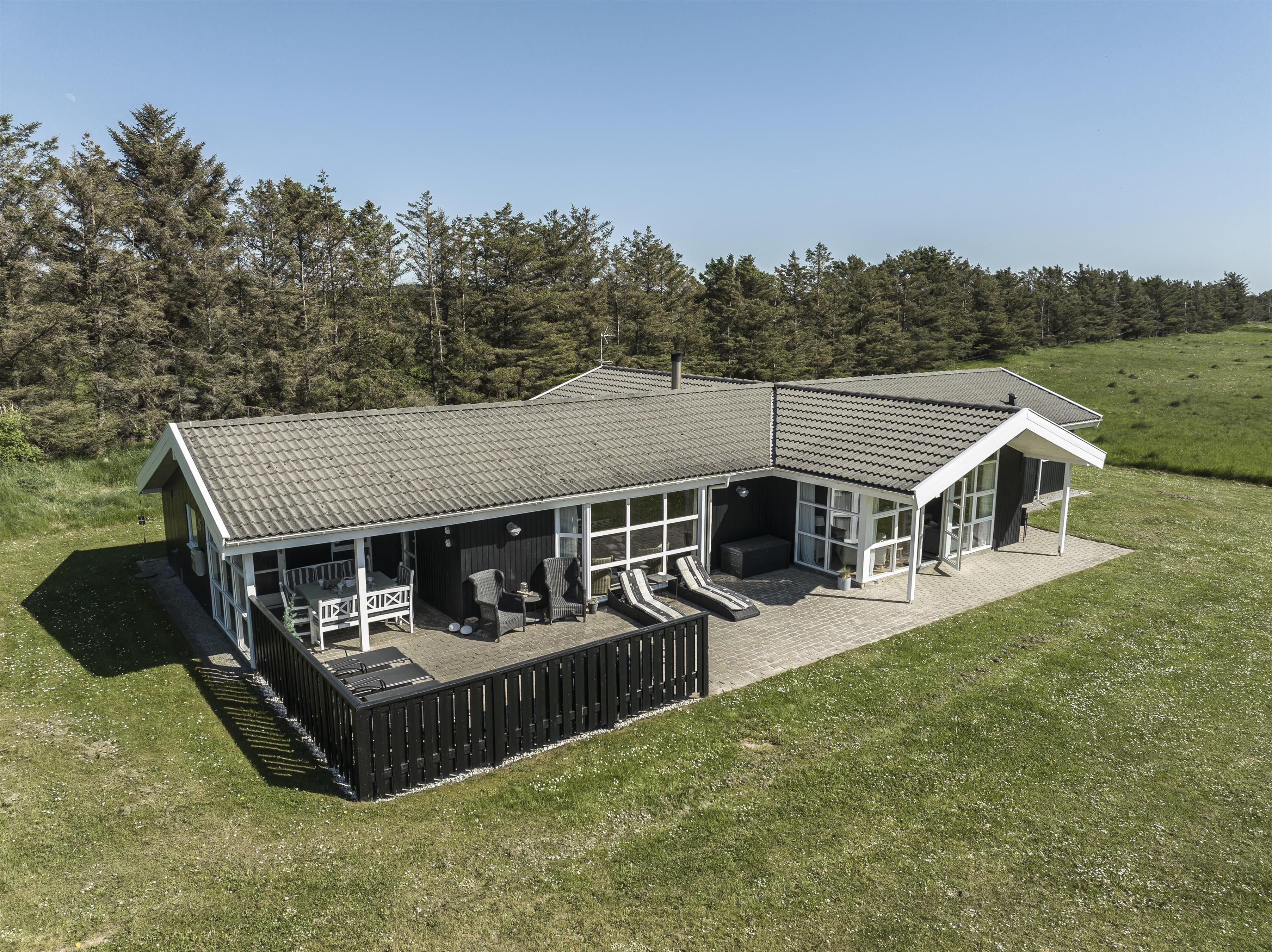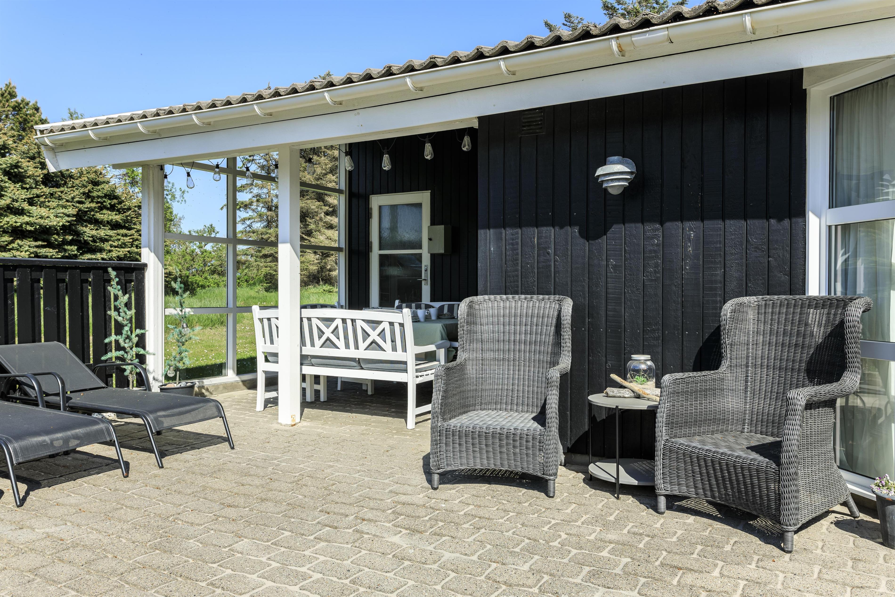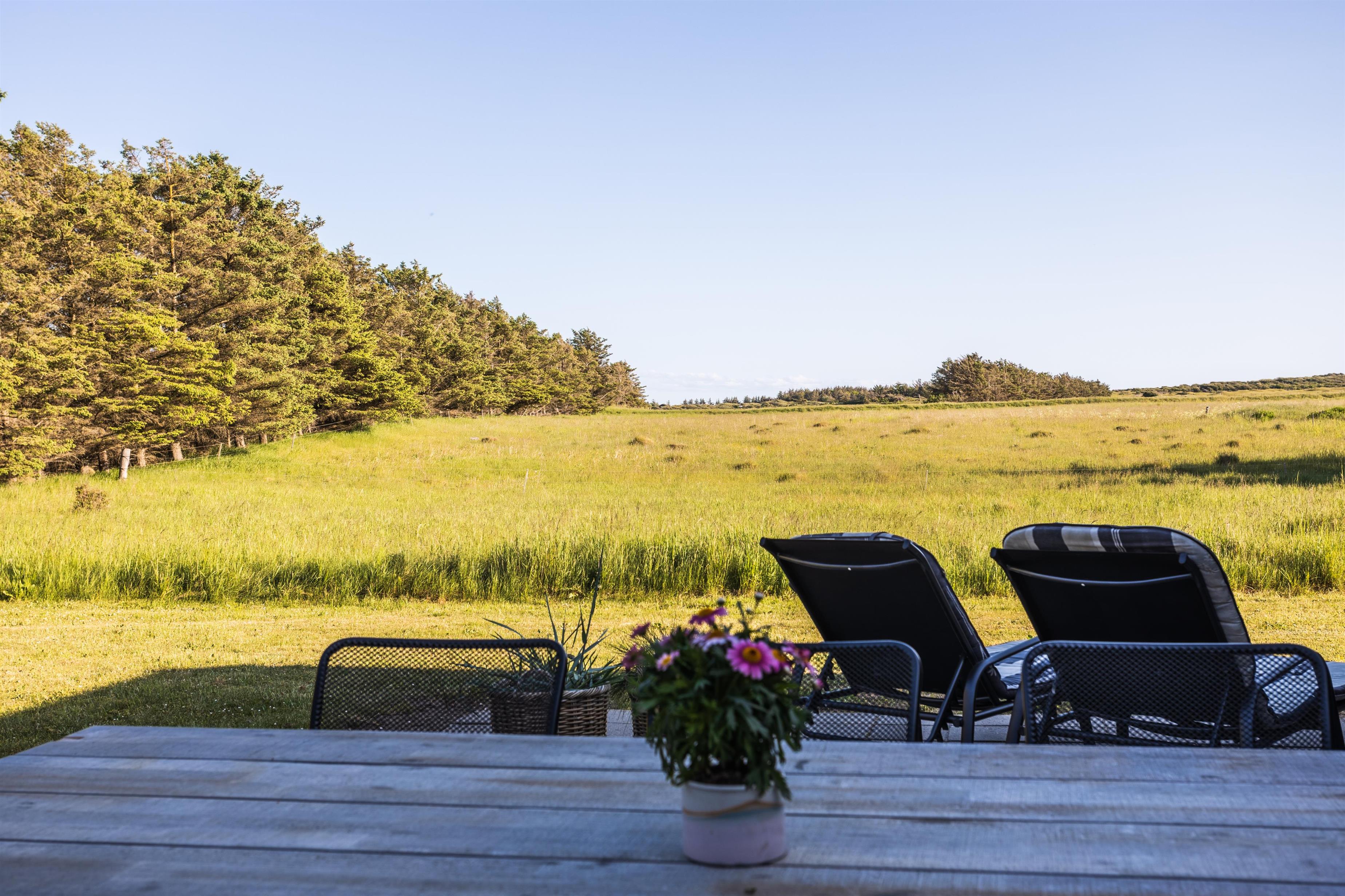 Udendørsområdet byder på skønne terrasser og en stor have. Her er der rig mulighed for at nyde de solrige sommerdage og -aftener på en af husets mange gode terrasser. I kan vælge mellem sol eller skygge og nyde jeres feriehus i ro og mag. Under den overdækkede terrasse kan I nyde eftermiddagskaffen, mens I slapper af i den friske vestkystluft. Uanset hvor I befinder jer, har I udsigt til den smukke natur, der omgiver feriehuset. Haven er stor og indbyder til leg og boldspil på den grønne græsplæne. I bunden af haven står en bænk, hvorfra I kan opleve en fantastisk udsigt over landskabet med Rubjerg Knude Fyr som en smuk baggrund.