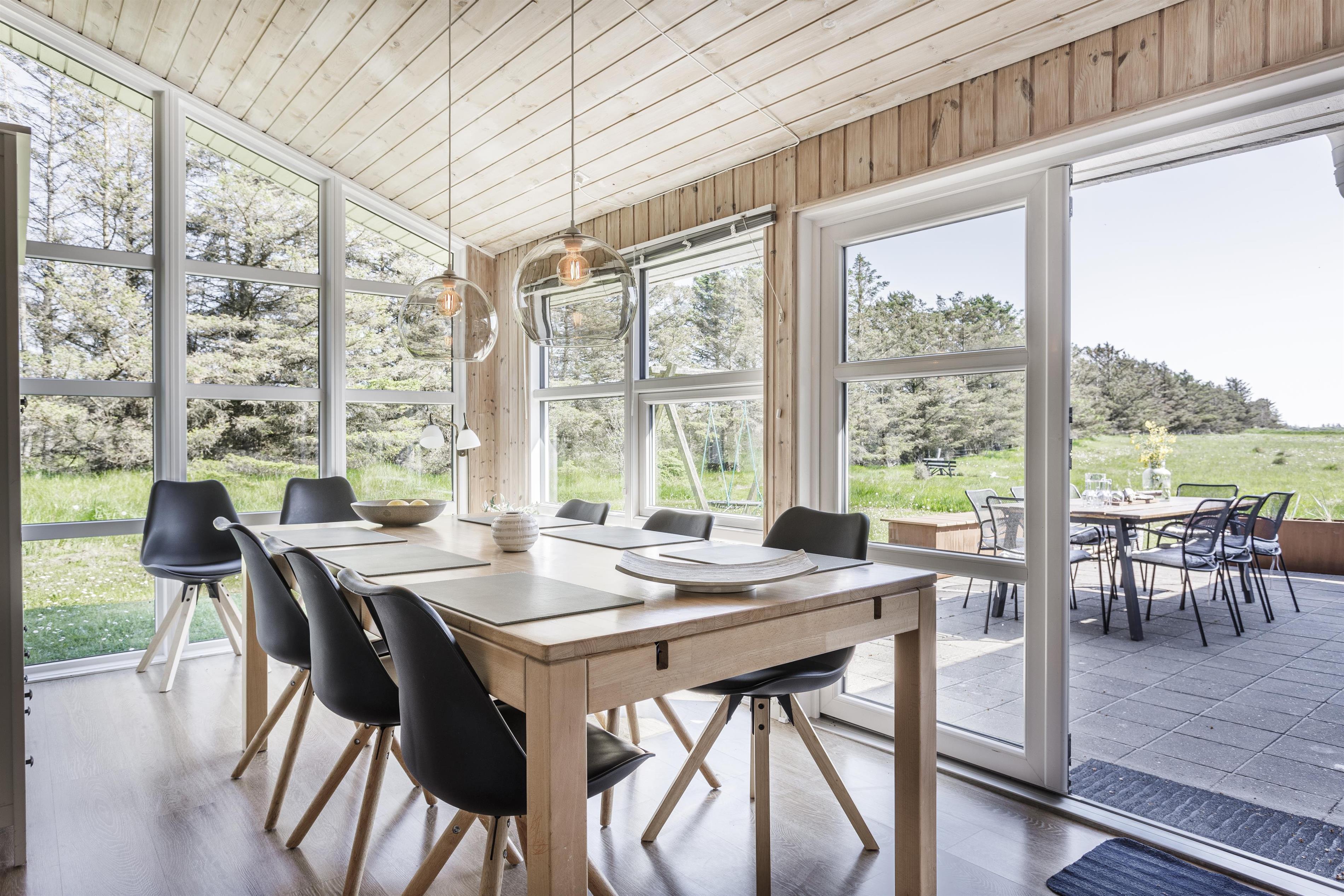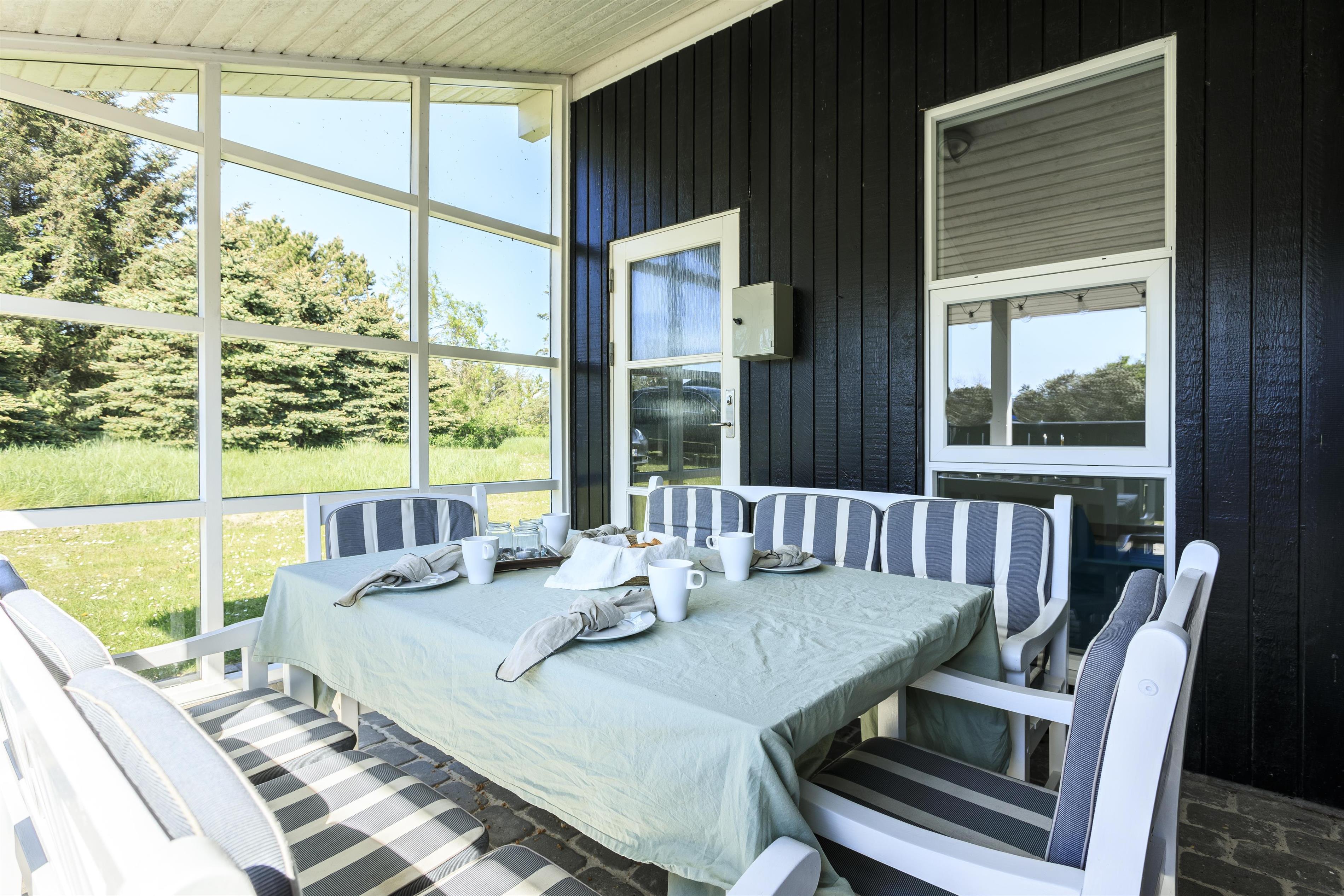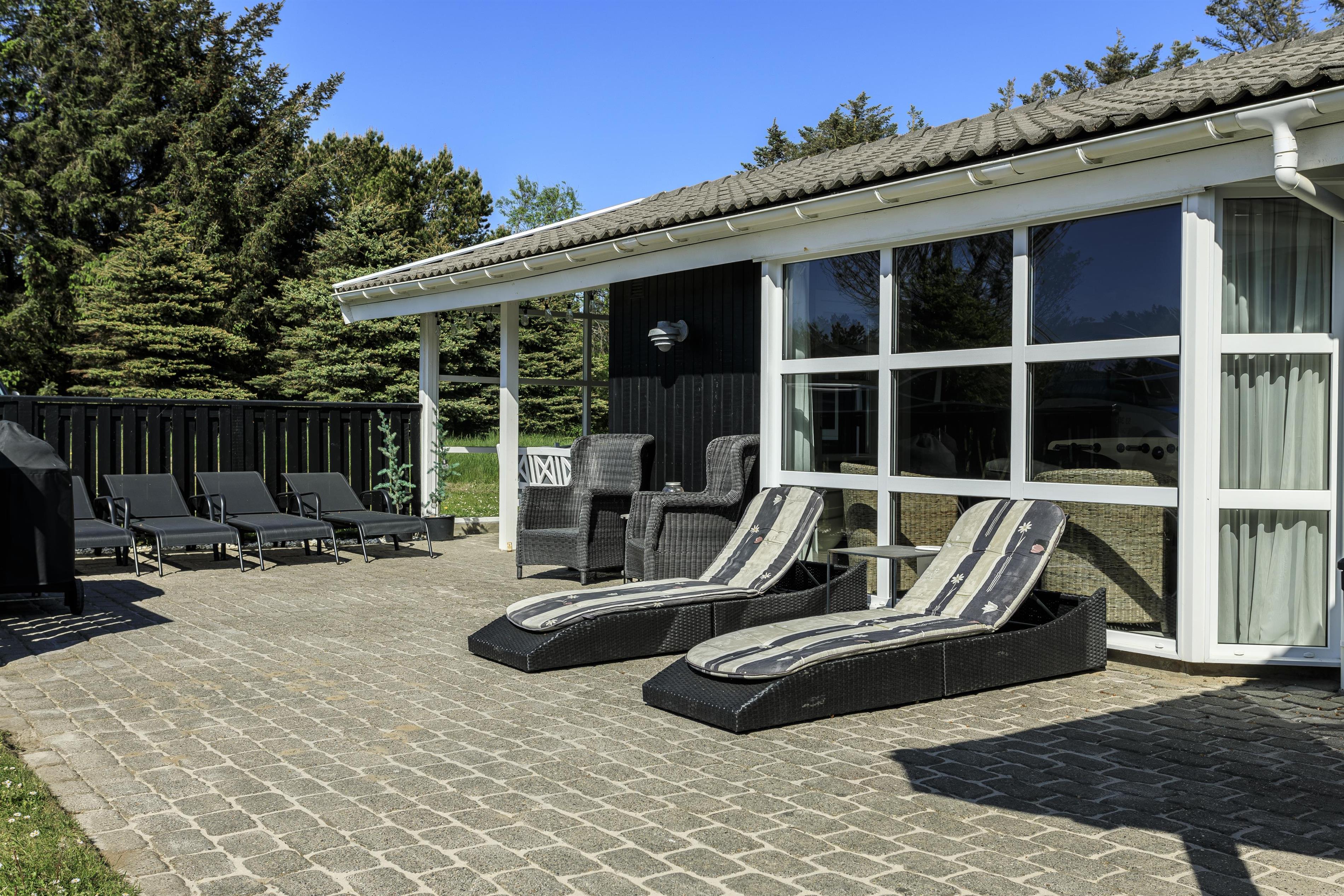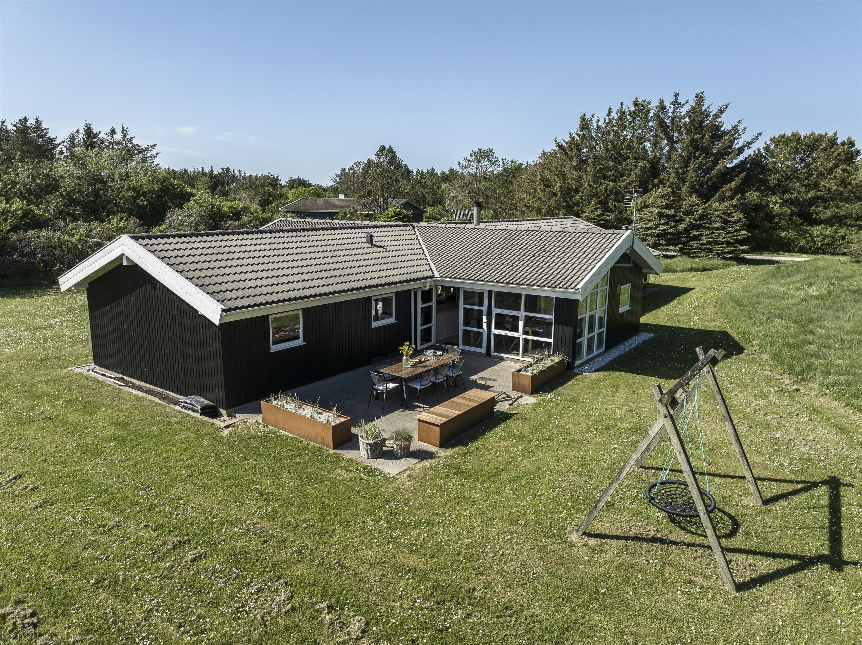 Udendørsområdet byder på skønne terrasser og en stor have. Her er der rig mulighed for at nyde de solrige sommerdage og -aftener på en af husets mange gode terrasser. I kan vælge mellem sol eller skygge og nyde jeres feriehus i ro og mag. Under den overdækkede terrasse kan I nyde eftermiddagskaffen, mens I slapper af i den friske vestkystluft. Uanset hvor I befinder jer, har I udsigt til den smukke natur, der omgiver feriehuset. Haven er stor og indbyder til leg og boldspil på den grønne græsplæne. I bunden af haven står en bænk, hvorfra I kan opleve en fantastisk udsigt over landskabet med Rubjerg Knude Fyr som en smuk baggrund.