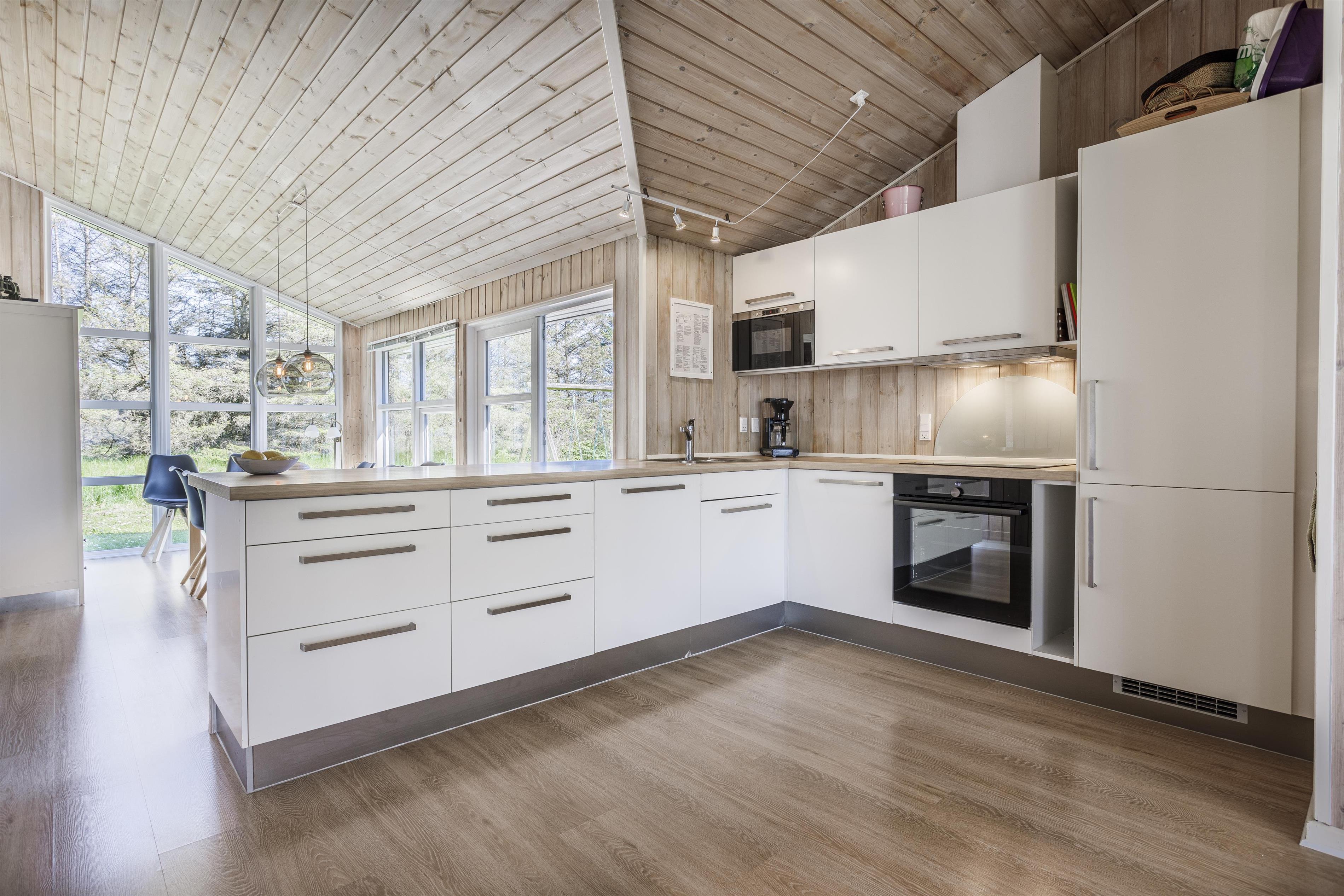 Huset har et stort og veludstyret køkken-alrum med alle nødvendige hårde hvidevarer. Fra køkkenet er der direkte udgang til den østvendte morgenterrasse, hvor I kan nyde dagens første kop kaffe. I åben forbindelse med køkkenet ligger den rummelige stue med loft til kip, store vinduespartier og en hyggelig brændeovn, der spreder varme på de kølige dage.