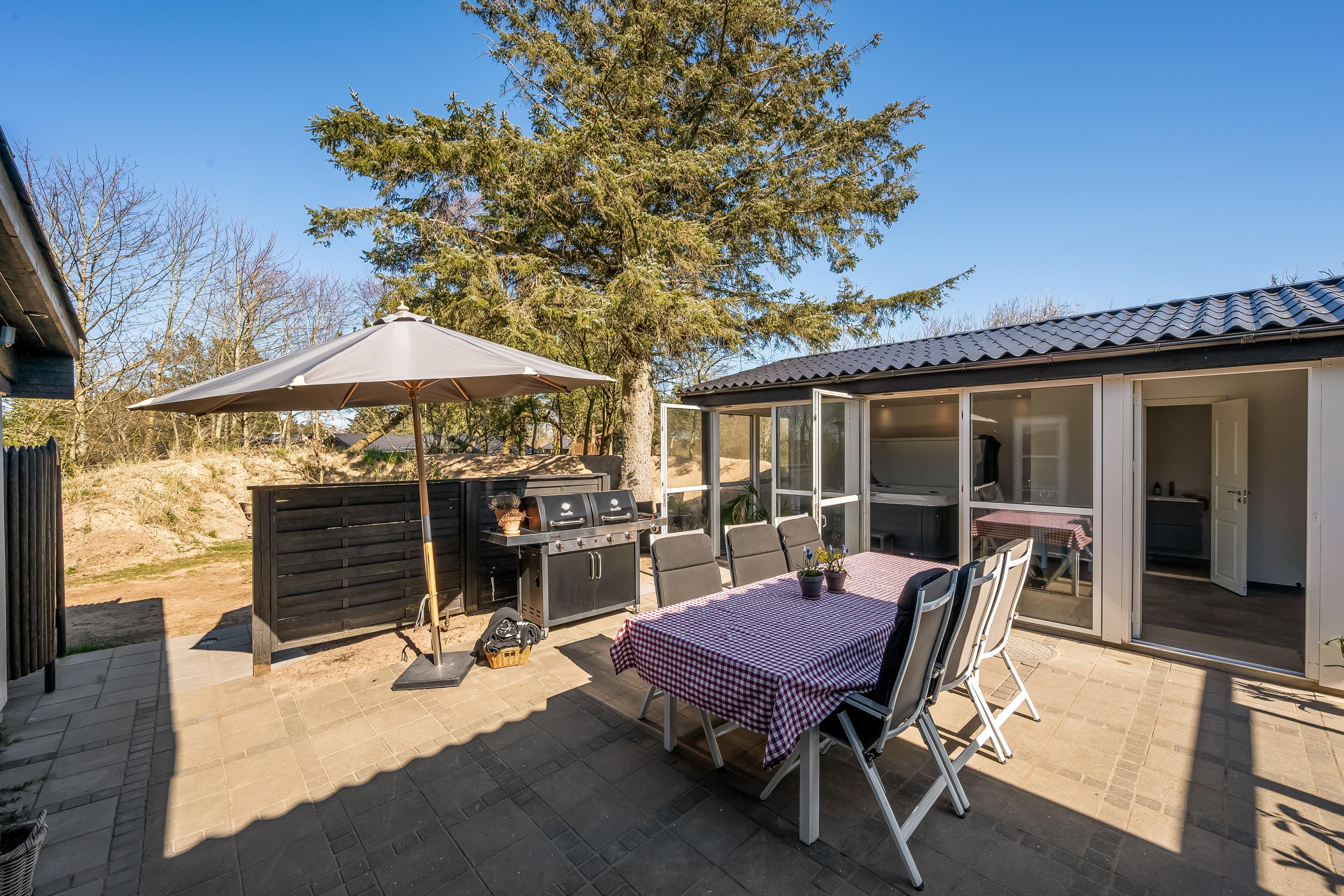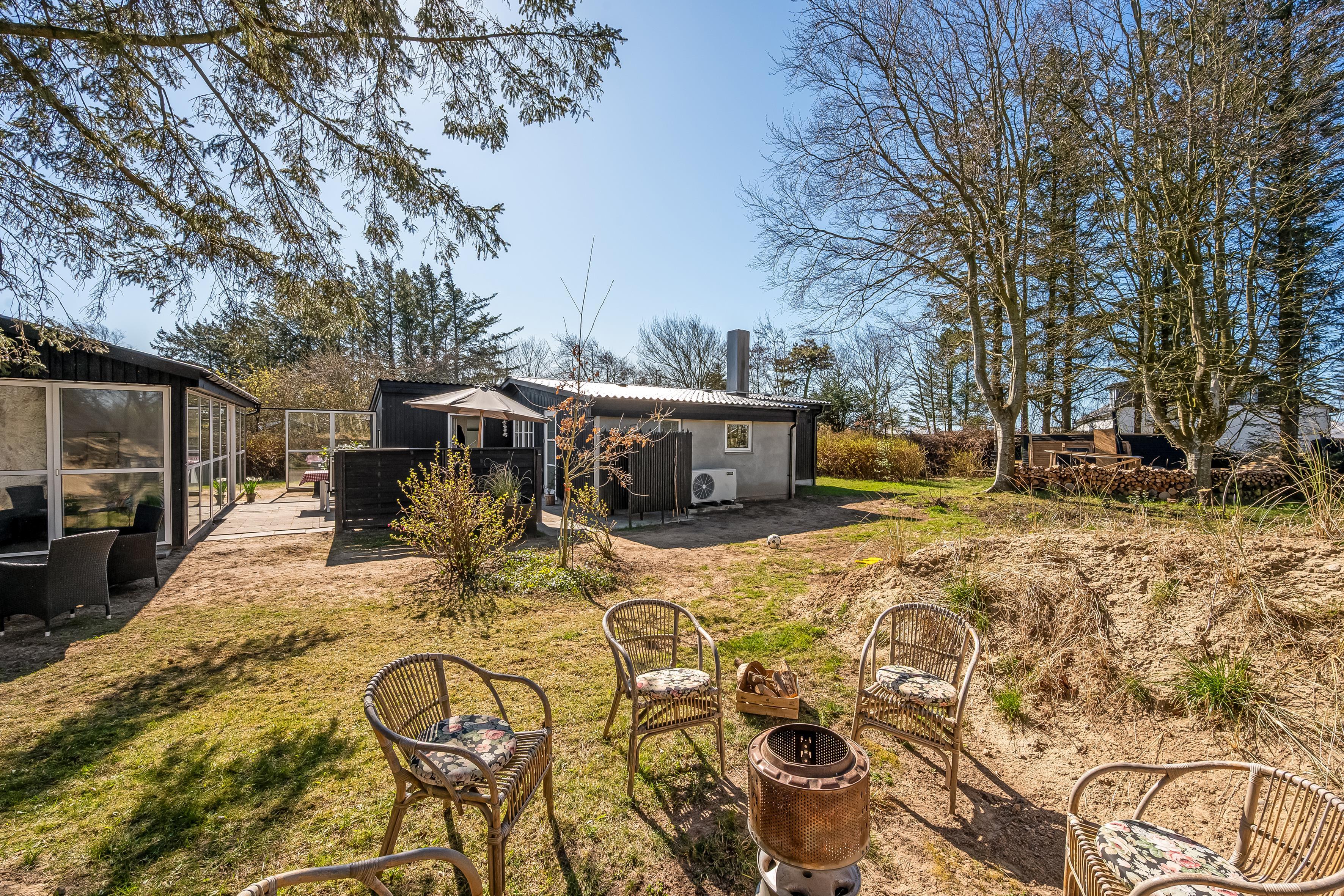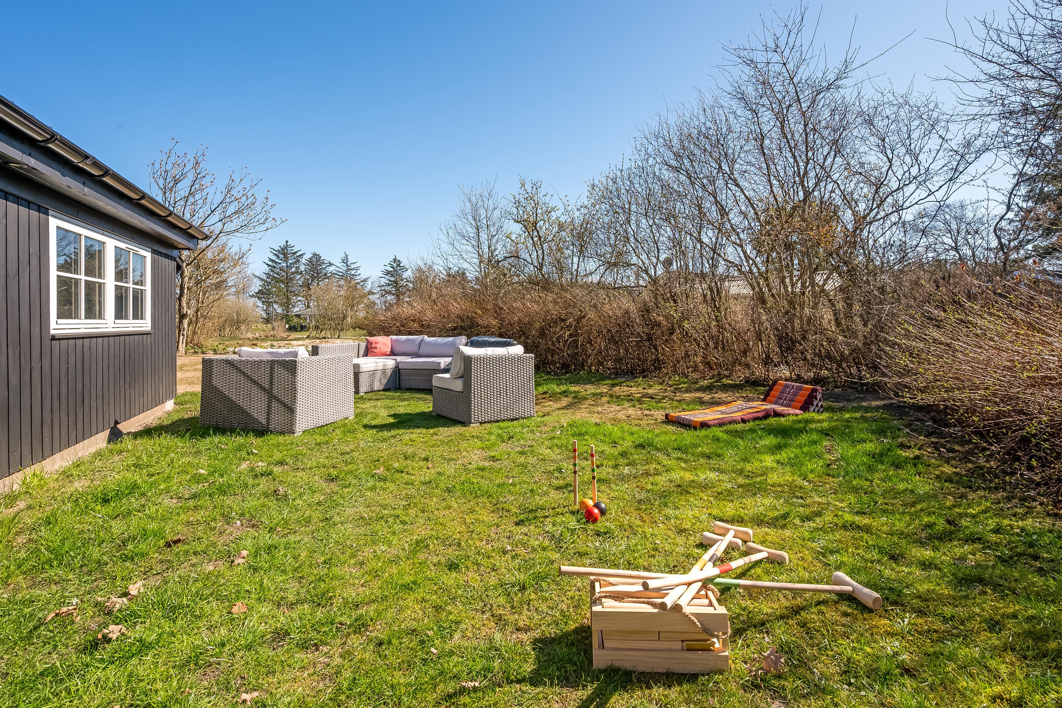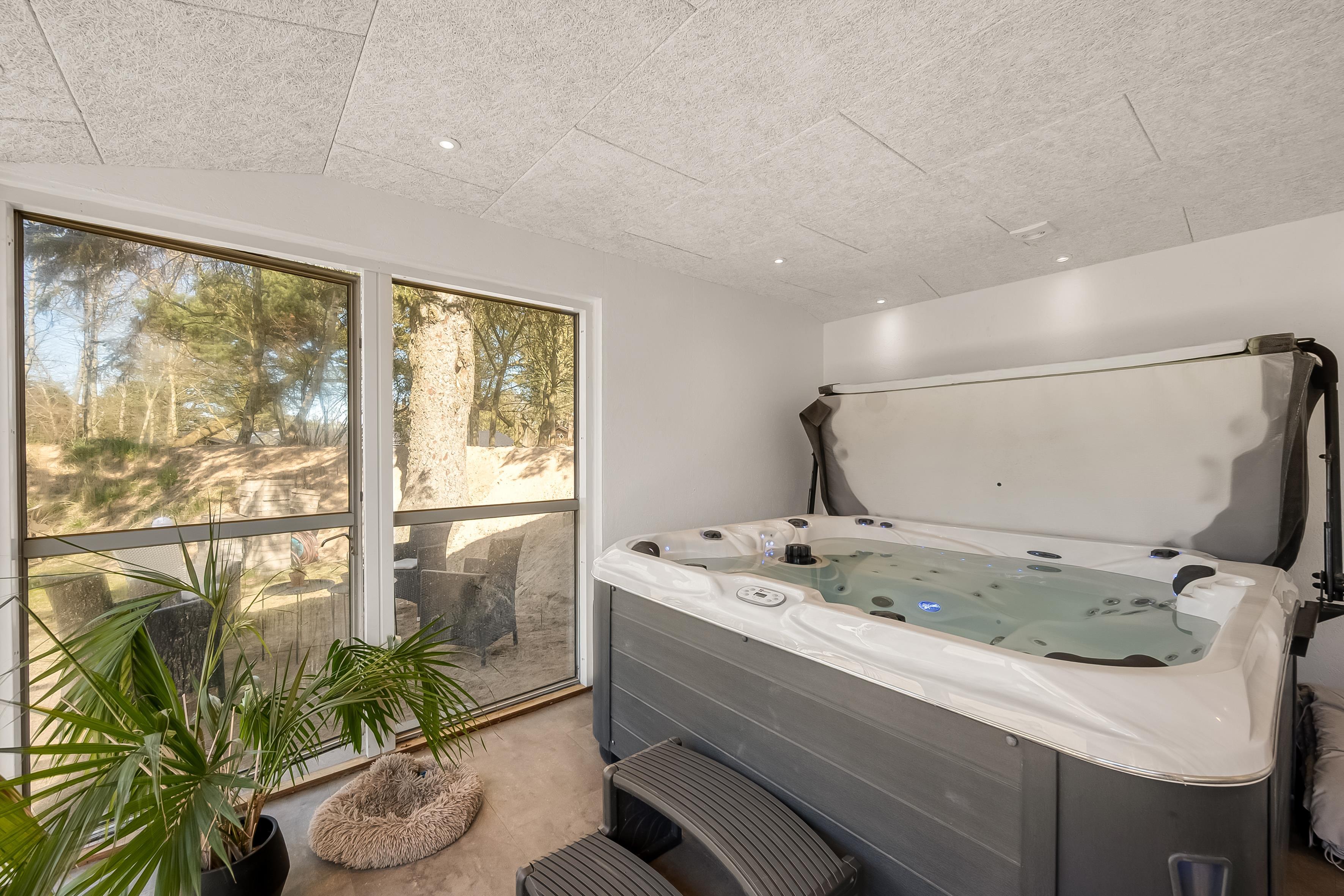 Når sommeren viser sig fra sin bedste side, er der masser af udendørsareal til solbadning, spil og leg. Sommerhuset ligger på en skøn grund, og der er terrasse i alle solbeskinnede vinkler, så det skulle være muligt at finde en skøn plads i sol eller læ. Du er under en kilometer fra stranden og Lønstrup by. Inden for en kort radius har du derfor indkøbs- og transportmuligheder samt restauranter, kunstbutikker mm. Er der ikke vejr til at være ude, kan du hoppe i den store jacuzzi i husets anneks, hvor I også kan sove to personer. I annekset er eget køkken og badeværelse.