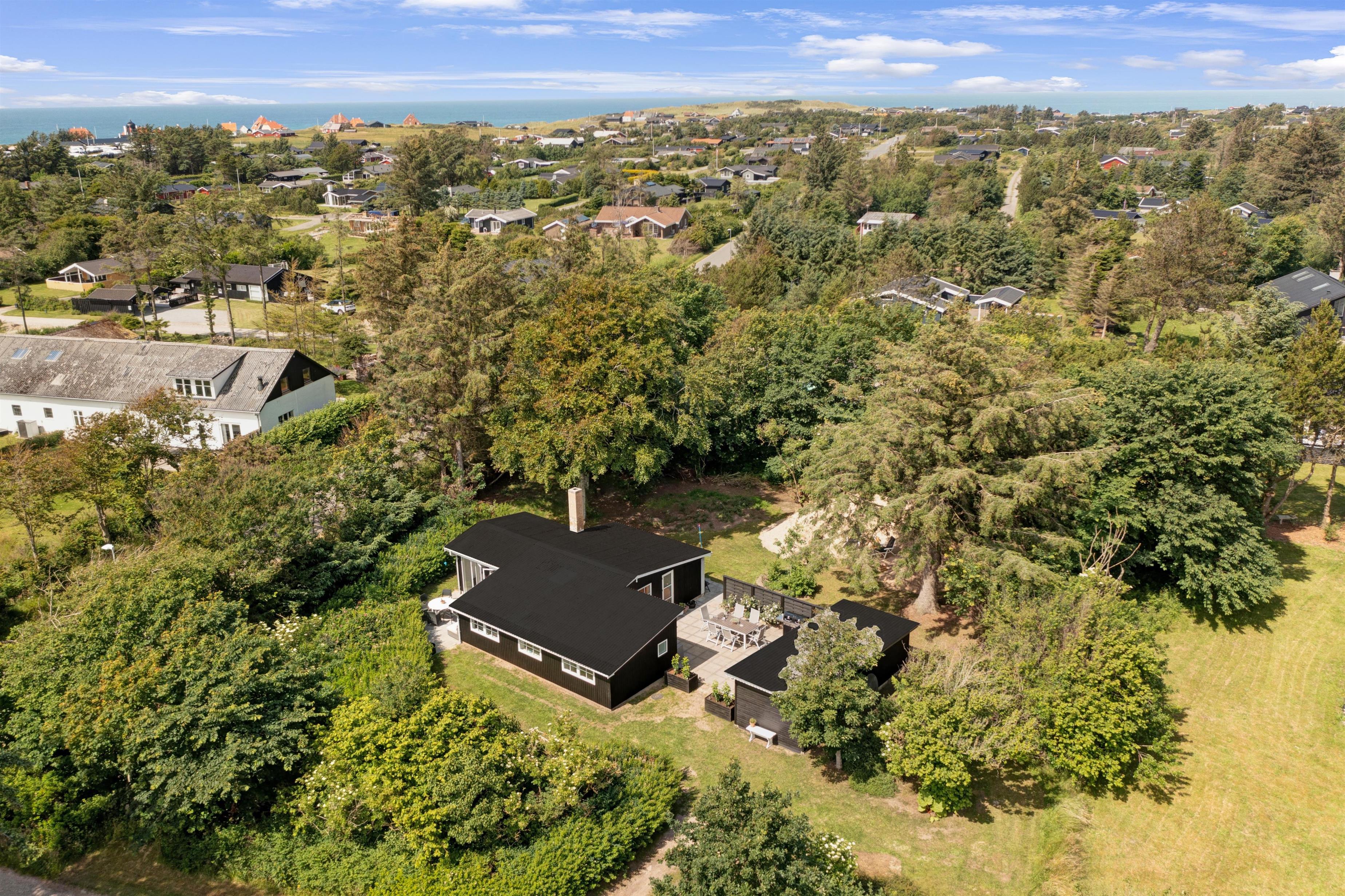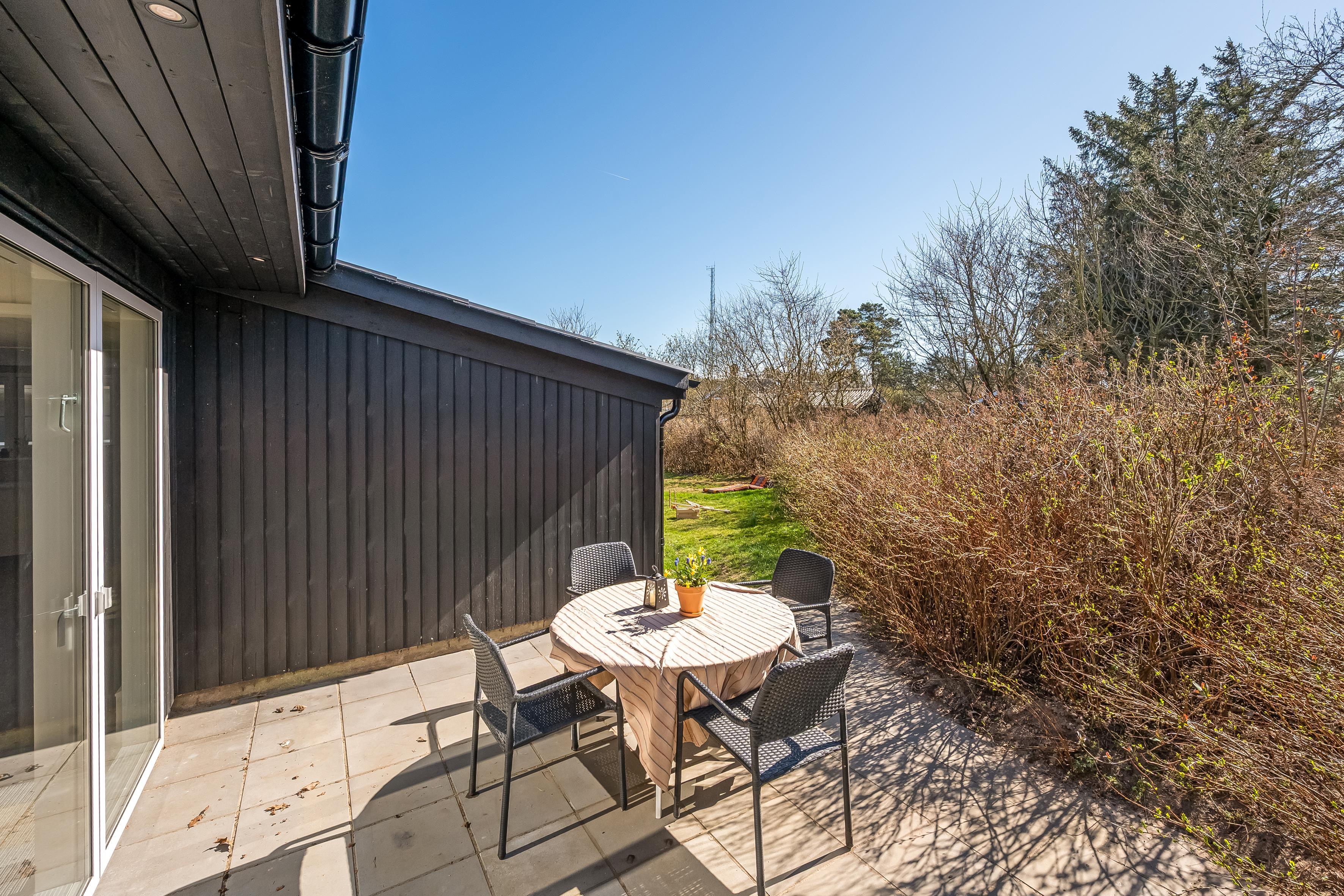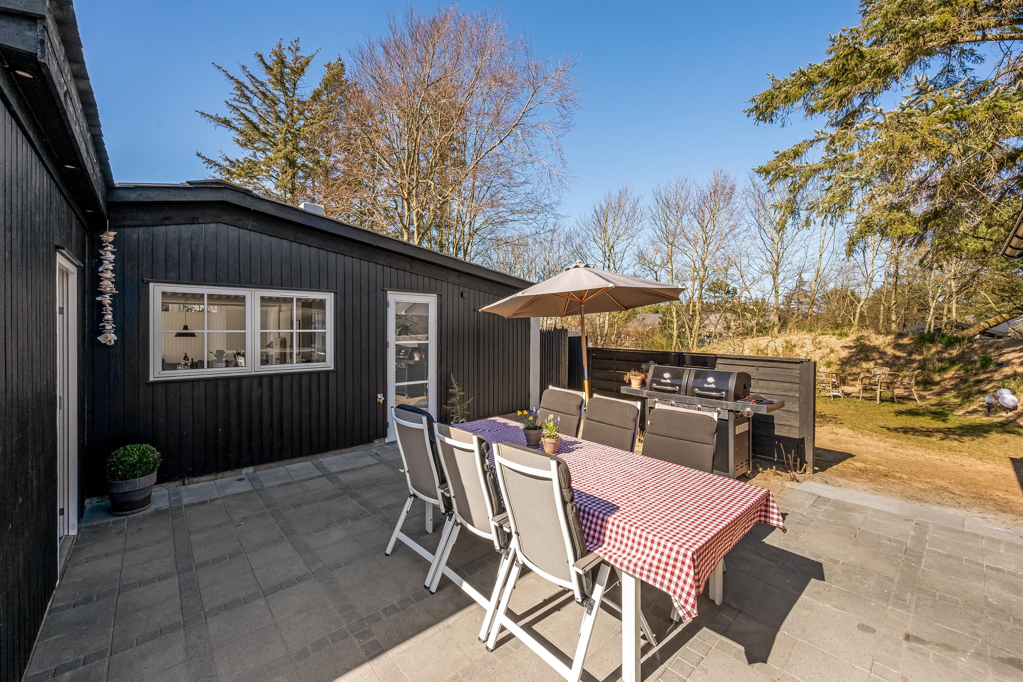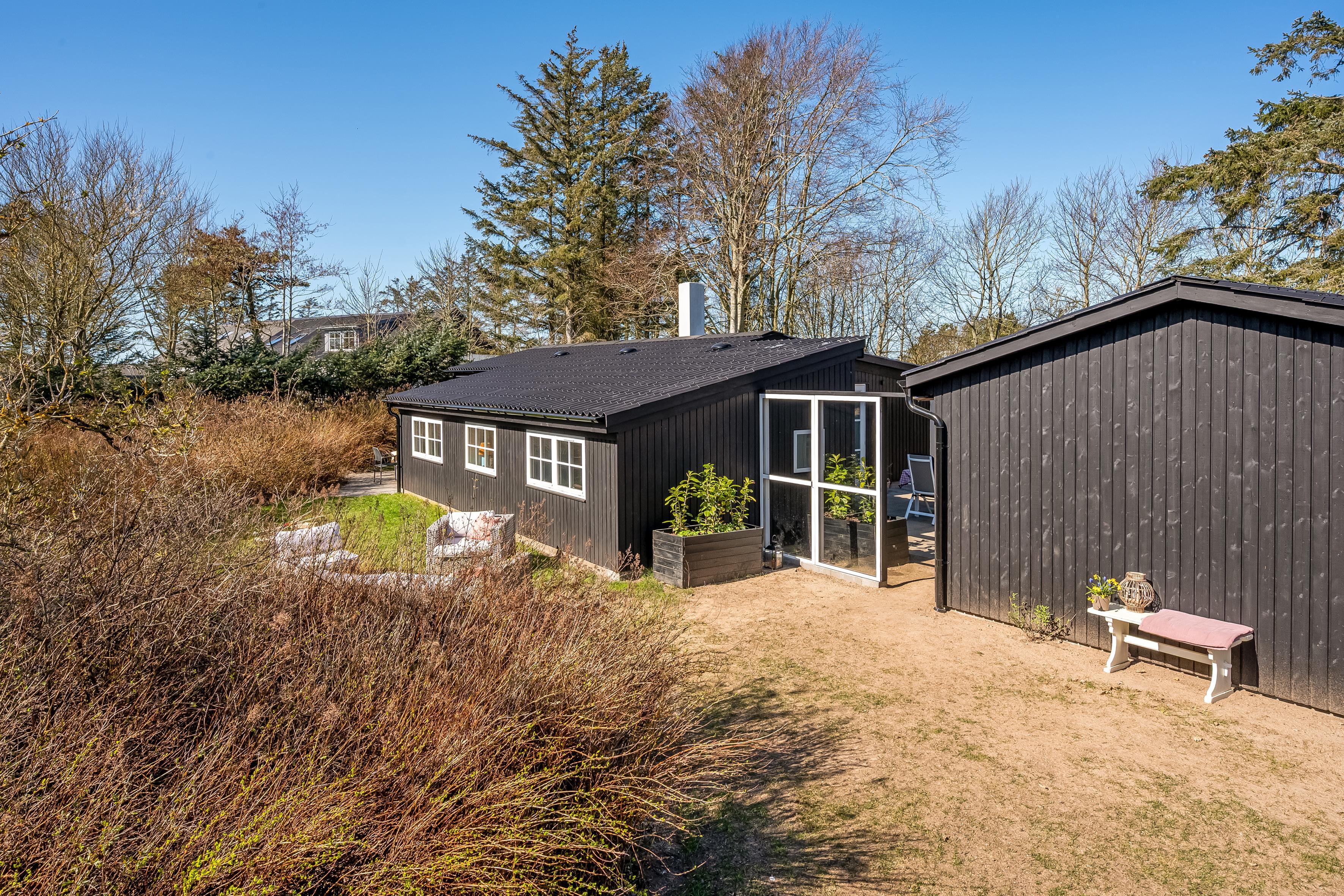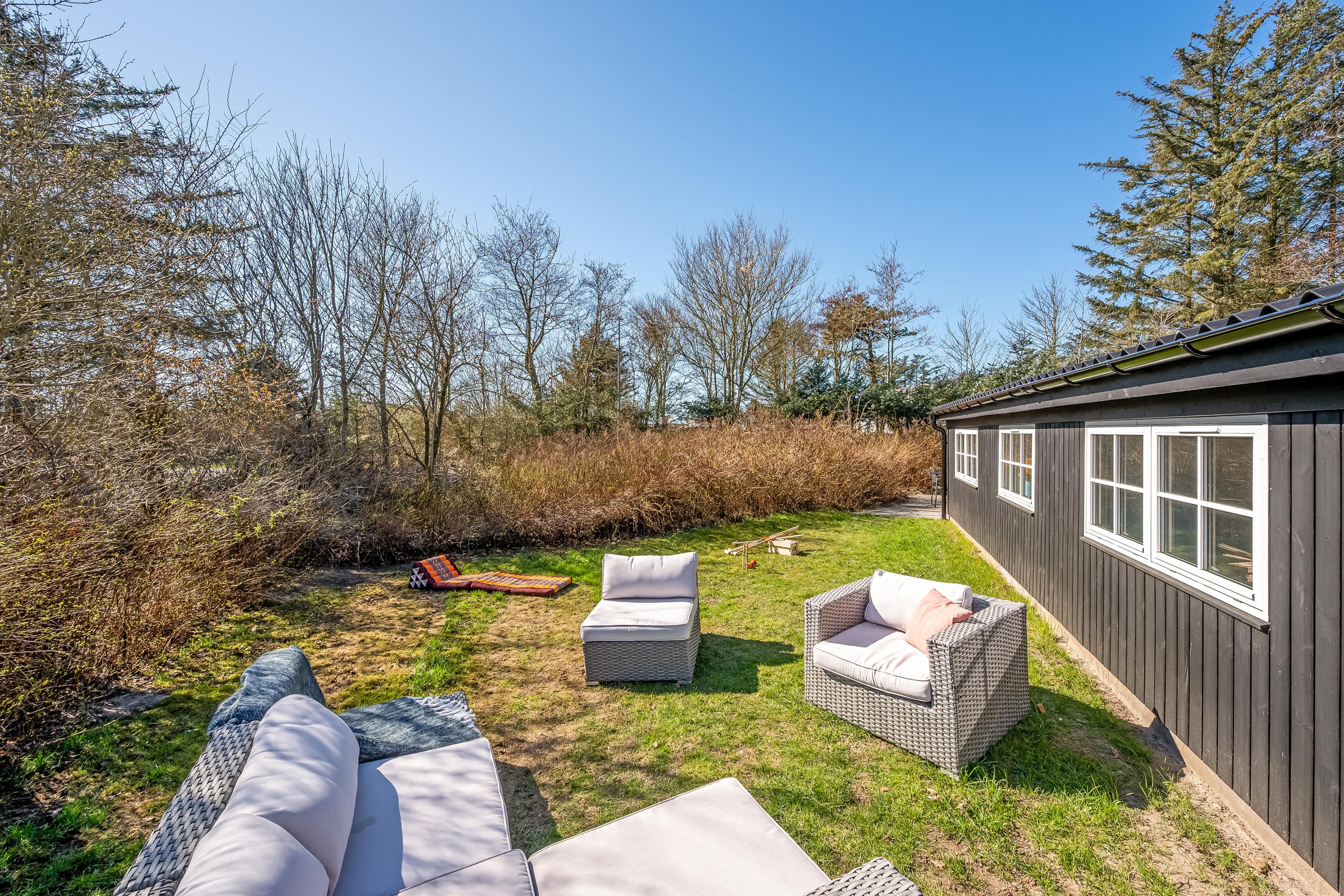 Når sommeren viser sig fra sin bedste side, er der masser af udendørsareal til solbadning, spil og leg. Sommerhuset ligger på en skøn grund, og der er terrasse i alle solbeskinnede vinkler, så det skulle være muligt at finde en skøn plads i sol eller læ. Du er under en kilometer fra stranden og Lønstrup by. Inden for en kort radius har du derfor indkøbs- og transportmuligheder samt restauranter, kunstbutikker mm. Er der ikke vejr til at være ude, kan du hoppe i den store jacuzzi i husets anneks, hvor I også kan sove to personer. I annekset er eget køkken og badeværelse.