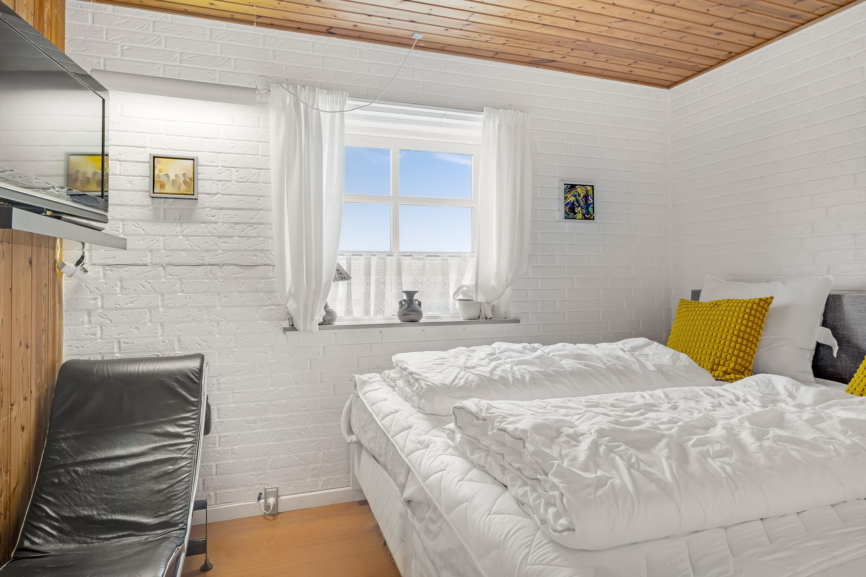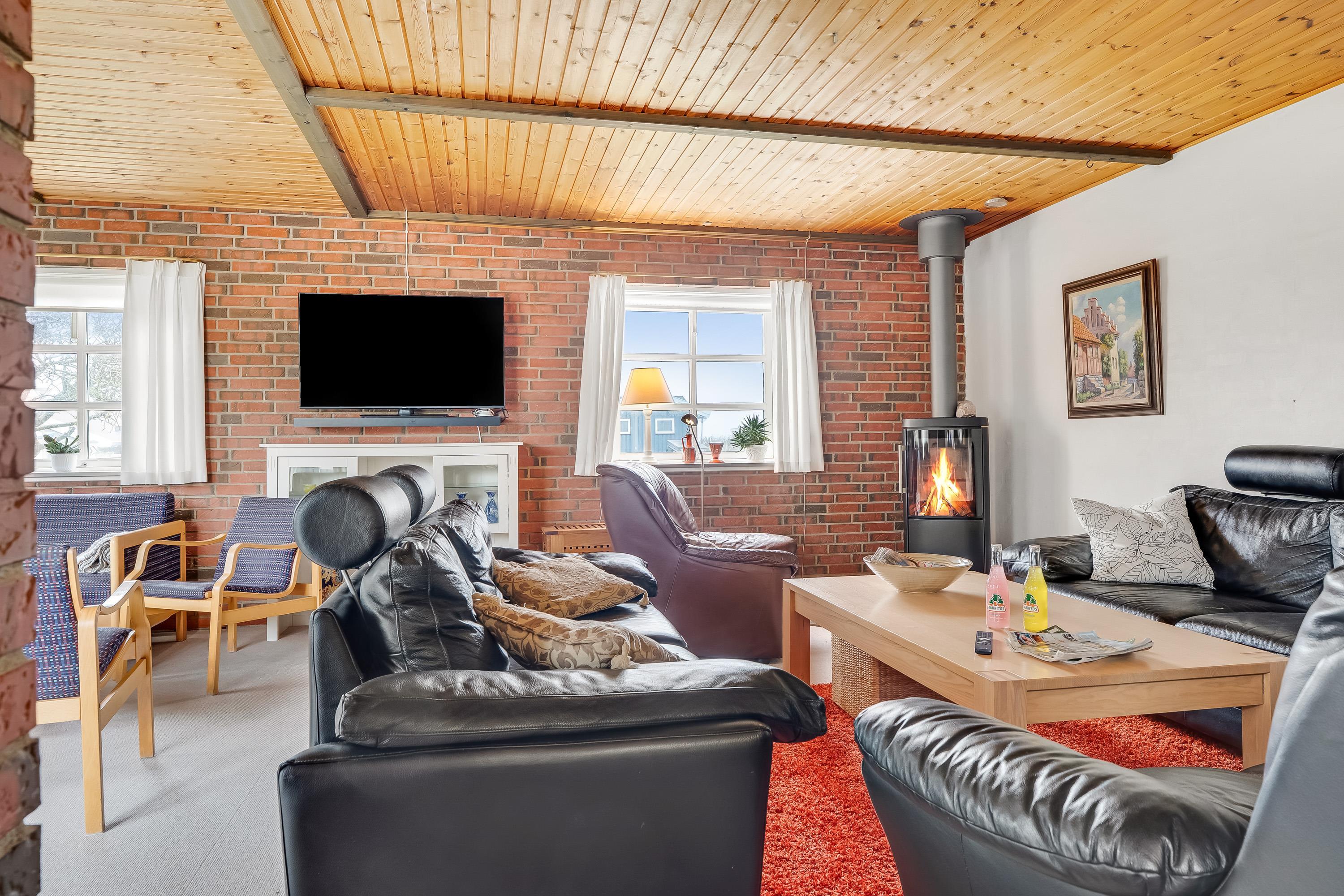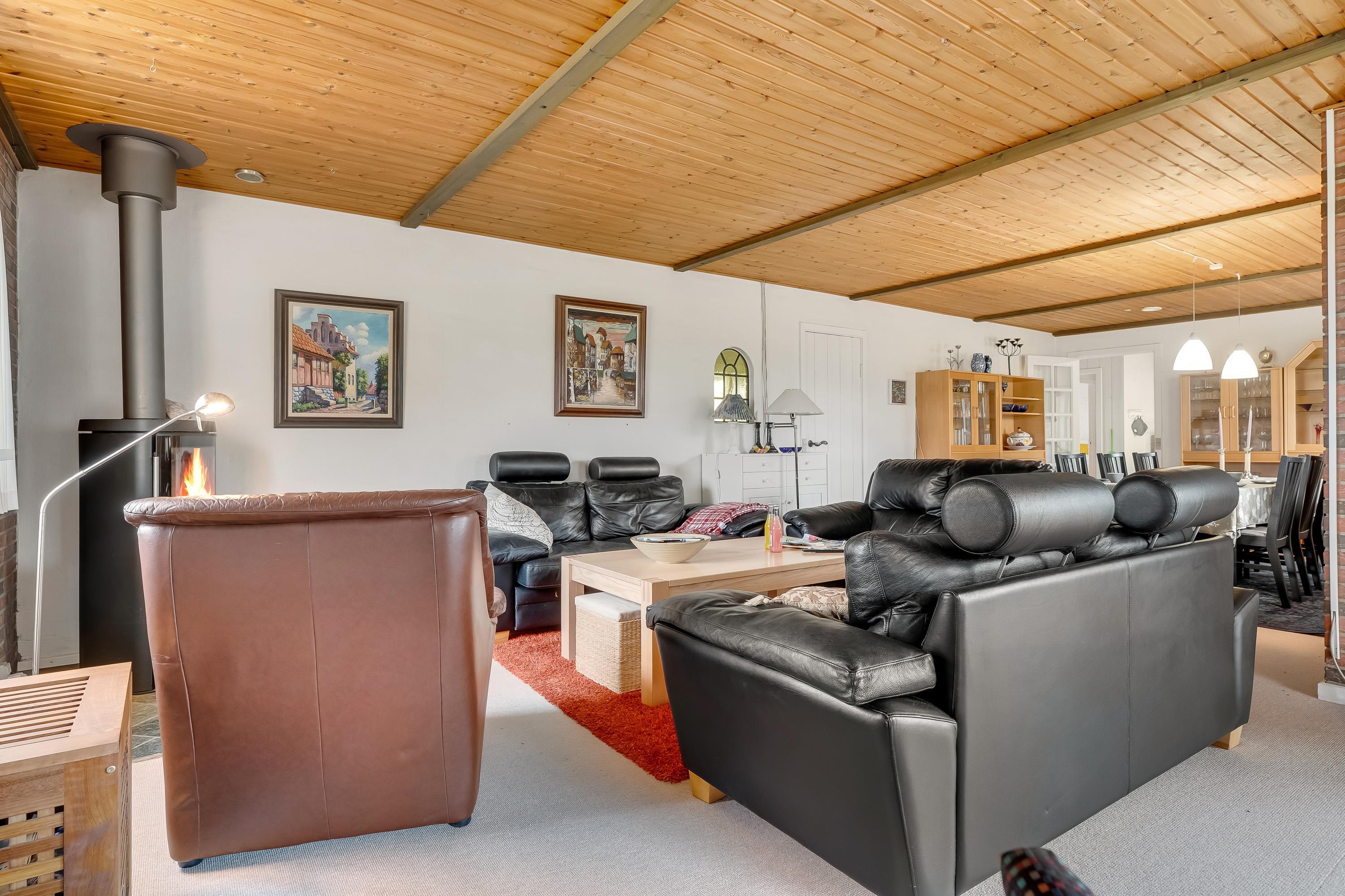Den store stue rummer hele to sofaarrangementer, hvoraf det ene støder op mod den hyggelige brændeovn - og her er der desuden spisestue og åben adgang til køkkenet. Huset rummer to badeværelser og tre soverum med dobbeltsenge (180*200 cm), samt et ekstra værelse med to ekstra sovepladser. Fra køkkenet