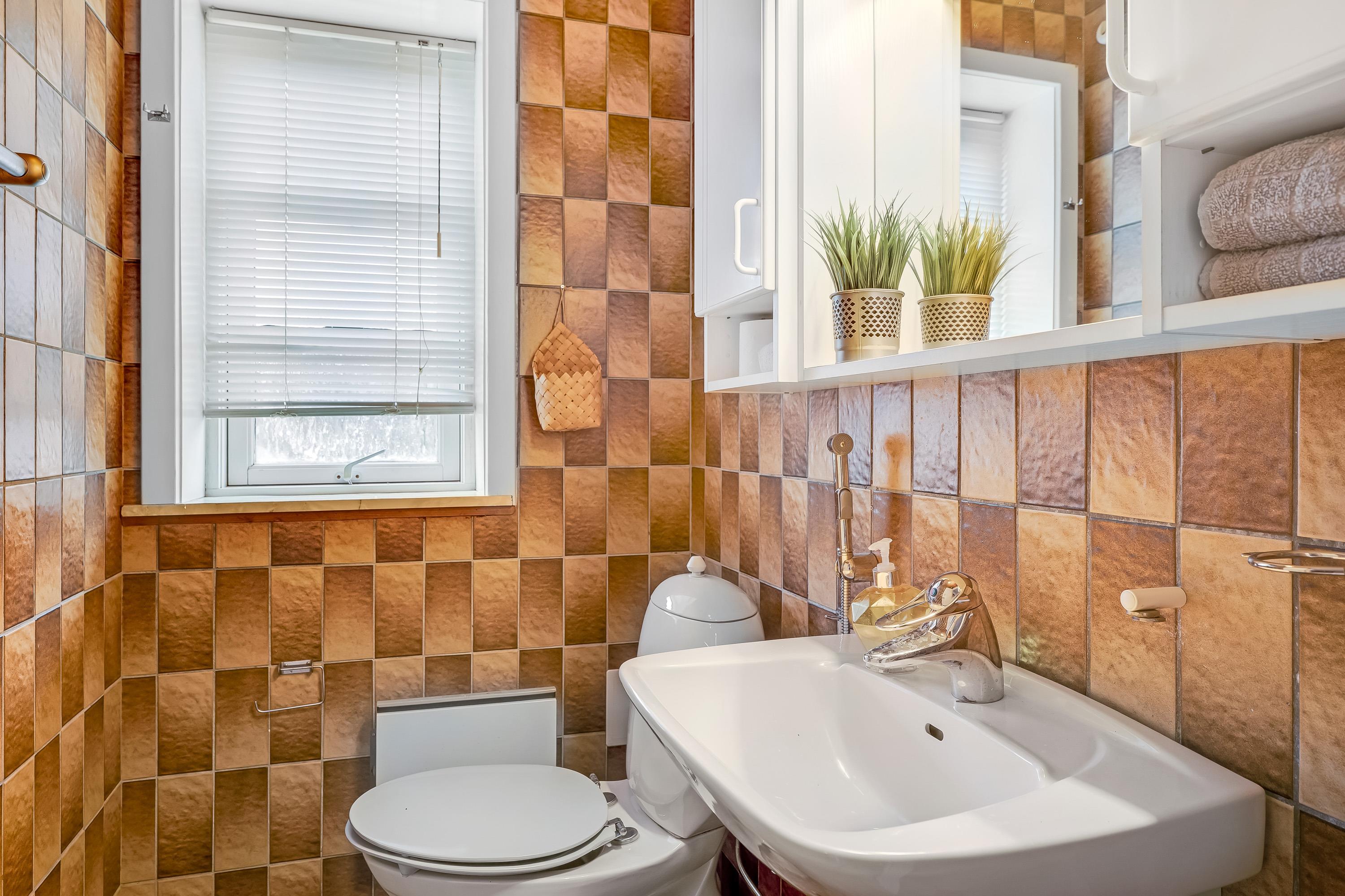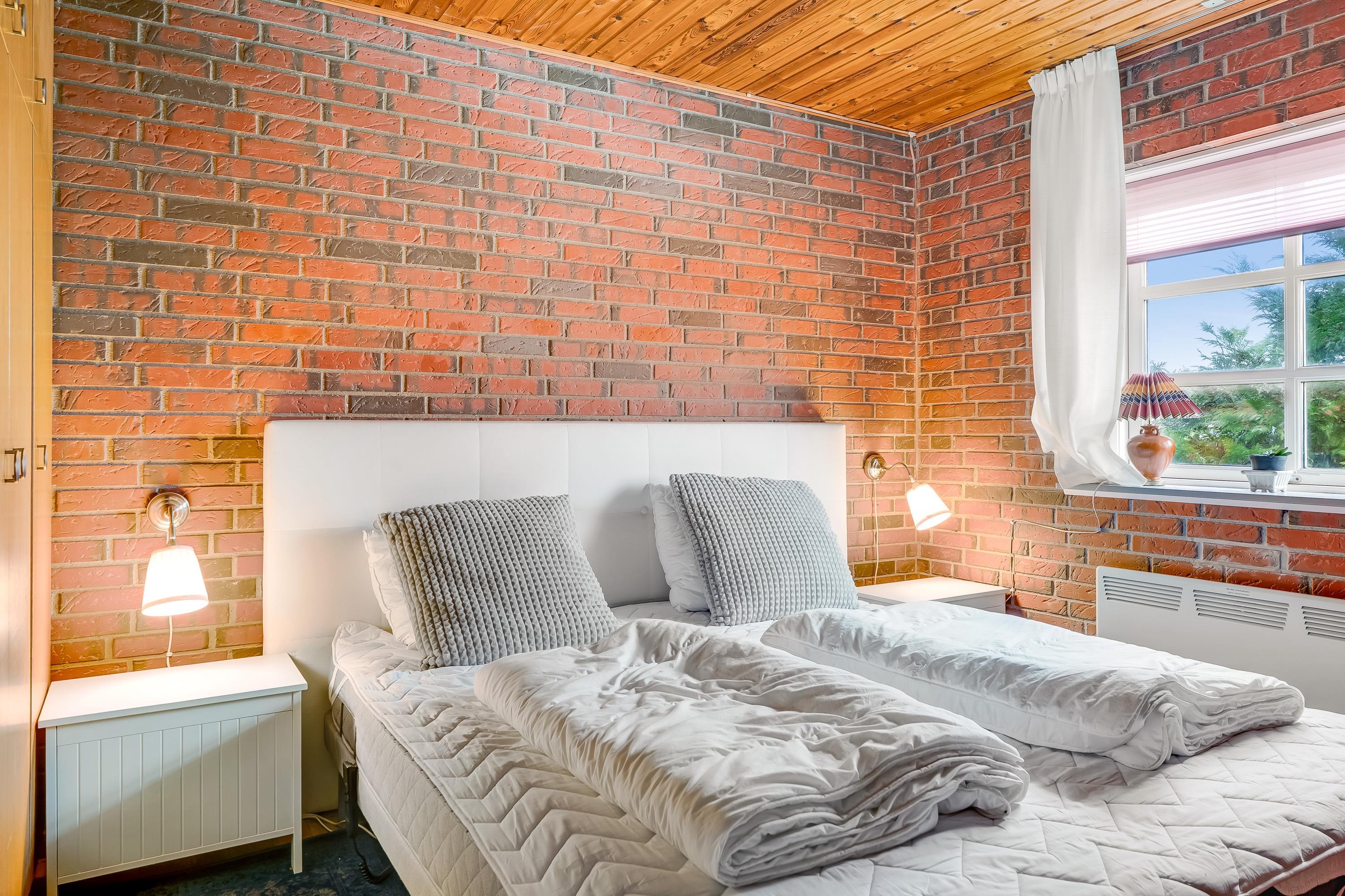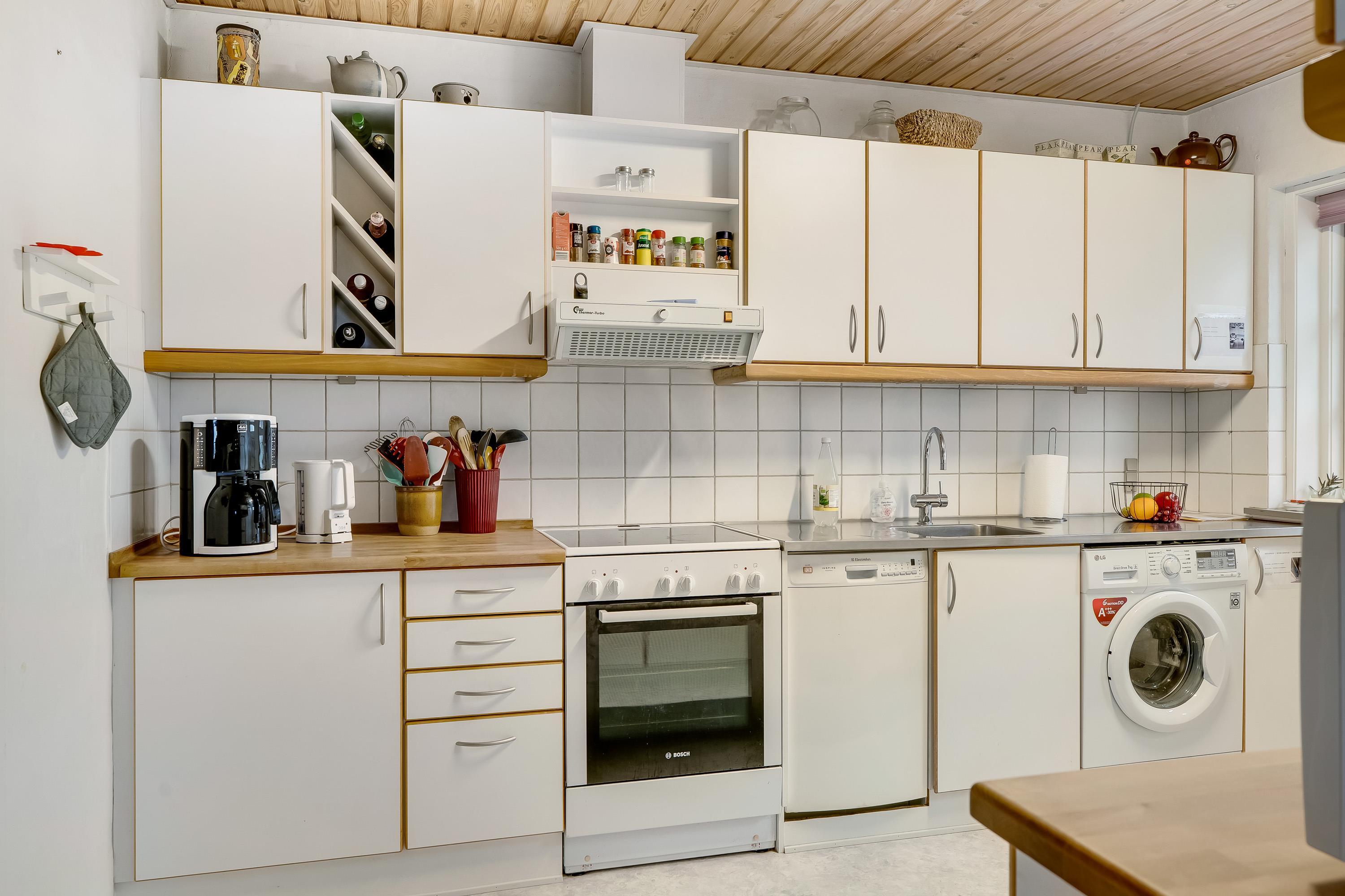 Den store stue rummer hele to sofaarrangementer, hvoraf det ene støder op mod den hyggelige brændeovn - og her er der desuden spisestue og åben adgang til køkkenet. Huset rummer to badeværelser og tre soverum med dobbeltsenge (180*200 cm), samt et ekstra værelse med to ekstra sovepladser. Fra køkkenet