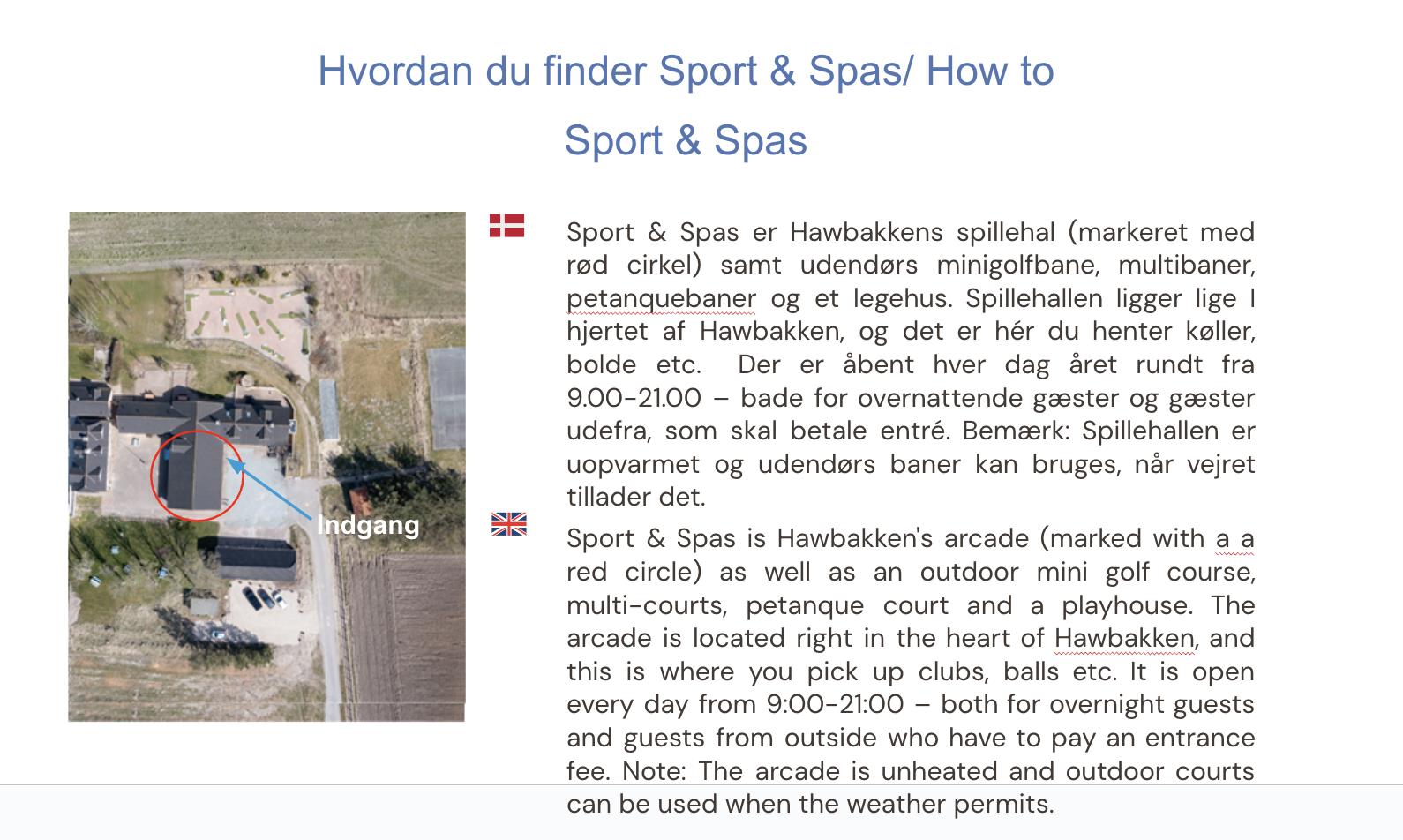 Sport og Spas er åbent hver dag året rundt fra 9.00-21.00 – både for overnattende gæster og gæster udefra, som skal betale entré. Bemærk: Spillehallen er uopvarmet og udendørs baner kan bruges, når vejret tillader det.
