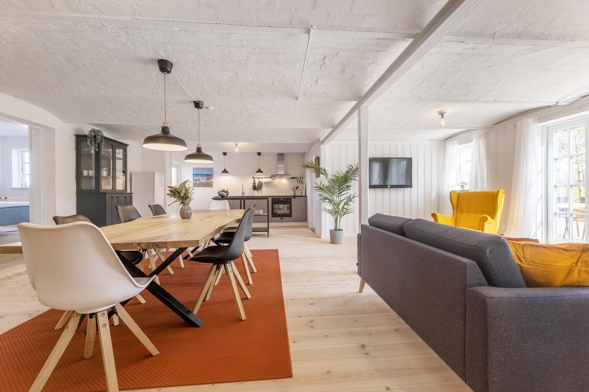 Træd ind i Kostalden og oplev en indbydende atmosfære! I det store køkken-alrum kan I spise hele 14 personer sammen, og stuen er designet til at skabe hyggelige stunder. De moderne bekvemmeligheder og stilfulde møbler, tilføjer et strejf af luksus til din ferie og udenfor kan I nyde den bredeste solnedgang eller grille fra den store, private terrasse.