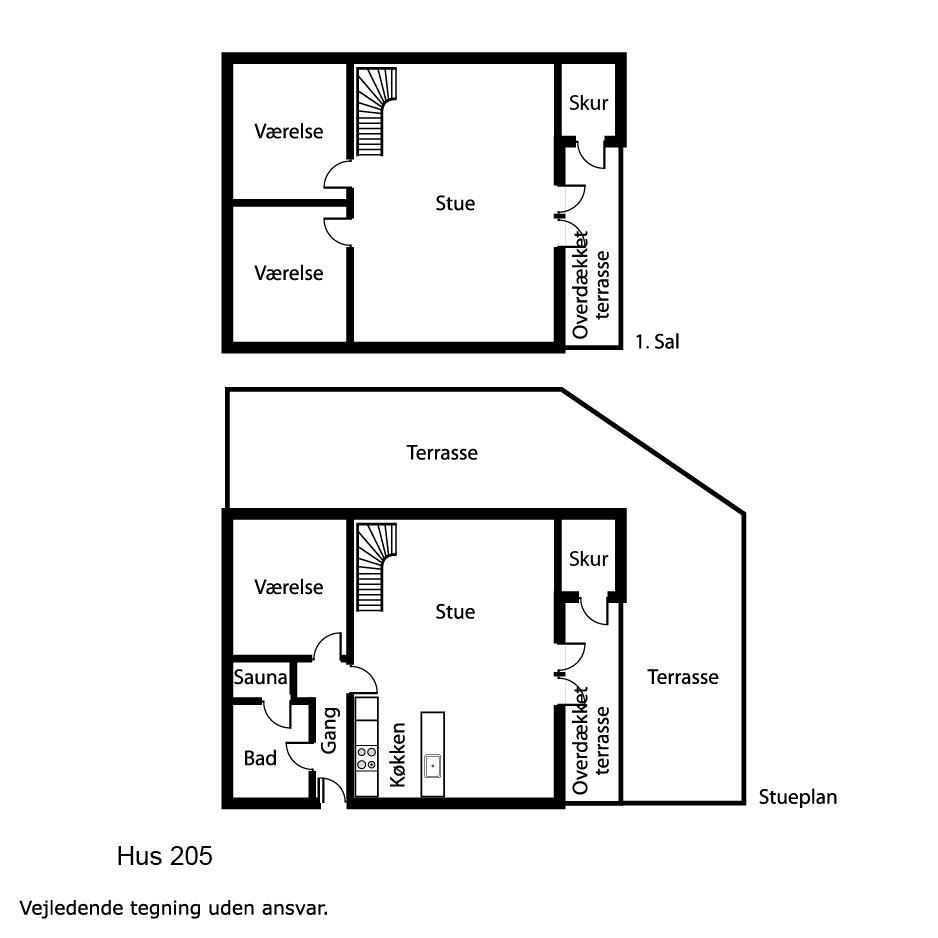 Huset er særdeles velindrettet med pæne møbler, trægulve og lyse vægge. Køkken og stue er i samme rum. Her er der både spisebord, sofagruppe, sofabord, brændeovn samt radio med CD-afspiller. Køkkenet har glaskeramisk komfur, mikrobølgeovn, køle-fryseskab og opvaskemaskine. Ovenpå er der endnu en stue med møbler og sofa samt fladskærms-tv hvor det er muligt at se DR 1 og TV2 samt tysk tv. Hertil er der ligeledes en DVD afspiller. Herfra er der også adgang til den vestvendte balkon. Badeværelset ligger i stueetagen og her er der gulvvarme, bruser, håndvask og et toilet. Herfra er der også indgang til husets sauna. Huset har 3 soveværelser hvor de alle har dobbeltsenge. Det ene er i stueetagen og de 2 andre er på 1. sal. I huset findes endvidere en vaskemaskine og tørretumbler. Ikke rygerhus. Max 2 husdyr tilladt.