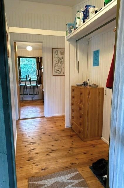 Sommerhuset byder på en klassisk og autentisk sommerhusstemning med trævægge og -lofter, der skaber en varm og hjemlig atmosfære. Fra entréen kommer du direkte til husets tre soveværelser: to rummelige værelser med dobbeltsenge samt et børnevenligt værelse med køjesenge. Badeværelset er enkelt, funktionelt og har et dejligt lysindfald fra vinduet mod skoven.