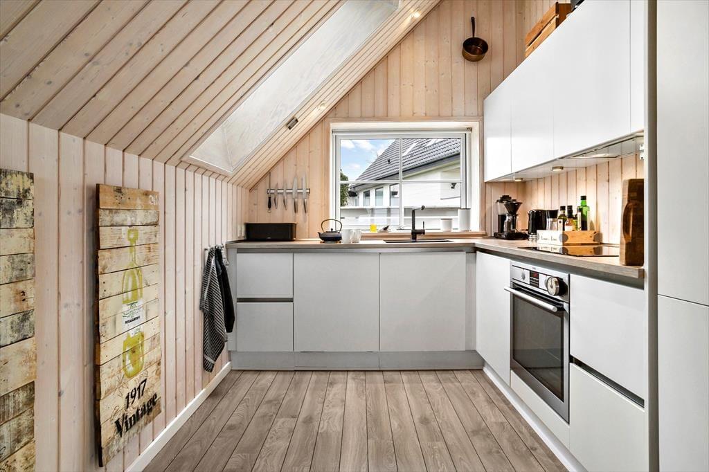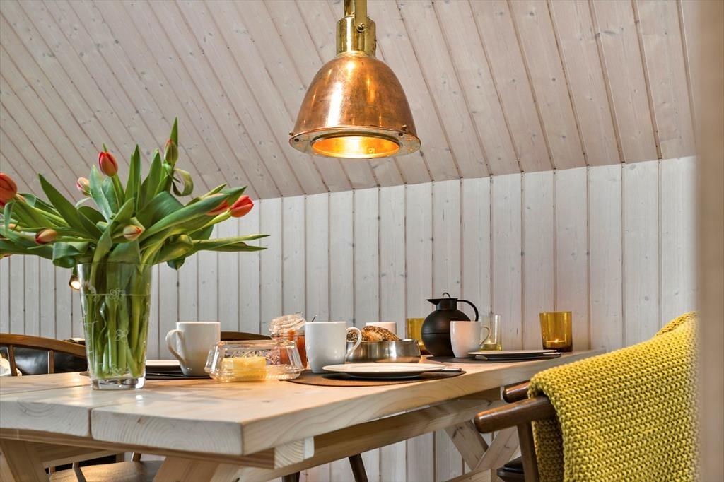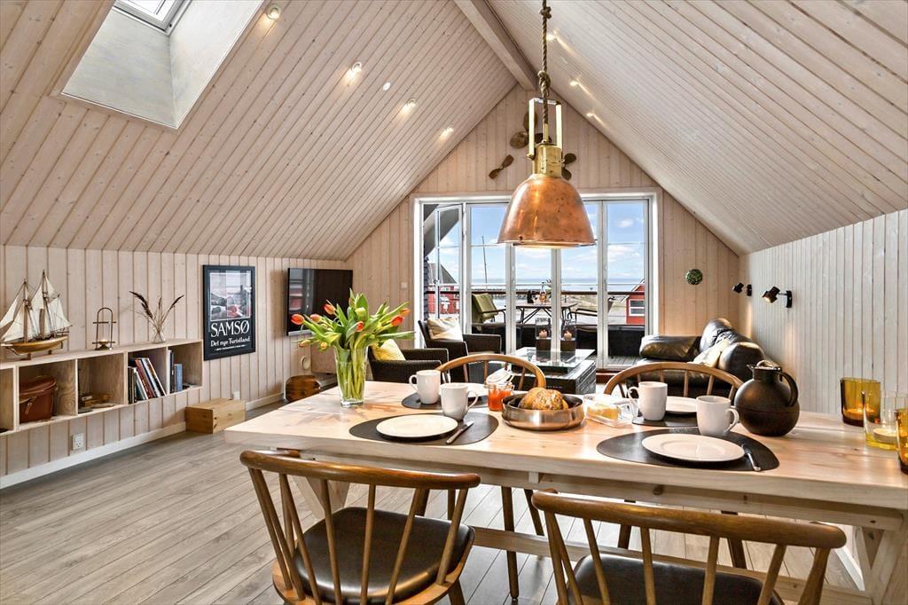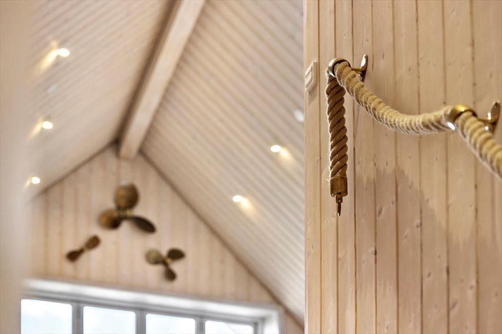 Stuen / køkkenalrummet er i gennemført lyst træ, og de maritime detaljer i indretningen giver en hyggelig atmosfære, så du mærker, at huset er tæt på havnen og havet. Her kan I med garanti få mange hyggelige timer sammen.