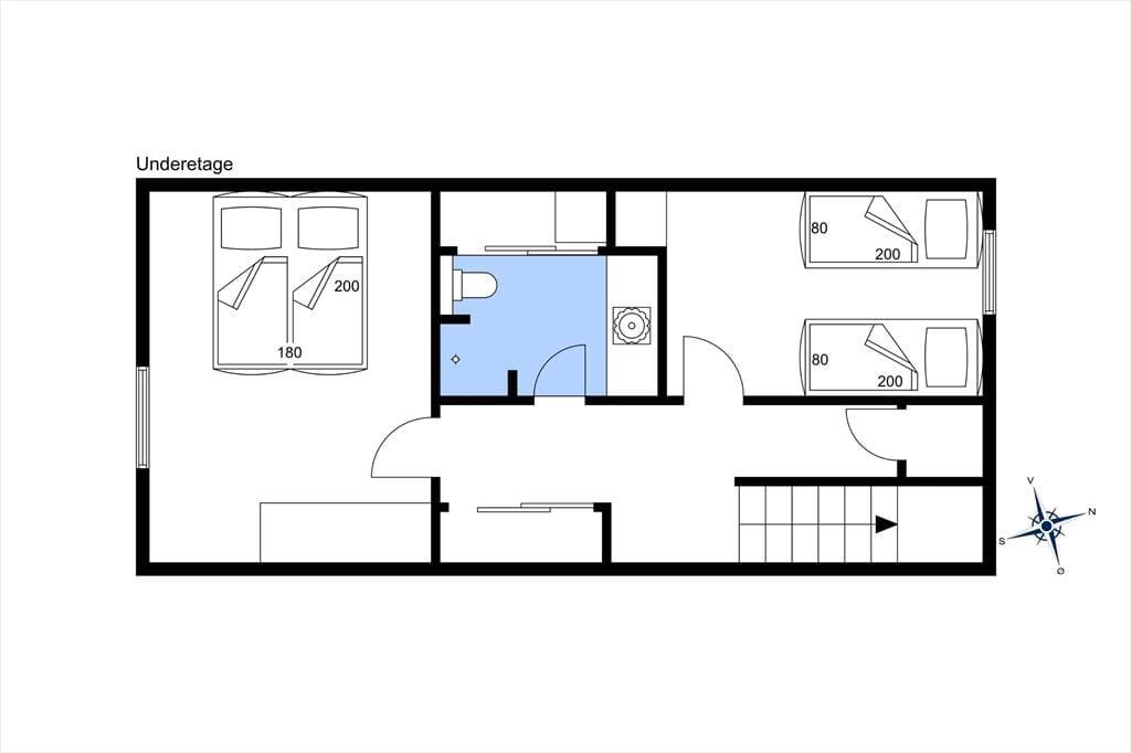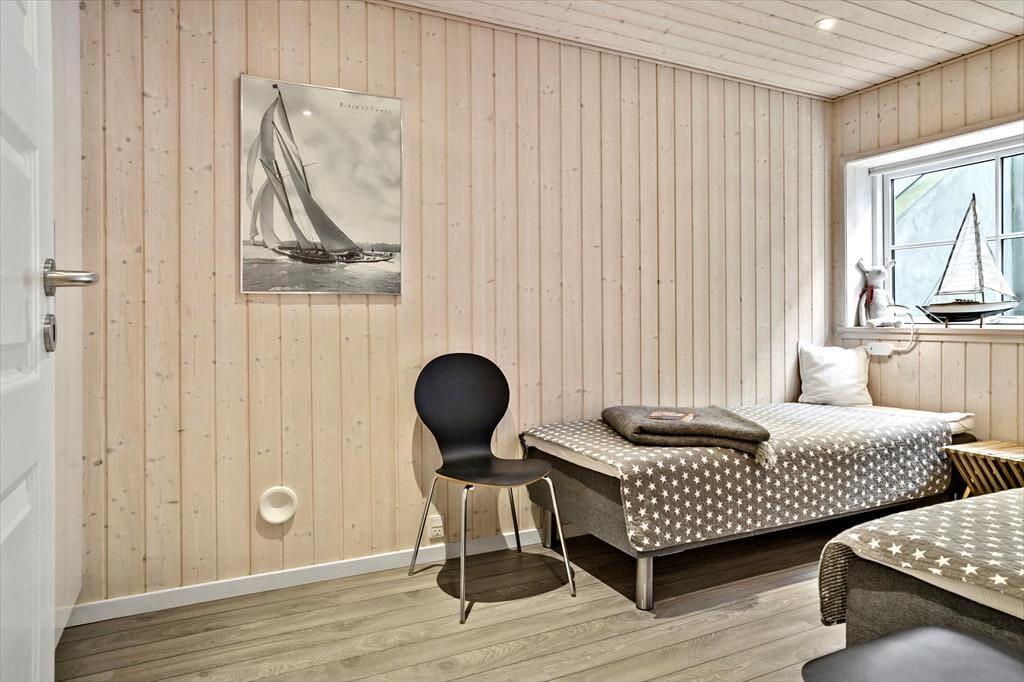 I stueetagen er husets to soveværelser og badeværelset. De lyse trævægge og lofter går igen, så stilen er gennemført i hele huset. Det ene soveværelse har en komfortabel dobbeltseng, et skrivebord og opbevaringsplads. Soveværelset har udsigt til havnen men du finder samtidig helt ro, og kan uden tvivl få en god nats søvn.