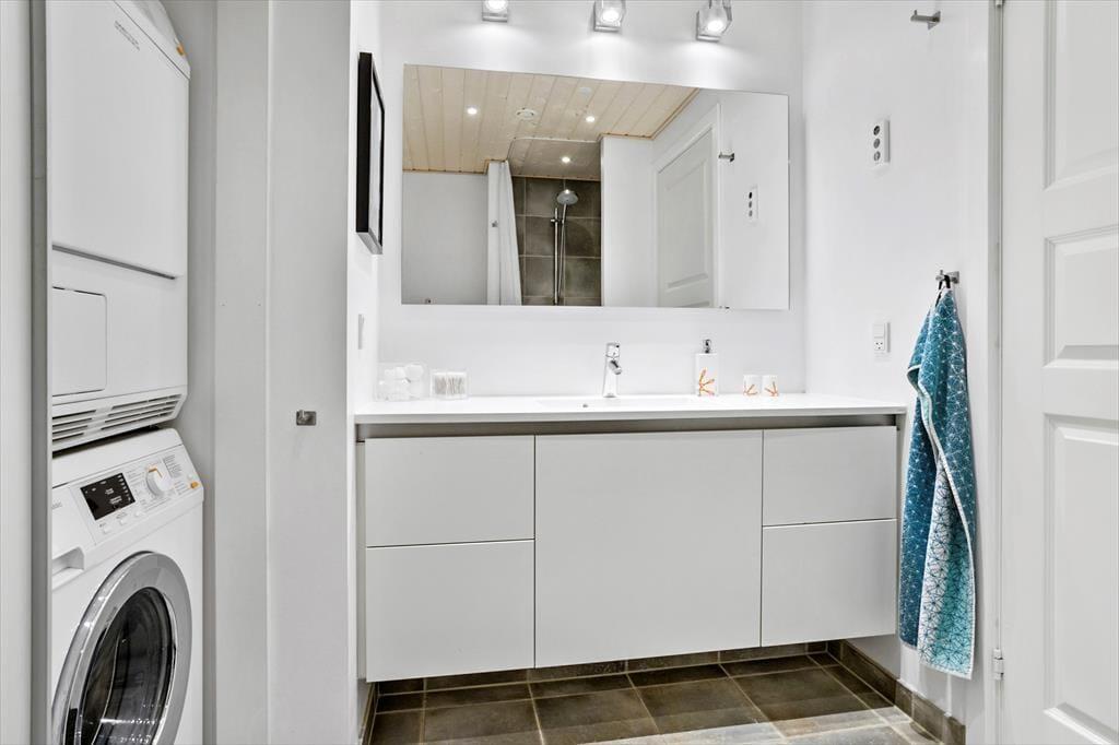 Det andet soveværelse har to enkeltmandssenge, der kan skubbes sammen til en dobbeltseng, som det passer jer bedst. Her er også opbevaringsplads og et vindue ud mod den lille gård. Ved siden af soveværelserne er det lyse badeværelse, hvor du også finder vaskesøjle med vaskemaskine og tørretumbler.