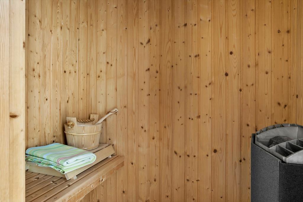 I huset er to badeværelser, hvoraf det største badeværelse et lyst og indbydende med direkte udgang til terrassen mod havet. I dette badeværelse er også en sauna og vaskemaskine samt tørretumbler, så der er tænkt på alle fornødenheder, når ferien skal nydes til fulde. Det mindre badeværelse giver en ekstra komfort, når I er op til 8 gæster i huset.