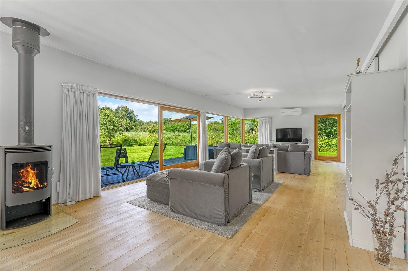 Det energivenlige sommerhus er udstyret med 1 luft til luft varmepumpe, gulvvarme i stue, køkken og alrum samt mulighed for at hygge foran brændeovnen.