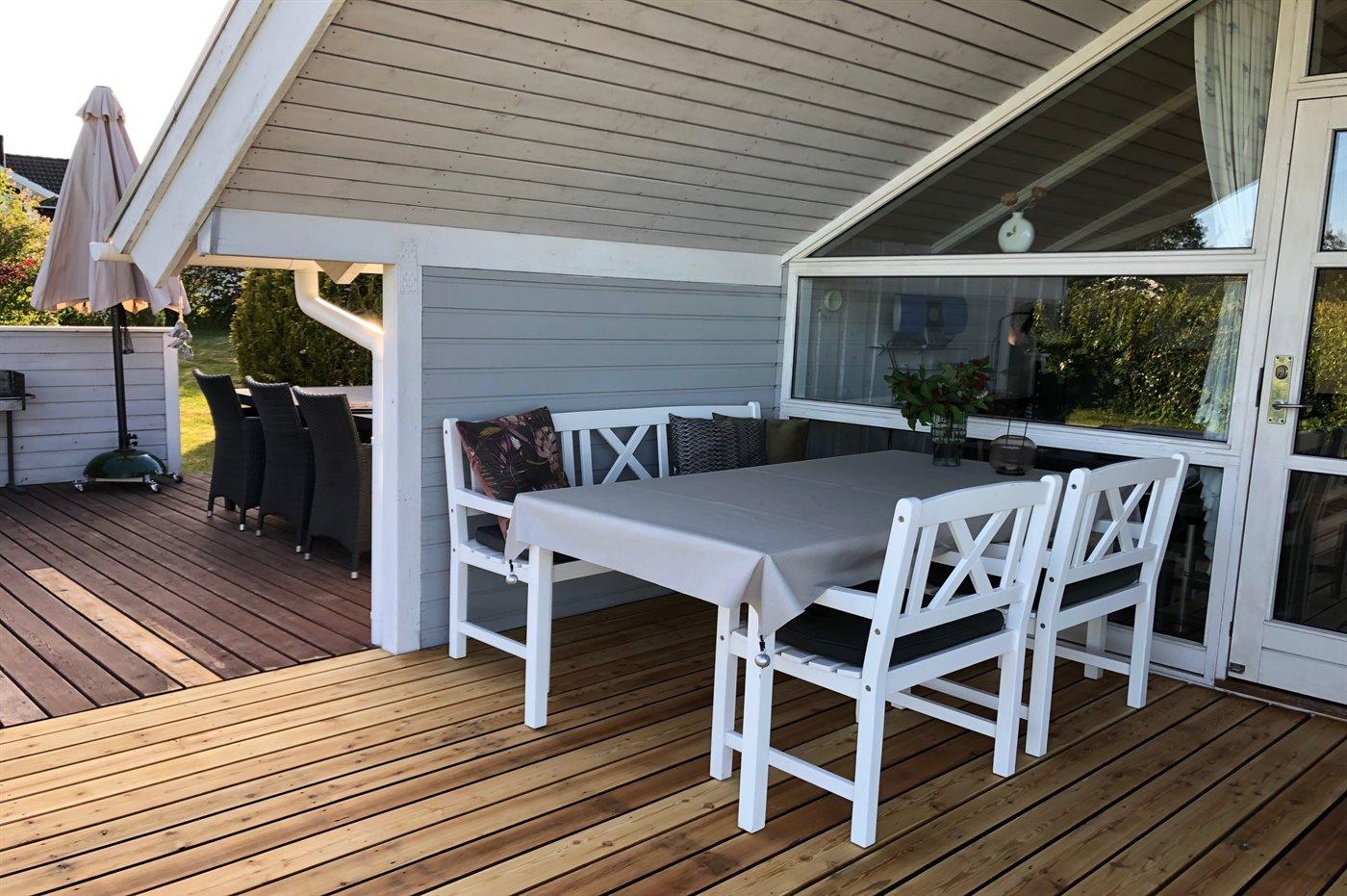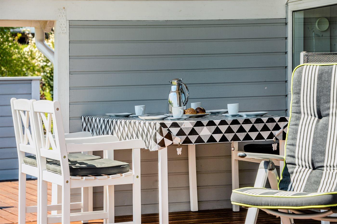 Ferieboligen er beliggende på en 1100 m² stor havegrund. Der er 200 m til havet. Nærmeste forretning er beliggende i en afstand af 5000 m. Til ferieboligen hører 60 m² terrasseareal. Desuden er der 12 m² overdækket terrasse. Der er redskabsrum. Gynge. Sandkasse. Grill til rådighed. Parkering ved ferieboligen.