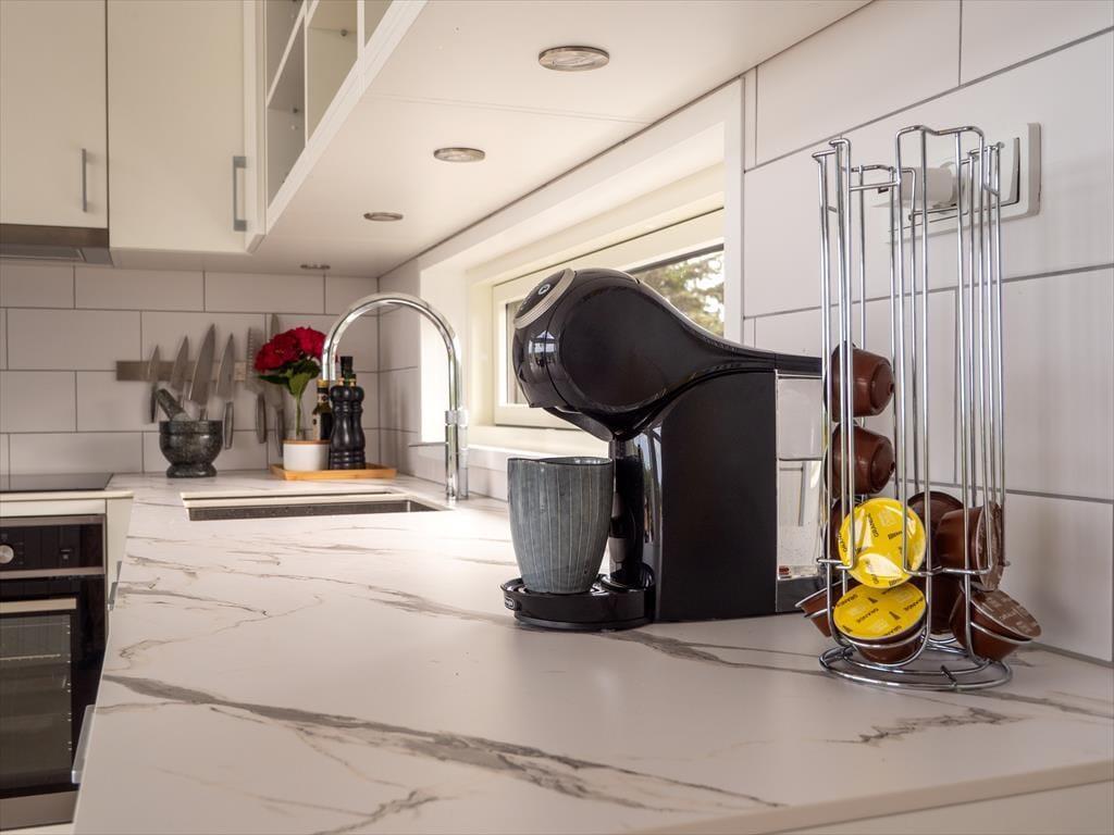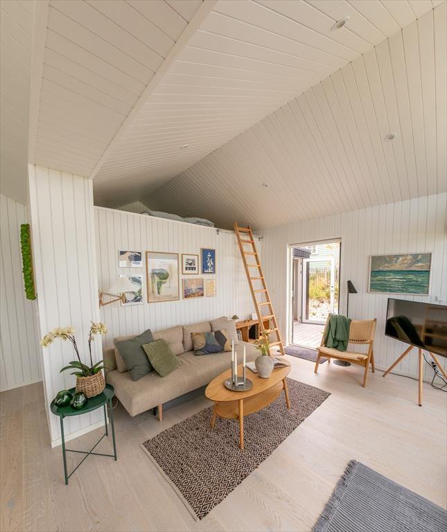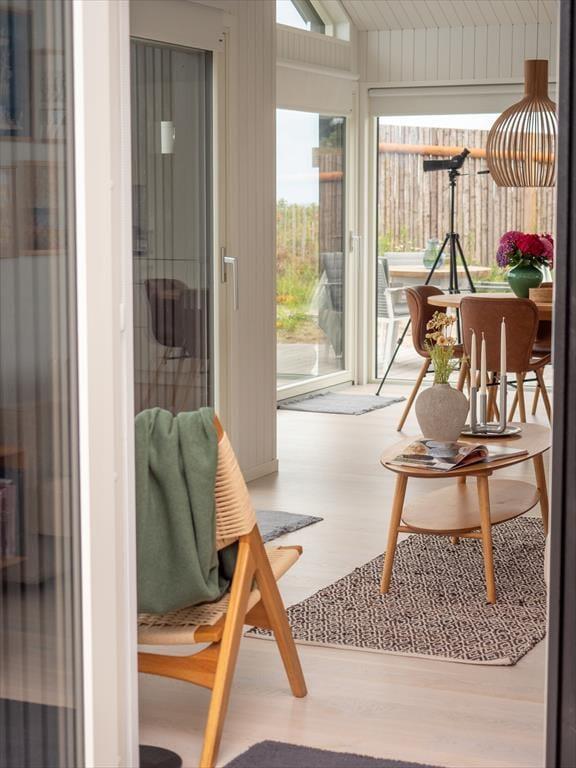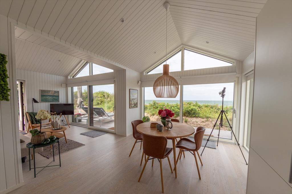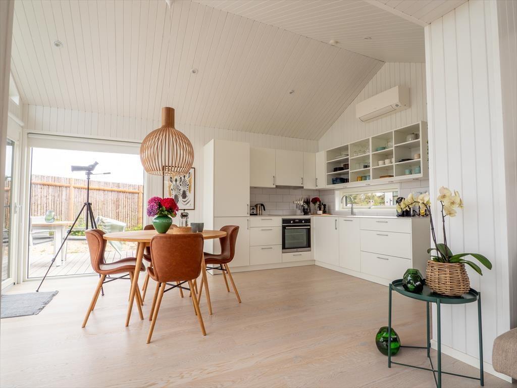 Det nyopførte sommerhus er gennemført til mindste detalje og indrettet med omtanke for både komfort og æstetik. Her er plads til to voksne og to børn – enten fordelt på soveværelset og hemsen eller med ekstra opredning på sovesofaen i stuen. Rummene er lyse, funktionelle og udnyttet optimalt, og overalt fornemmer man, at huset er skabt til ferie. Det moderne køkken ligger i åben forbindelse med spiseplads og opholdsstue, og selvom huset ikke er stort, mærkes det ikke – for overalt inviterer vinduer og døre naturen indenfor. Det hele emmer af afslappet luksus og af tid til bare at være.