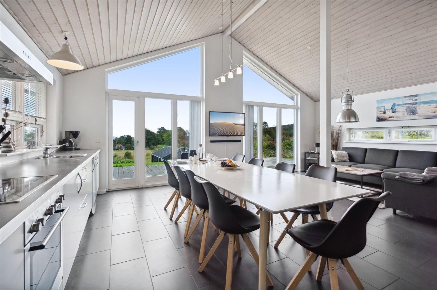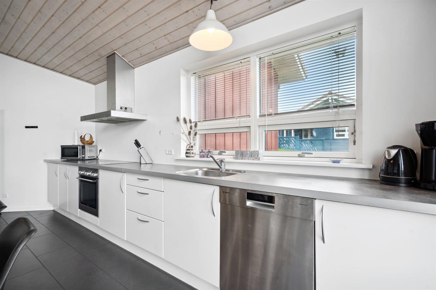 Køkkenet er udstyret med 1 køleskab. Der er 4 keramiske kogeplader, varmluftovn, mikrobølgeovn samt opvaskemaskine.