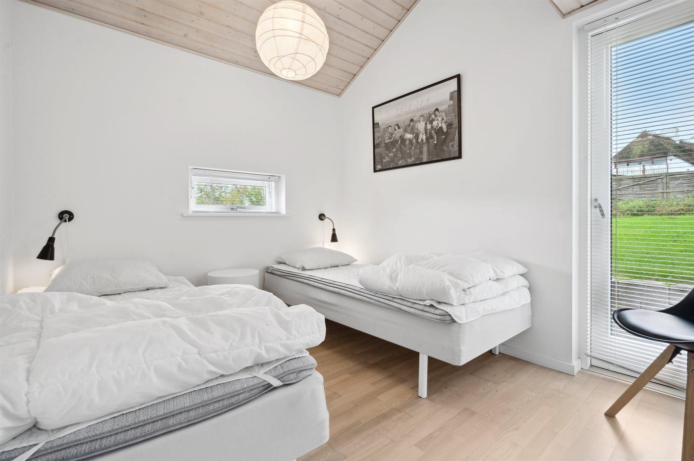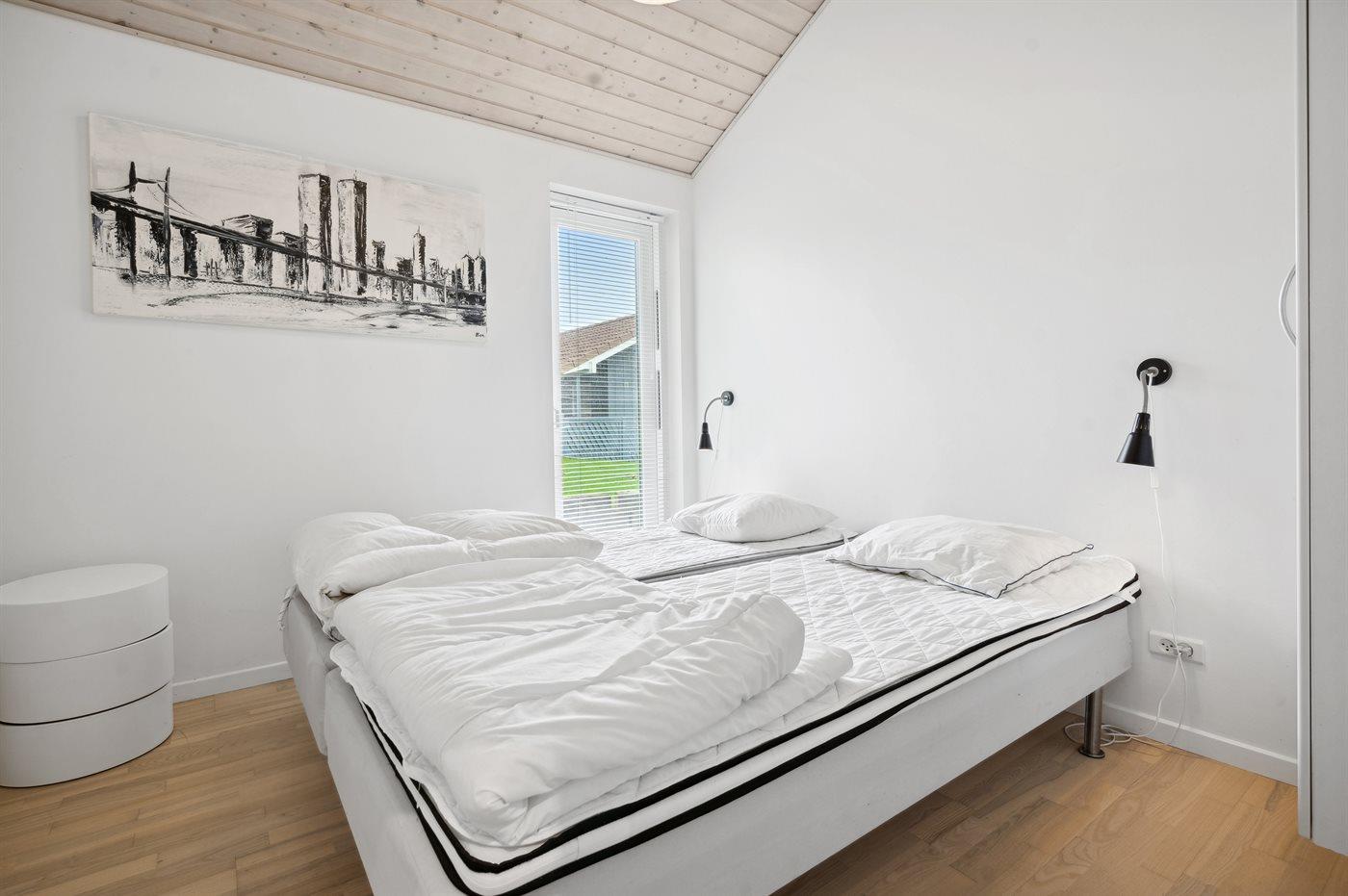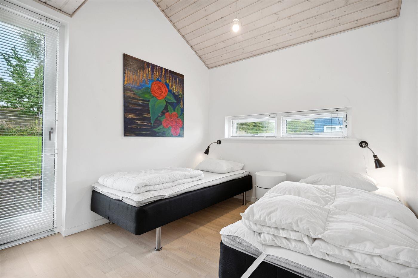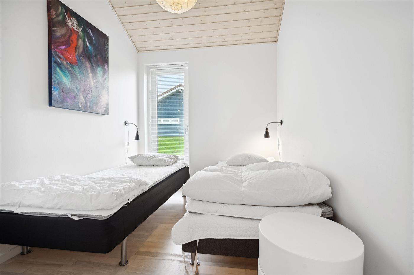 Der er i alt 4 soveværelser. Sovepladserne fordeler sig på: 8 sovepladser i dobbeltsenge. 2 sovepladser på madrasser. 2 af disse sovepladser befinder sig på husets hems. Derudover er der 1 stk. barneseng.