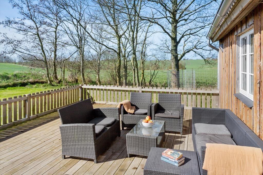 Udover haven med en god græsplæne til leg og afslapning, er det en stor terrasse med direkte udgang fra stuen. På terrassen er der gode havemøbler, hvor I kan sætte jer og spise sammen og endda tilberede måltiderne på den åbne grill. På terrassen er der også gode lounge-havemøbler samt en stor hængekøje, som du med garanti kan få en god middagslur i.