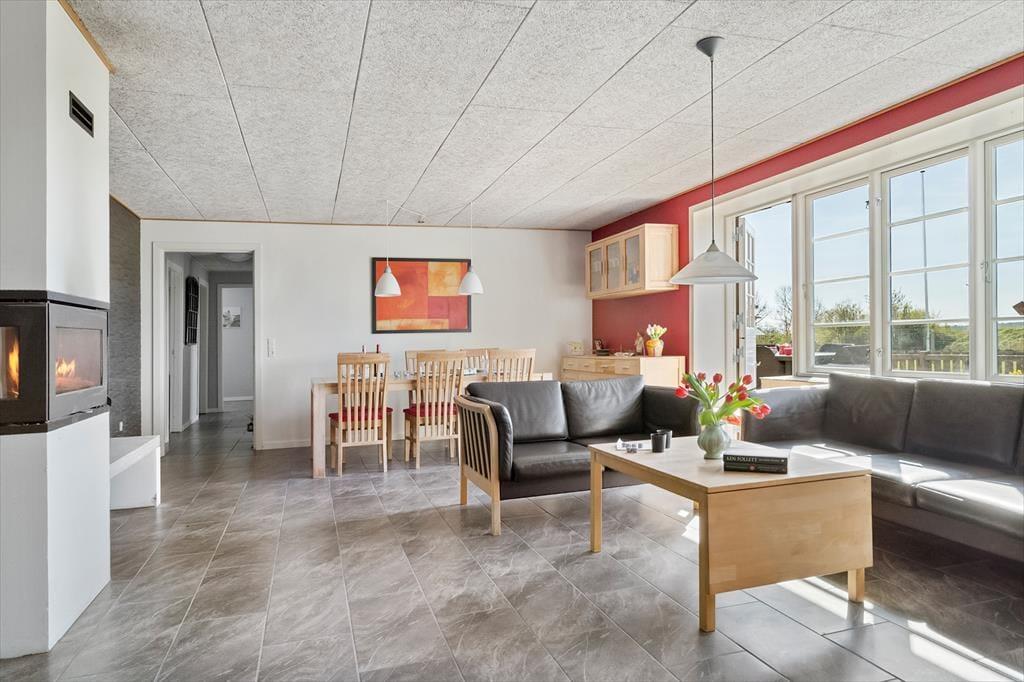 Huset er indrettet funktionelt og hyggeligt med to gode stuer og samlingsrum. I den ene stue er et godt spisebord, hvor I let kan dække op til alle feriens måltider. Her er også en sofa foran brændeovnen, så det er let at tænde op for hyggen og varmen. Fra stuen er der direkte udgang til den store og sydvendte terrasse. Når vejret er godt, bliver denne terrasse næsten som et ekstra opholdsrum, hvor det er perfekt at sætte sig udenfor med feriens måltider.
