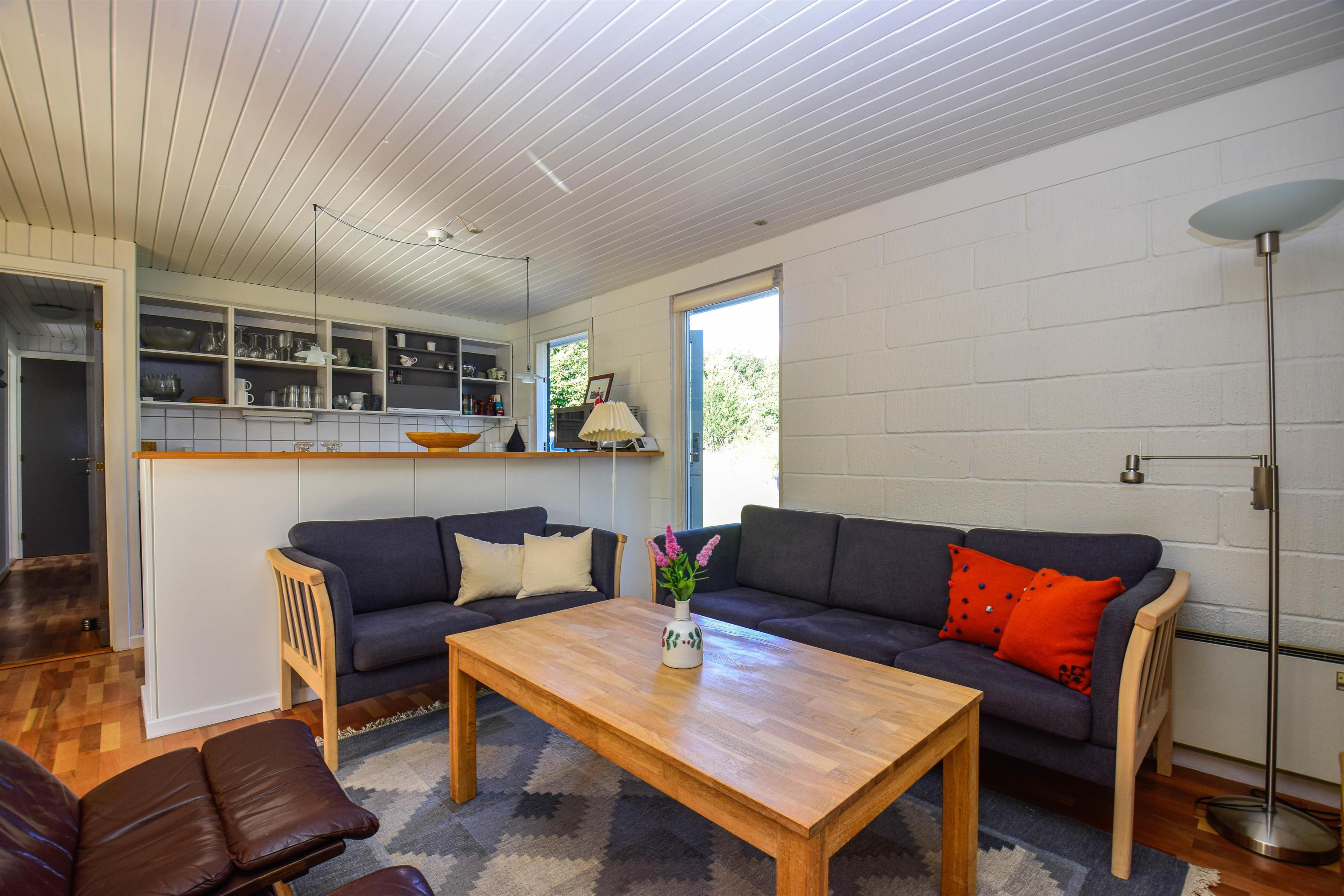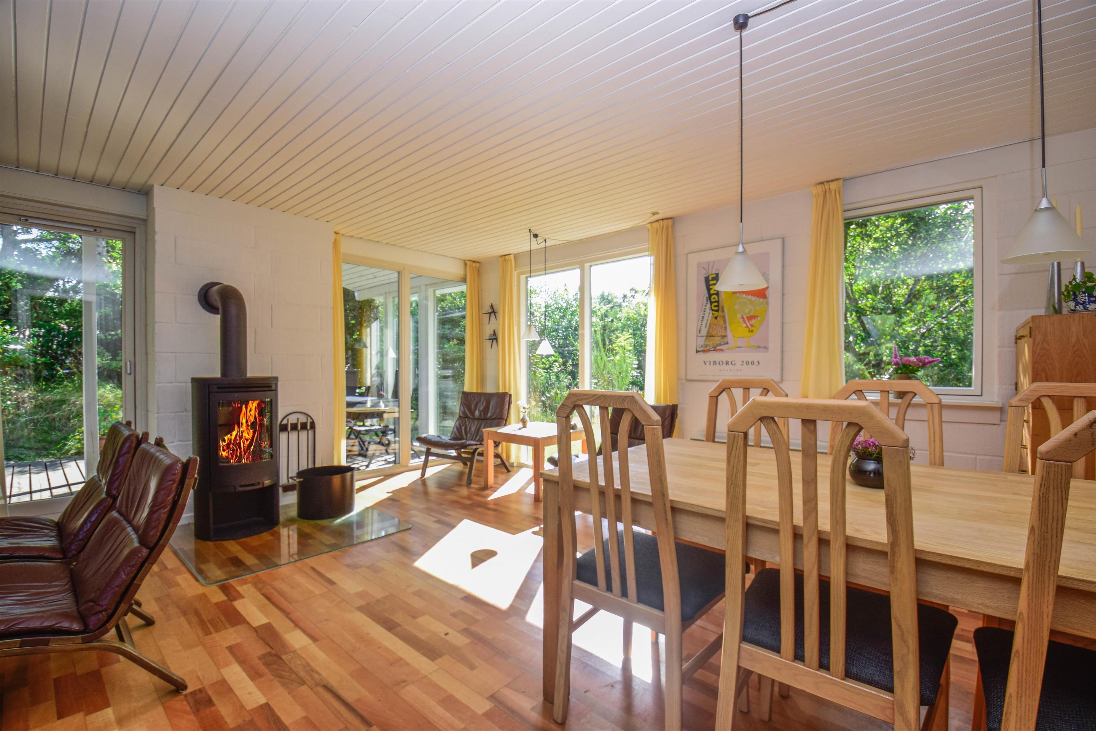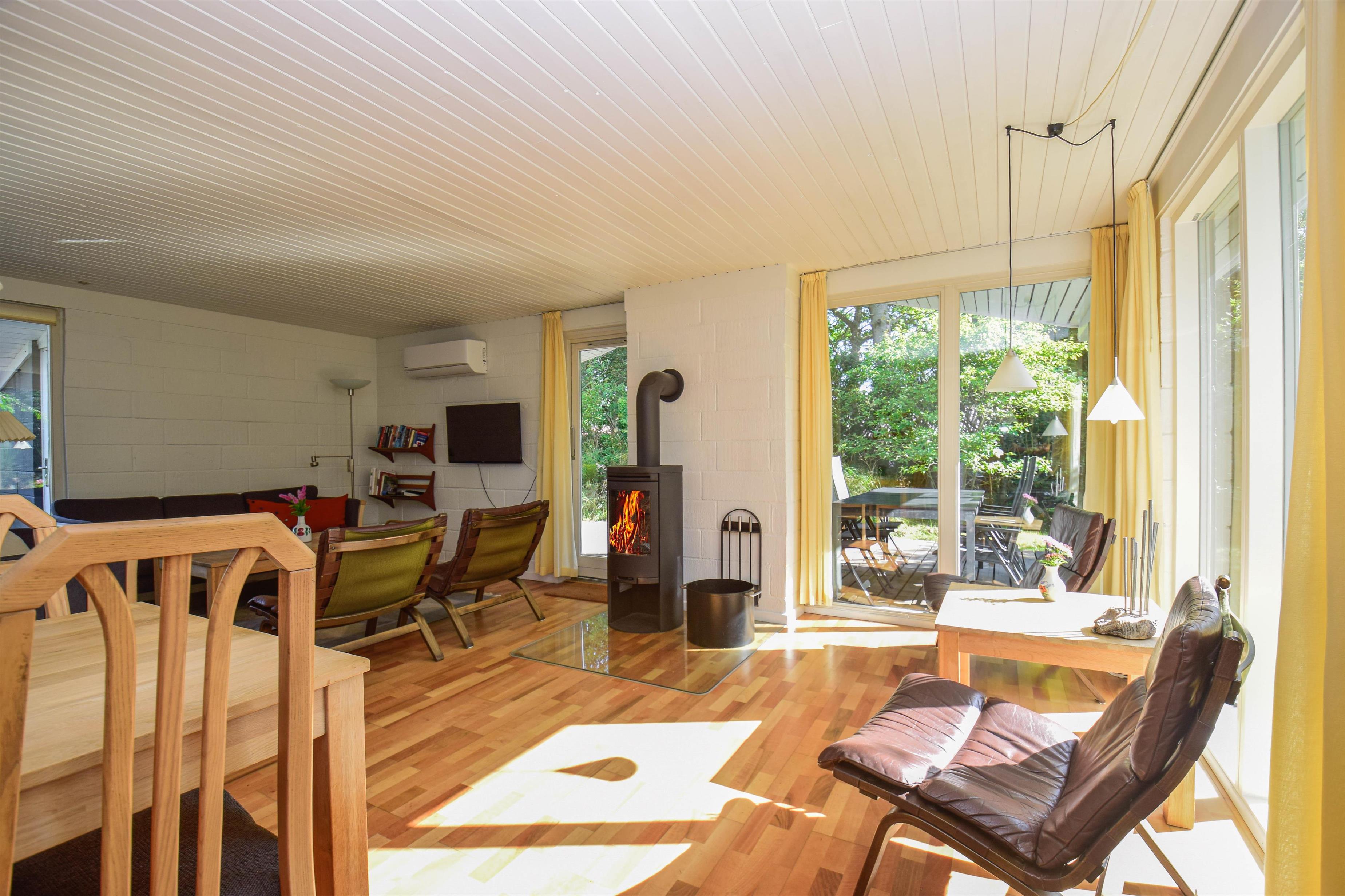 I det åbne opholdsrum er der køkken, spiseplads og sofaområde med brændeovn, som spreder varme og stemning på kølige dage.