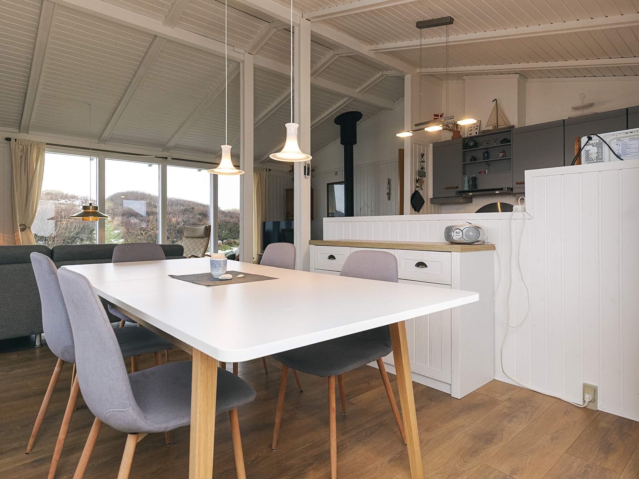Sommerhusets hjerte udgøres af et stort og åbent opholdsrum med loft til kip i forbindelse med dejligt køkken/spiseplads og stor alkove, hvor I kan hygge jer med en god bog, mens I nyder varmen fra den knitrende brændeovn. Her er plads til at alle kan mødes og hygge med madlavning, måltider, spil, en god film eller hvad humøret nu lige dikterer. Fra opholdsrummet har I gennem de høje vinduer et fantastisk blik over klitterne mod havet. Der er rummeligt badeværelse med bruser og tre gode soveværelser med skabsplads. Fra stuen er der adgang til den sydvest-vendte terrasse, hvoraf en del er overdækket. Her er der gode muligheder for at nyde sommerens sol og varme samt de fantastiske omgivelser og den flotte natur. Der er havemøbler, liggestole og grill til rådighed. På terrassen mod syd er der mulighed for at lukke af og her er der gode mulighed for at finde læ.