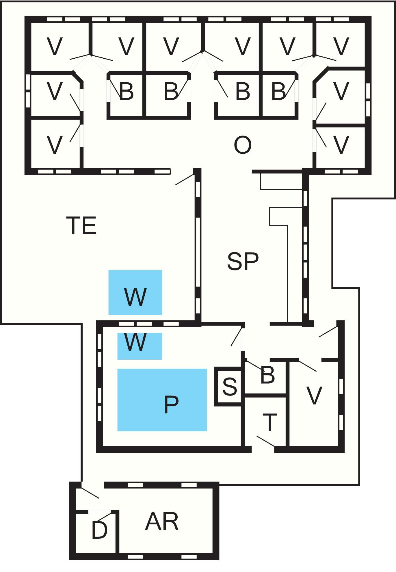 Huset har 10 soveværelser med dobbeltsenge og et værelse med en dobbeltseng og en køjeseng til to personer. Derudover er der fire hemser med i alt fire sovepladser, fem badeværelser, hvoraf det ene er forbundet med wellnessområdet og fire i soveværelsesafdelingen. Der er terrasser næsten hele vejen rundt om huset og adgang fra stort set alle soveværelser direkte til terrasserne. Der er også en terrasse, som kan nydes hele året rundt. Det betyder, at der altid er læ og sol eller skygge til rådighed. Der er et vidunderligt aktivitetsrum med billard, dart og en spillekonsol (PlayStation). Huset har de mest moderne energikilder, såsom varmepumper og varmegenvinding, og der er gulvvarme i alle rum.