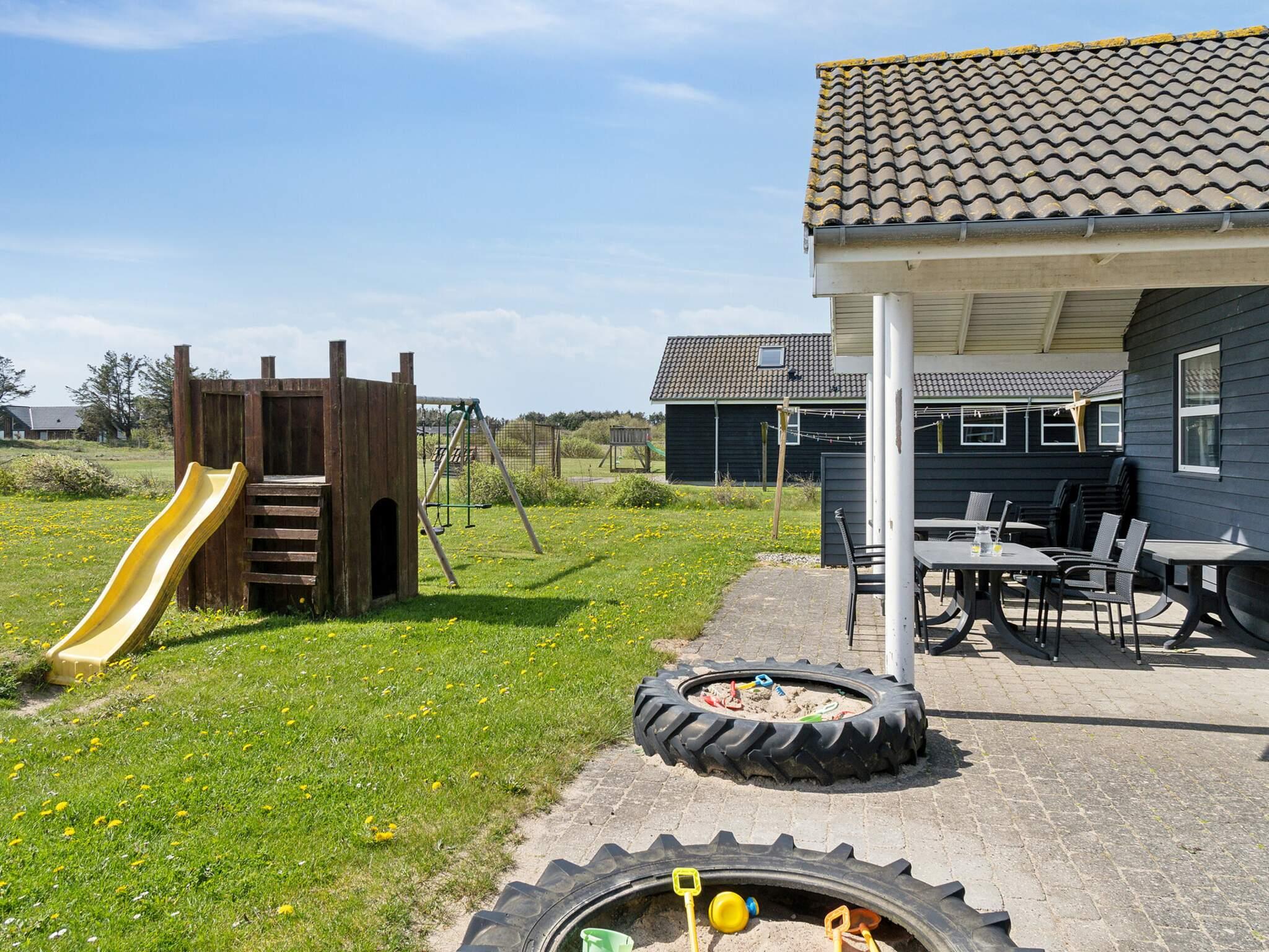 Lige ved siden af husets terrasse er der et legetårn med gynger, klatrevæg, rutschebane to små sandkasser, basketnet samt fodboldbane med to fodboldmål.