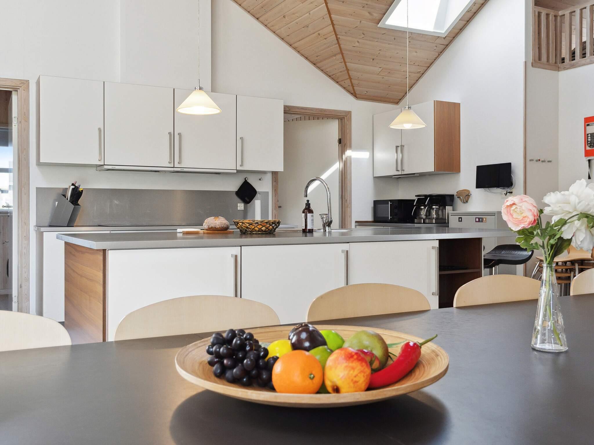 I køkkenet er der bl.a. "amerikaner" køleskab med ismaskine, 2 opvaskemaskiner, 2 komfurer, 2 ovne, samt 2 kaffemaskiner og masser af plads omkring den store vaskeø, hvor der også er mulighed for at sidde på barstole og lytte til musik fra stereoanlægget, som også har cd-afspiller.