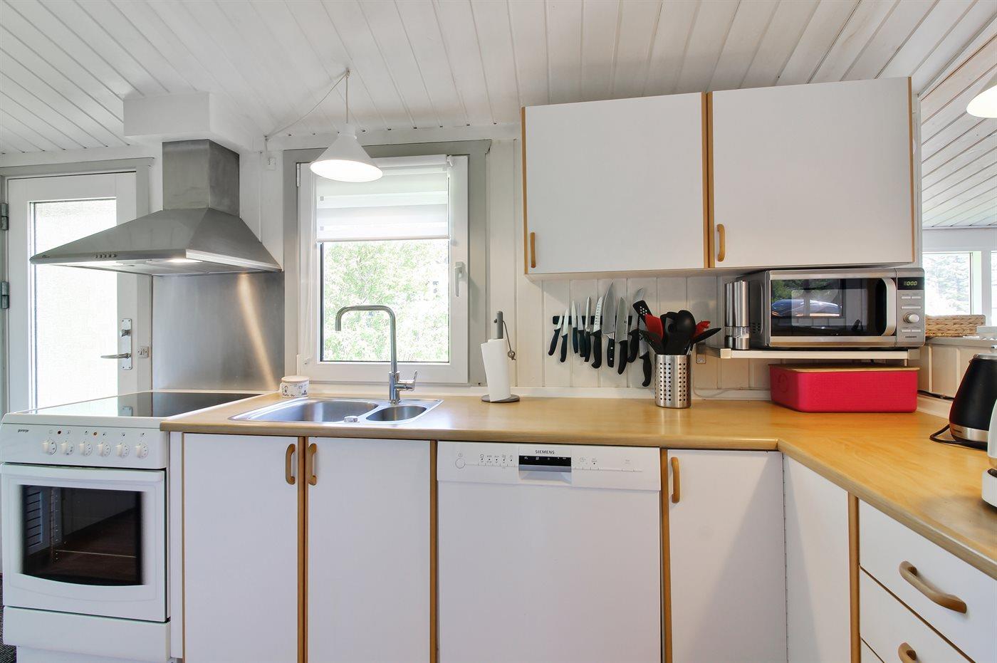 Køkkenet er udstyret med 1 køleskab. Der er 4 induktionskogeplader, varmluftovn, mikrobølgeovn samt opvaskemaskine.