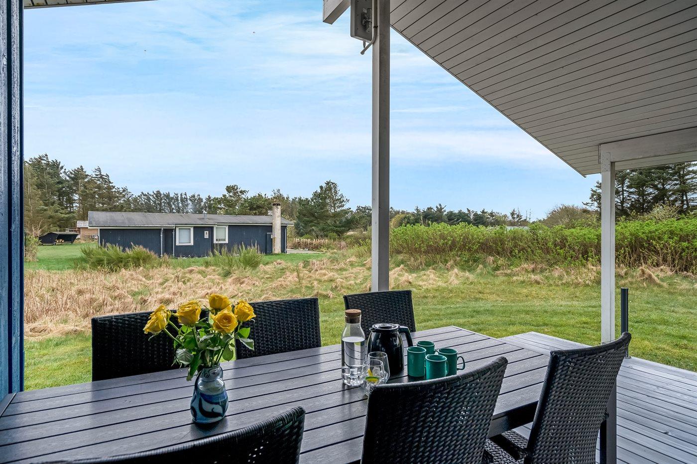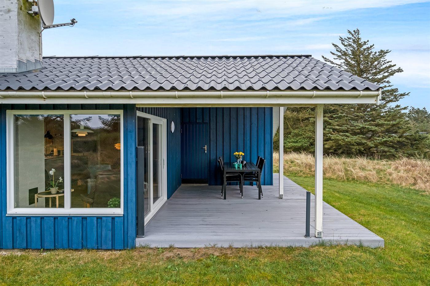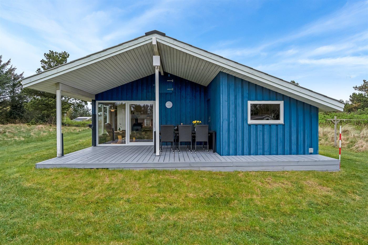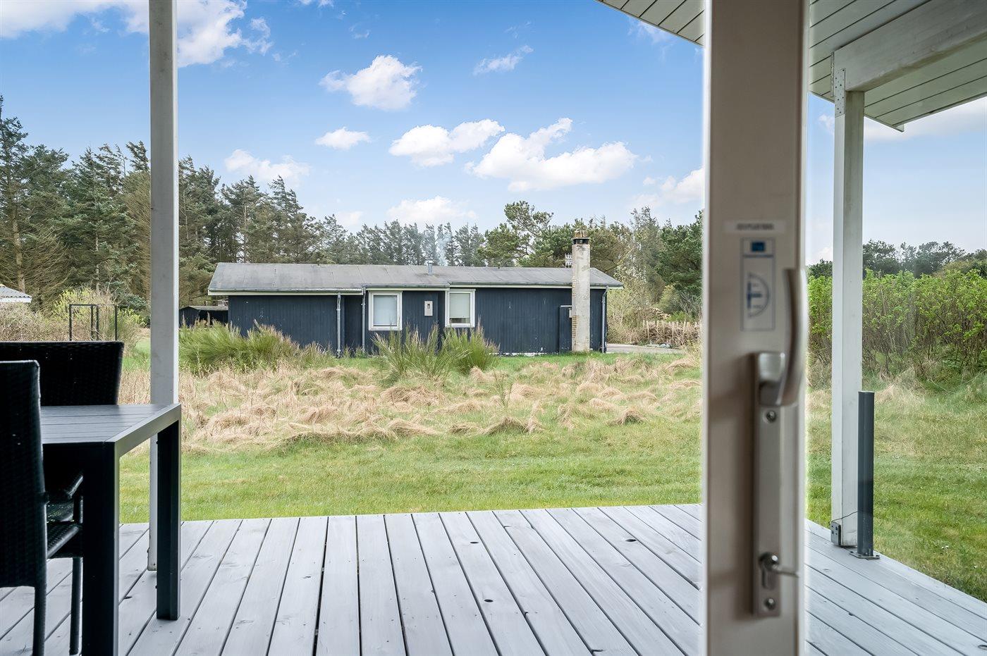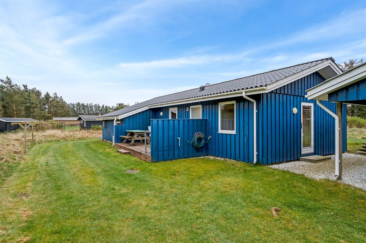 Ferieboligen er beliggende på en 2400 m² stor naturgrund. Der er 350 m til havet. Nærmeste forretning er beliggende i en afstand af 6000 m. Til ferieboligen hører 16 m² terrasseareal. Desuden er der 18 m² overdækket terrasse. Der er redskabsrum. Der er carport til rådighed. Der er installeret stik til opladning af elbil. Type 2 stik. Med 11 kW ladeeffekt. Parkering ved ferieboligen.