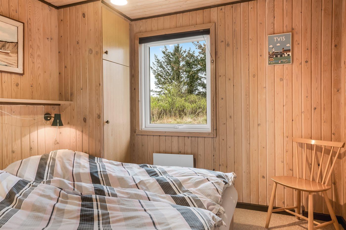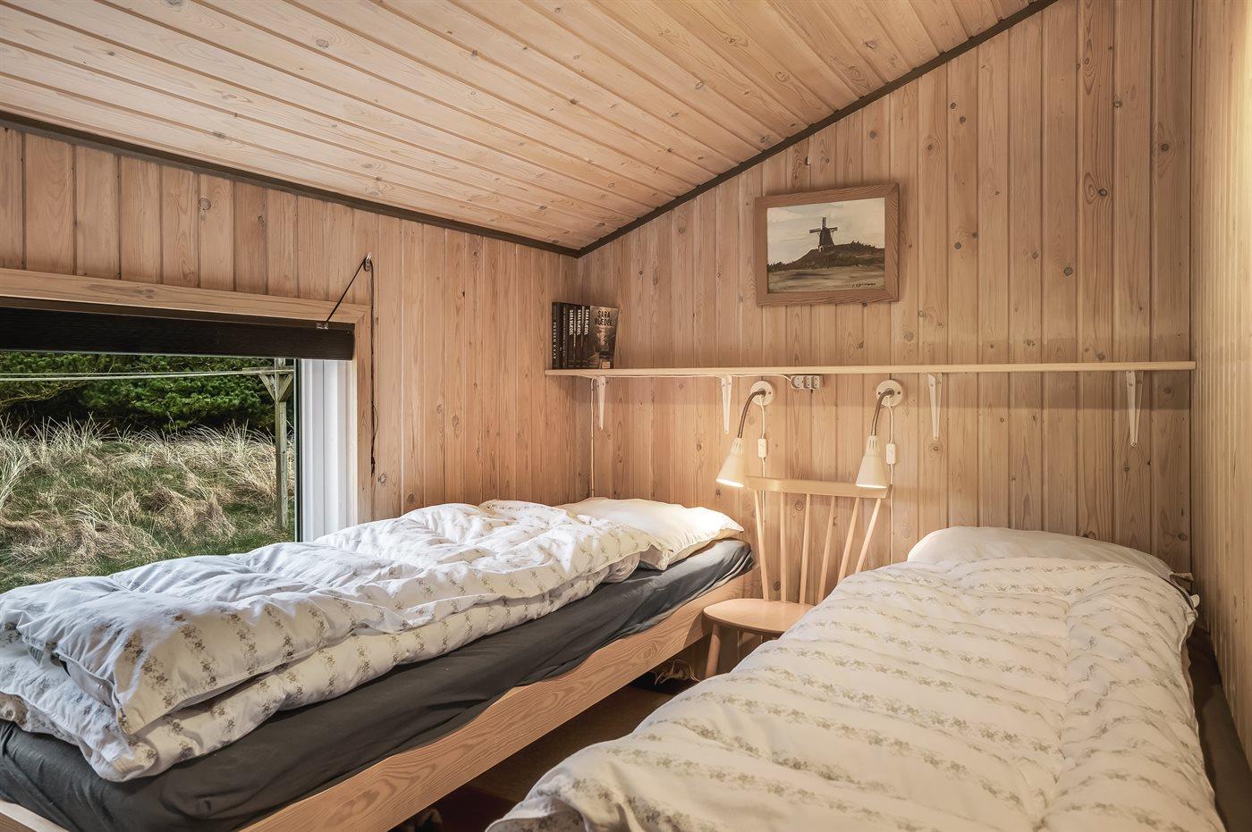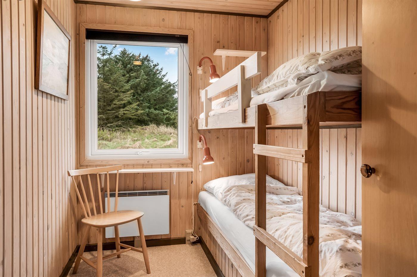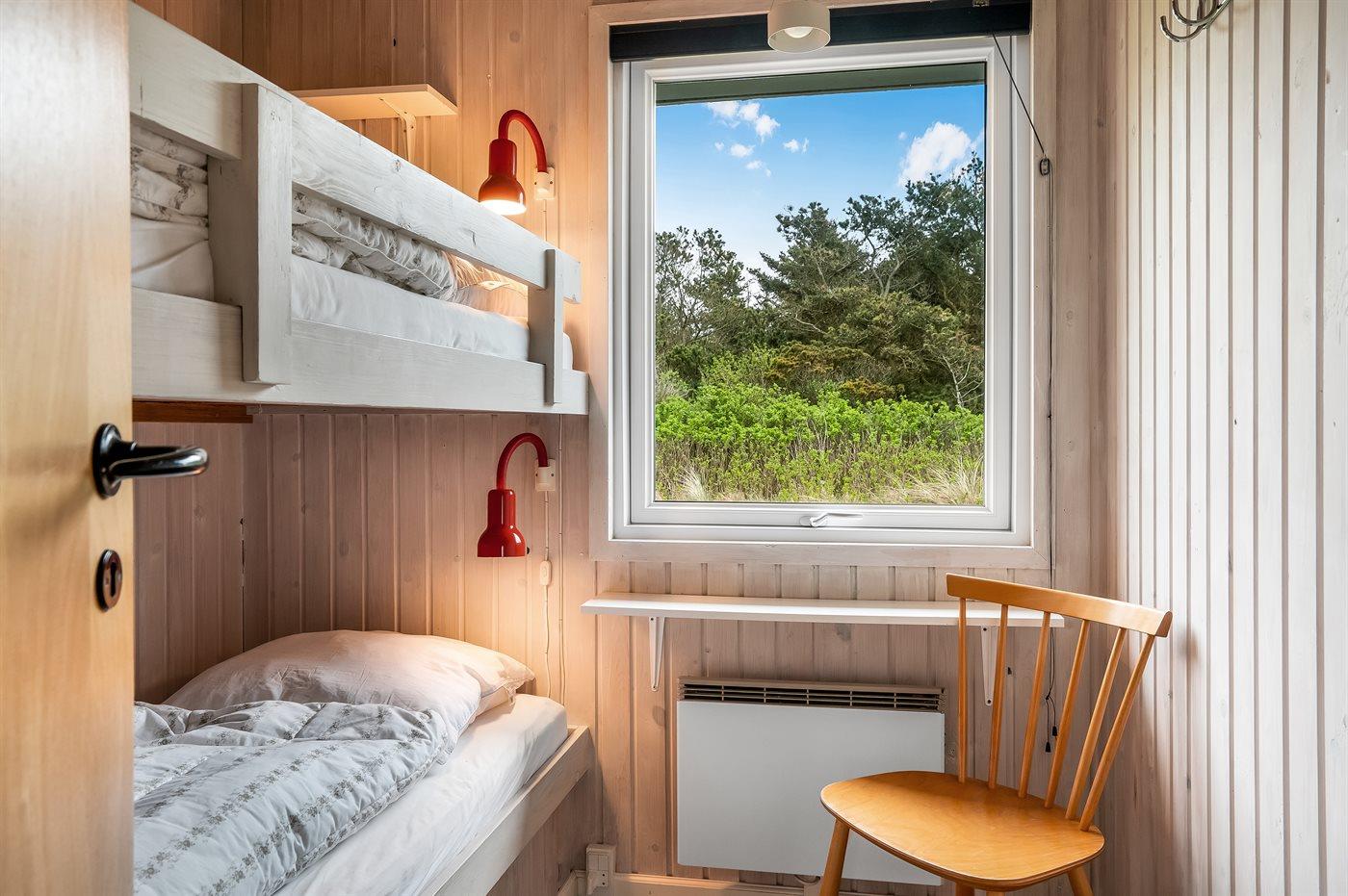 Der er i alt 4 soveværelser. Sovepladserne fordeler sig på: 2 sovepladser i dobbeltseng. 2 sovepladser i enkeltsenge. 4 sovepladser i køjesenge. Derudover er der 1 stk. barneseng.