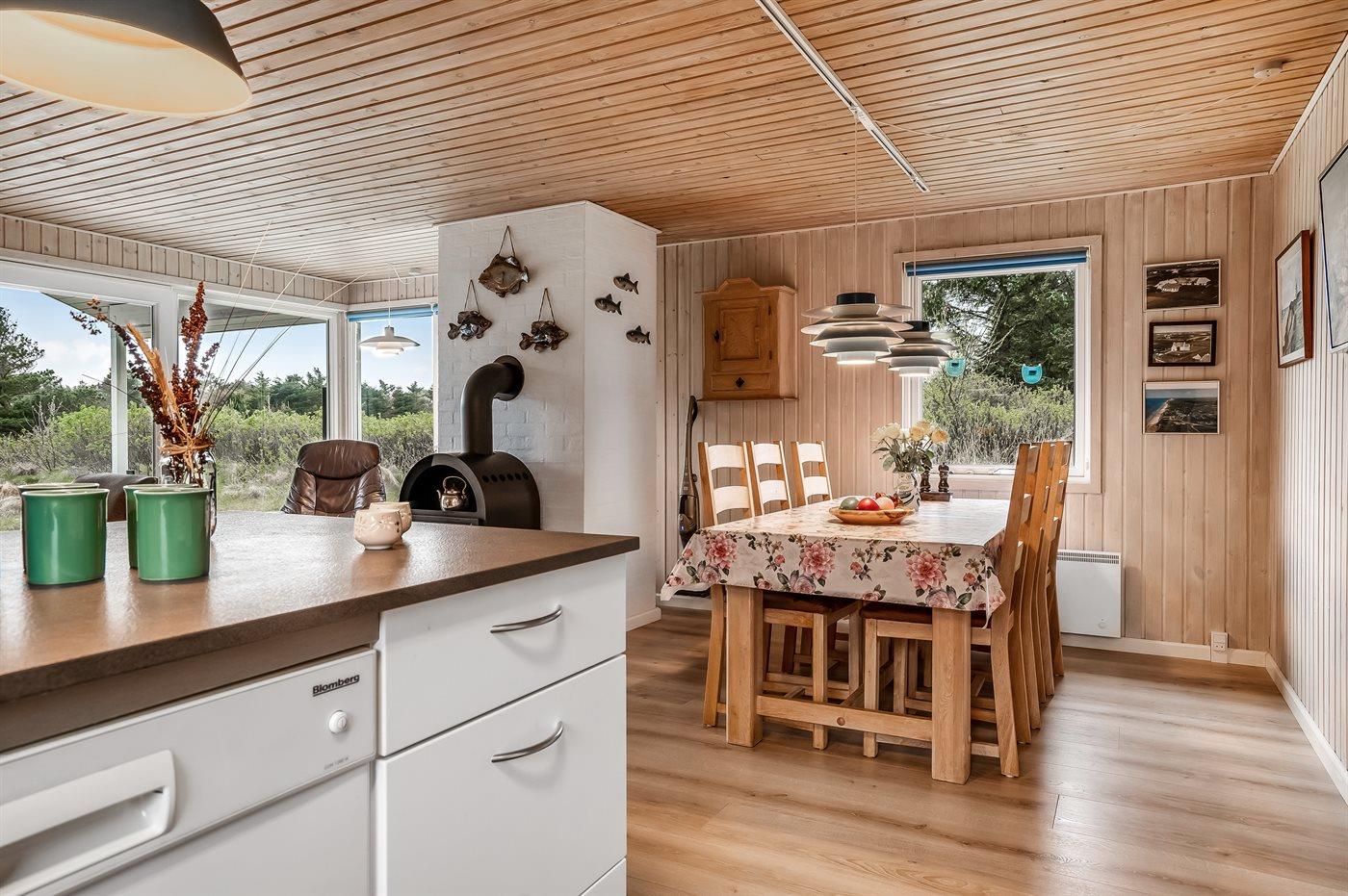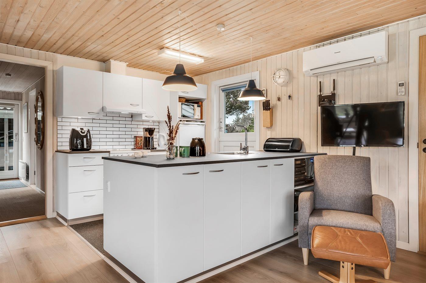 Køkkenet er udstyret med 1 køleskab. Der er 4 keramiske kogeplader, varmluftovn, mikrobølgeovn samt opvaskemaskine.