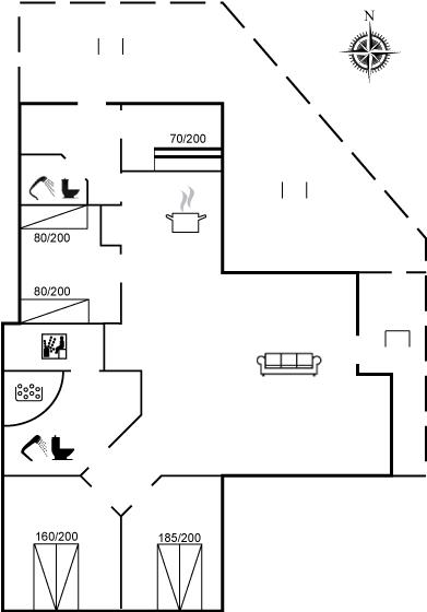 Der er 2 badeværelser med bruseniche og 2 toiletter. Der er gulvvarme på 2 badeværelser. I saunaen er der mulighed for afslapning.
