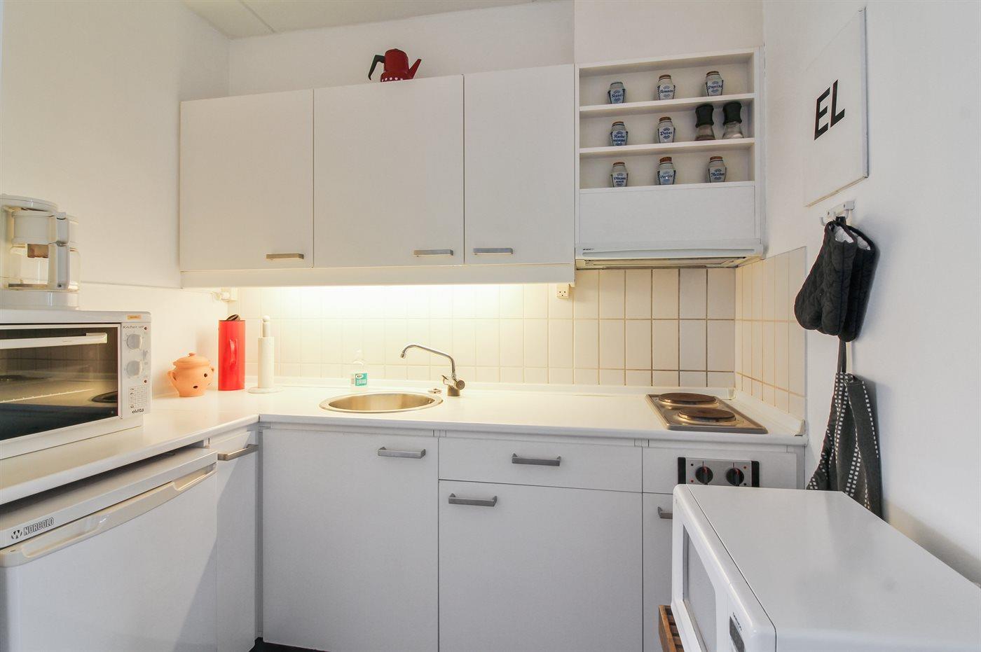 Køkkenet er udstyret med 1 køleskab. Der er 2 elkogeplader, miniovn, mikrobølgeovn.