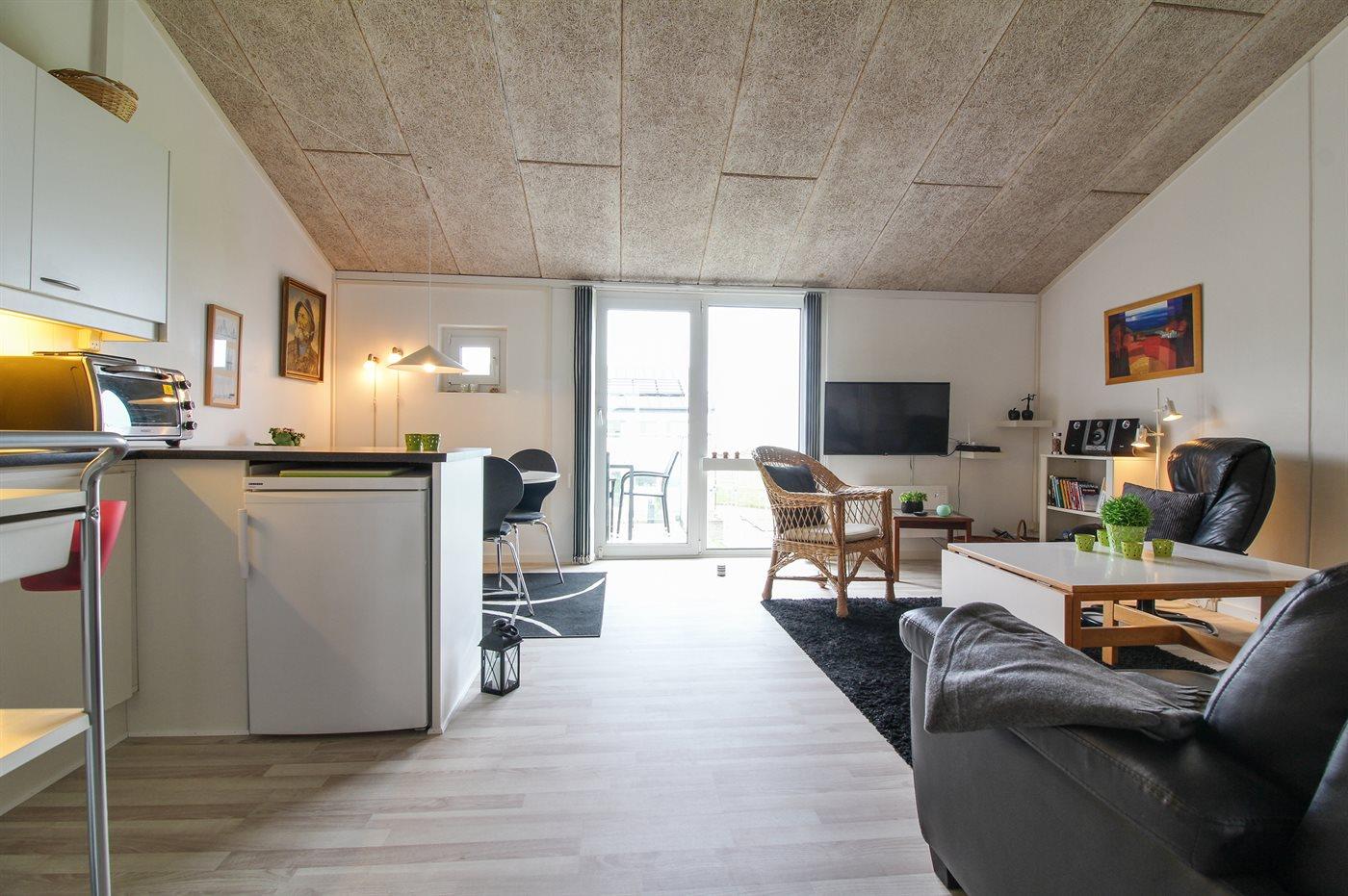 Køkkenet er udstyret med 1 køleskab. Der er 4 induktionskogeplader, miniovn, mikrobølgeovn samt opvaskemaskine.