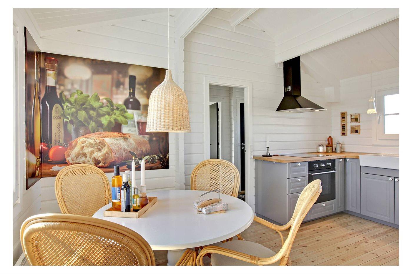 Køkkenet er udstyret med 1 køleskab. Der er 4 keramiske kogeplader, varmluftovn, mikrobølgeovn samt opvaskemaskine.