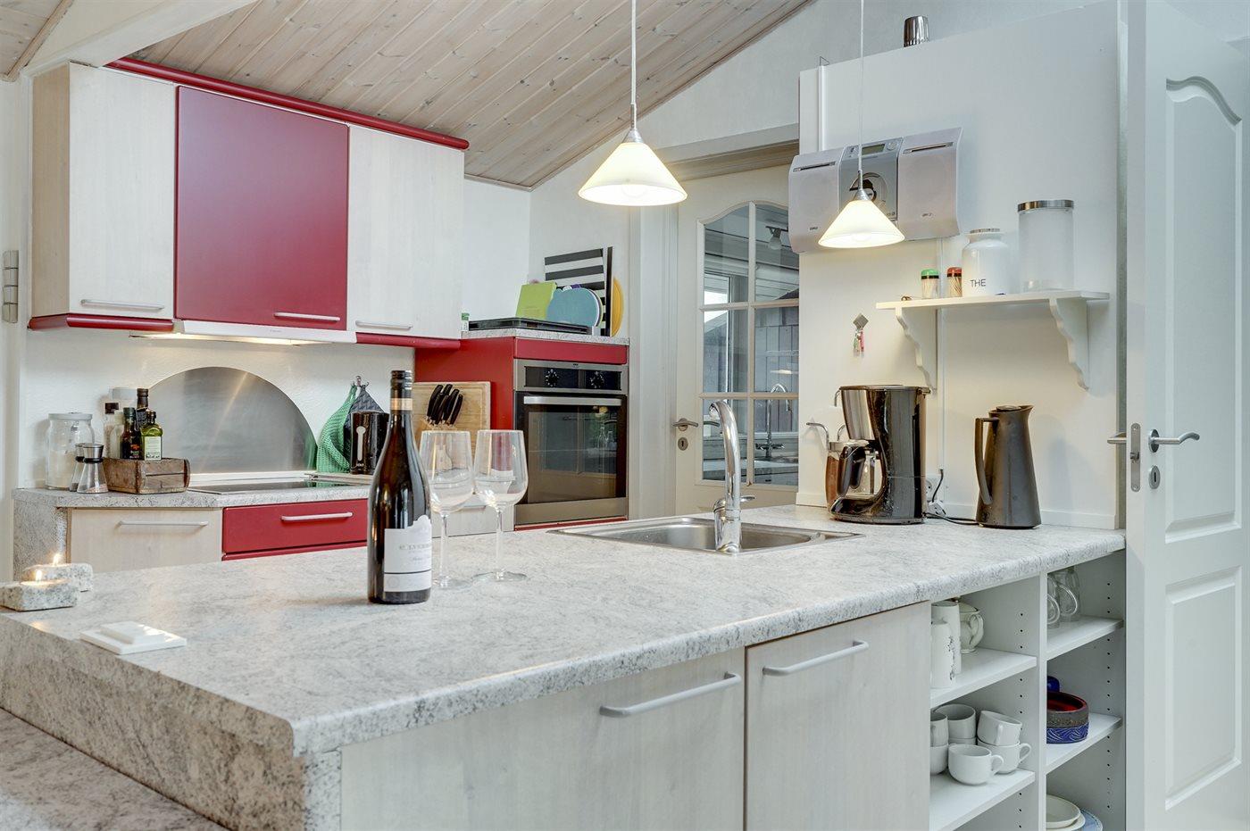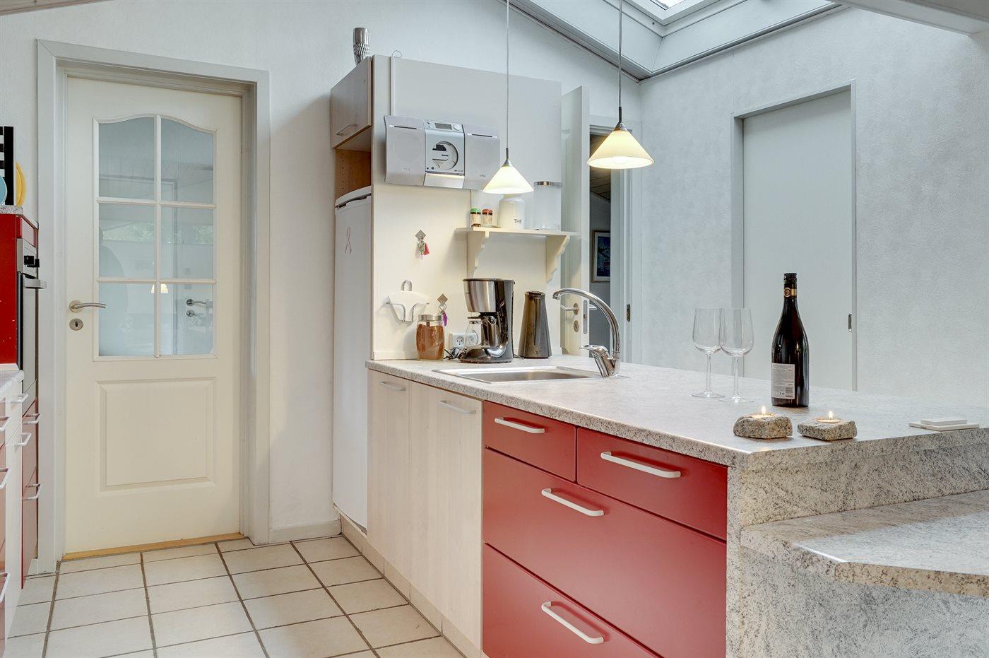 Køkkenet er udstyret med 2 køleskabe. Der er 4 keramiske kogeplader, varmluftovn, mikrobølgeovn samt opvaskemaskine Der er gulvvarme i køkkenet.