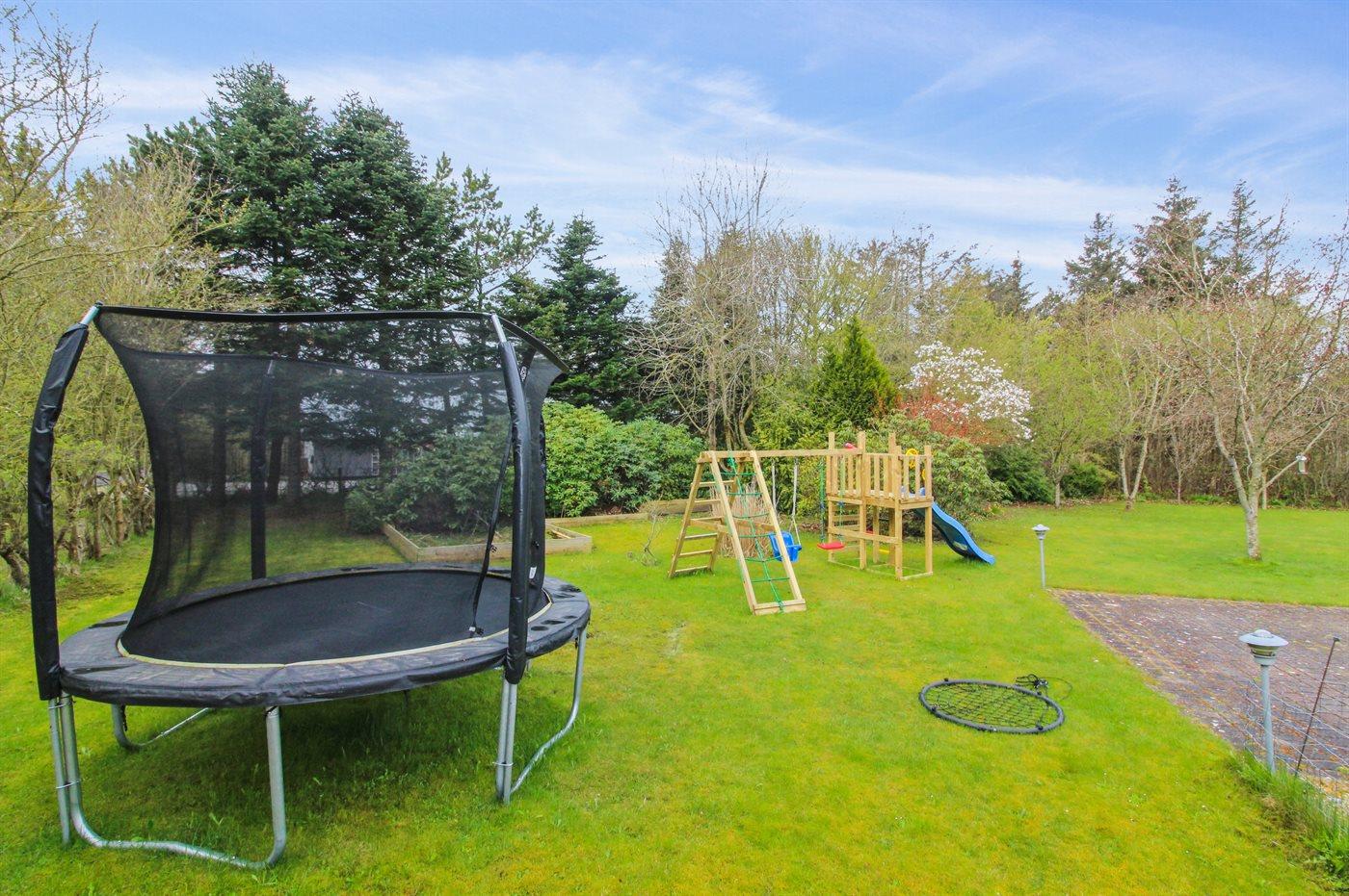 Hyggeligt sommerhus på stor, indhegnet grund nær havet og med indendørs spa og aktivitetsrum.