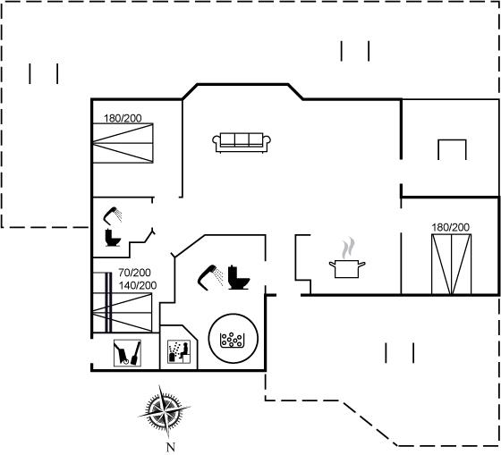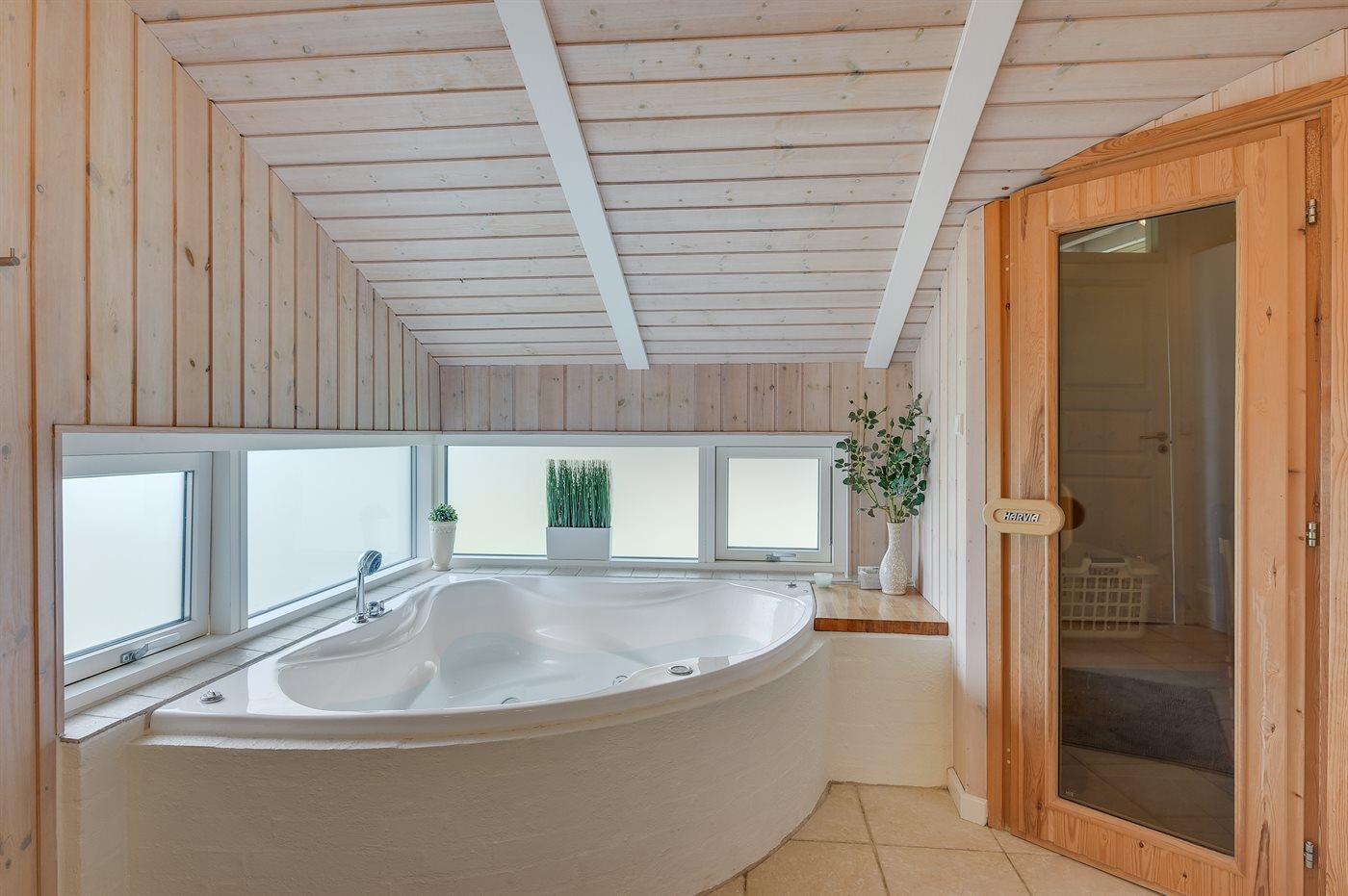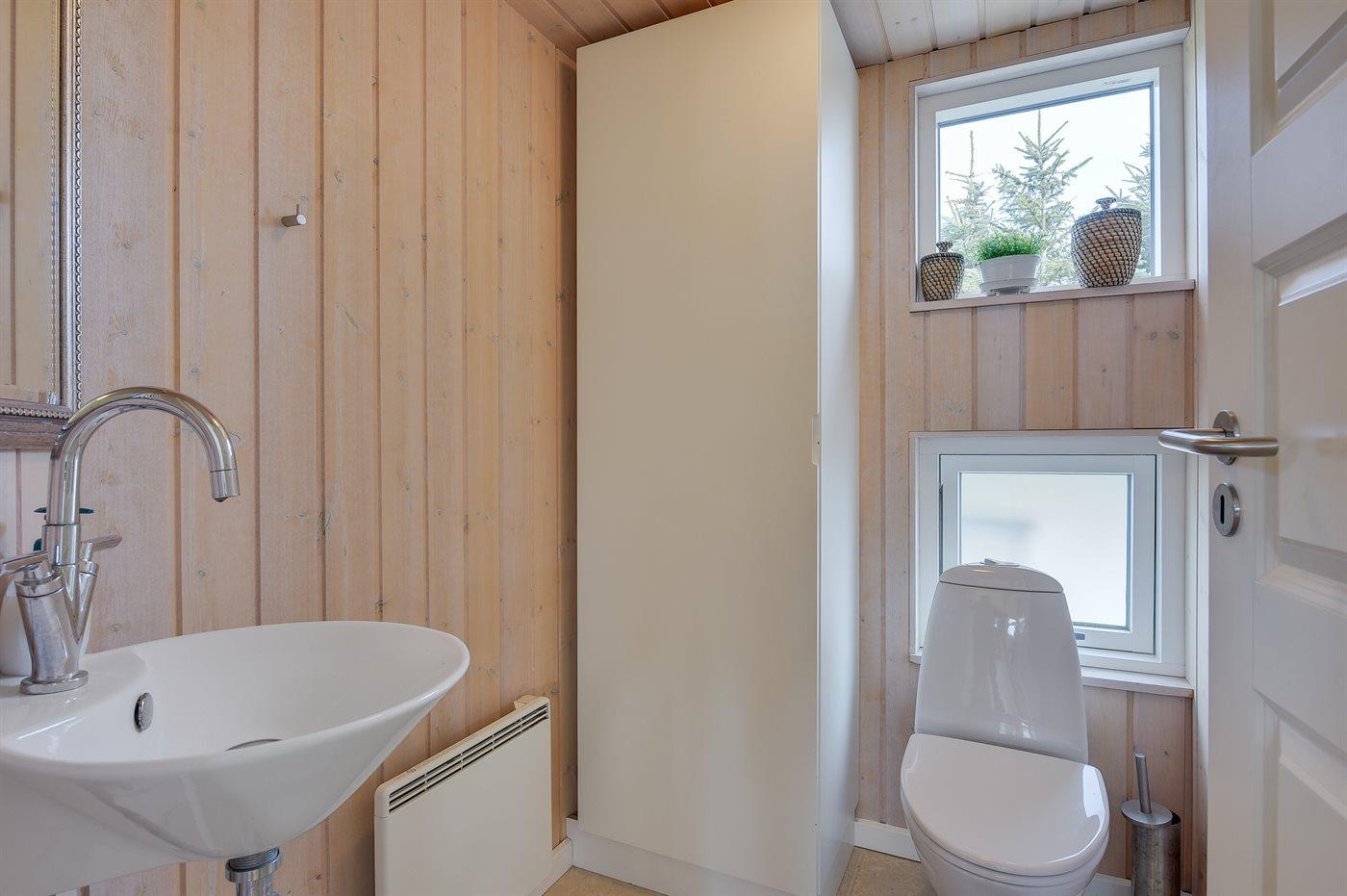Der er 1 badeværelse med bruseniche og 2 toiletter, heraf 1 gæstetoilet I saunaen er der mulighed for afslapning.