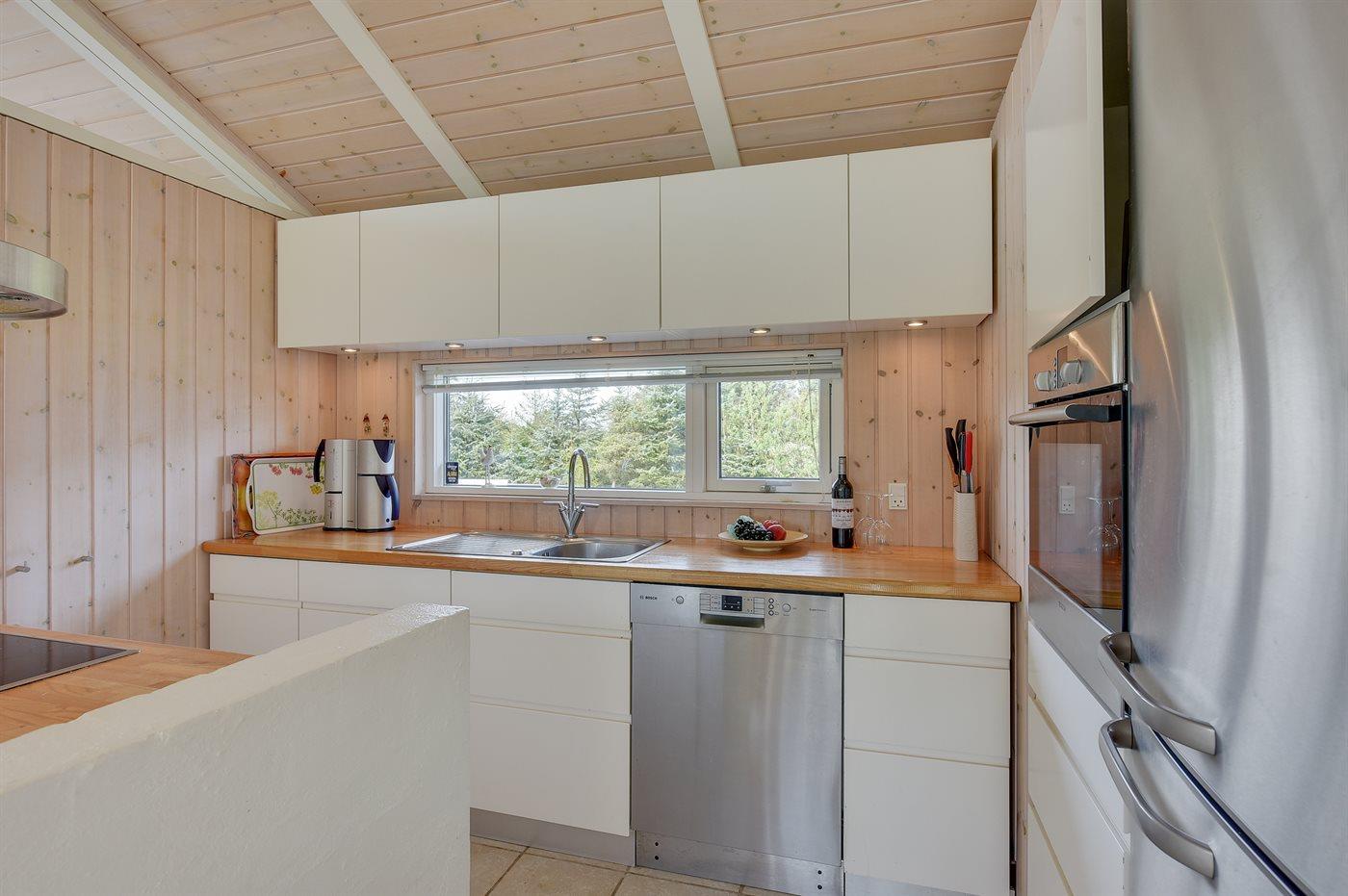 Køkkenet er udstyret med 1 køleskab. Der er 4 keramiske kogeplader, varmluftovn, mikrobølgeovn samt opvaskemaskine.