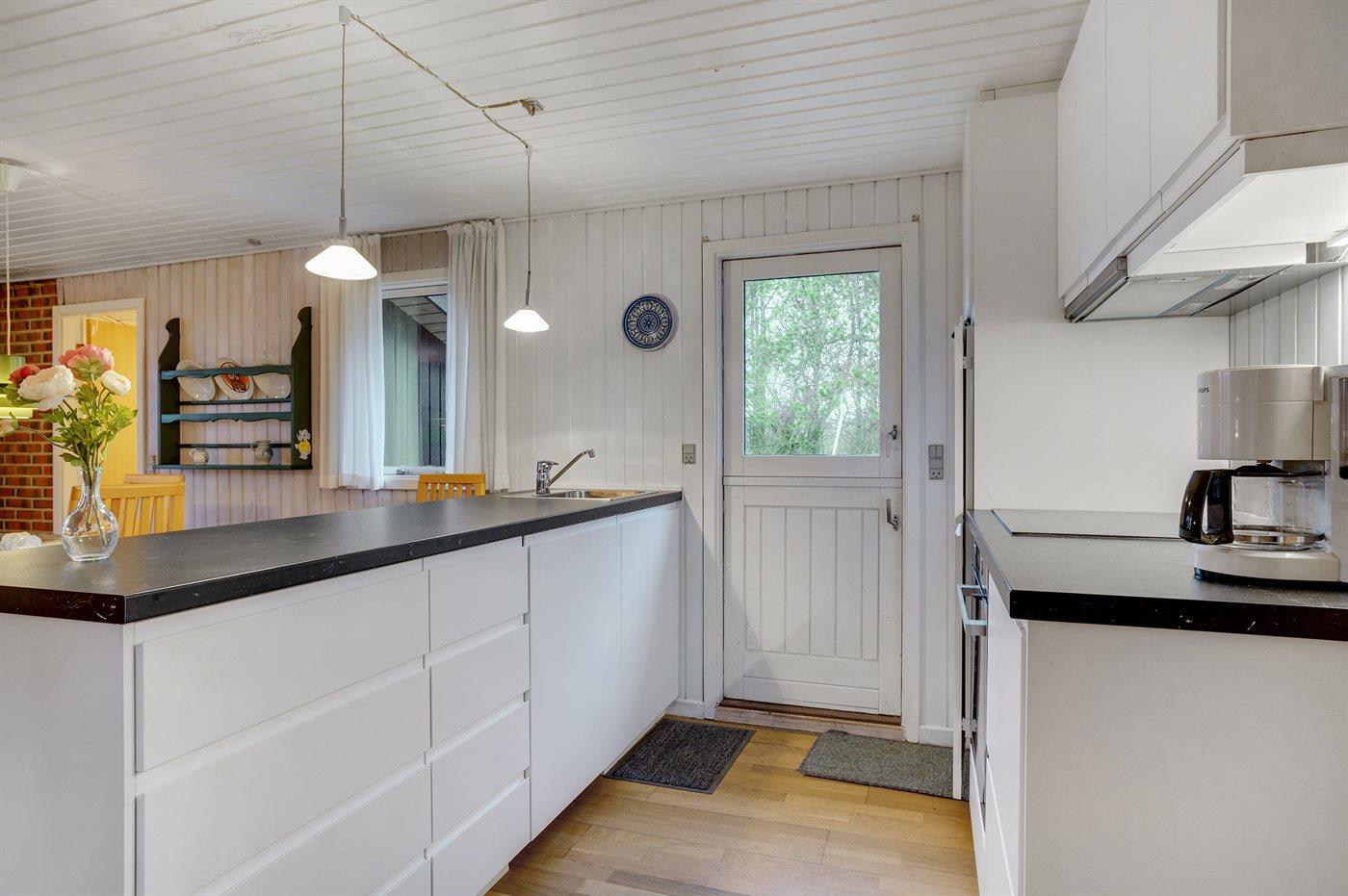 Køkkenet er udstyret med 1 køleskab. Der er 4 keramiske kogeplader, varmluftovn, mikrobølgeovn samt opvaskemaskine.